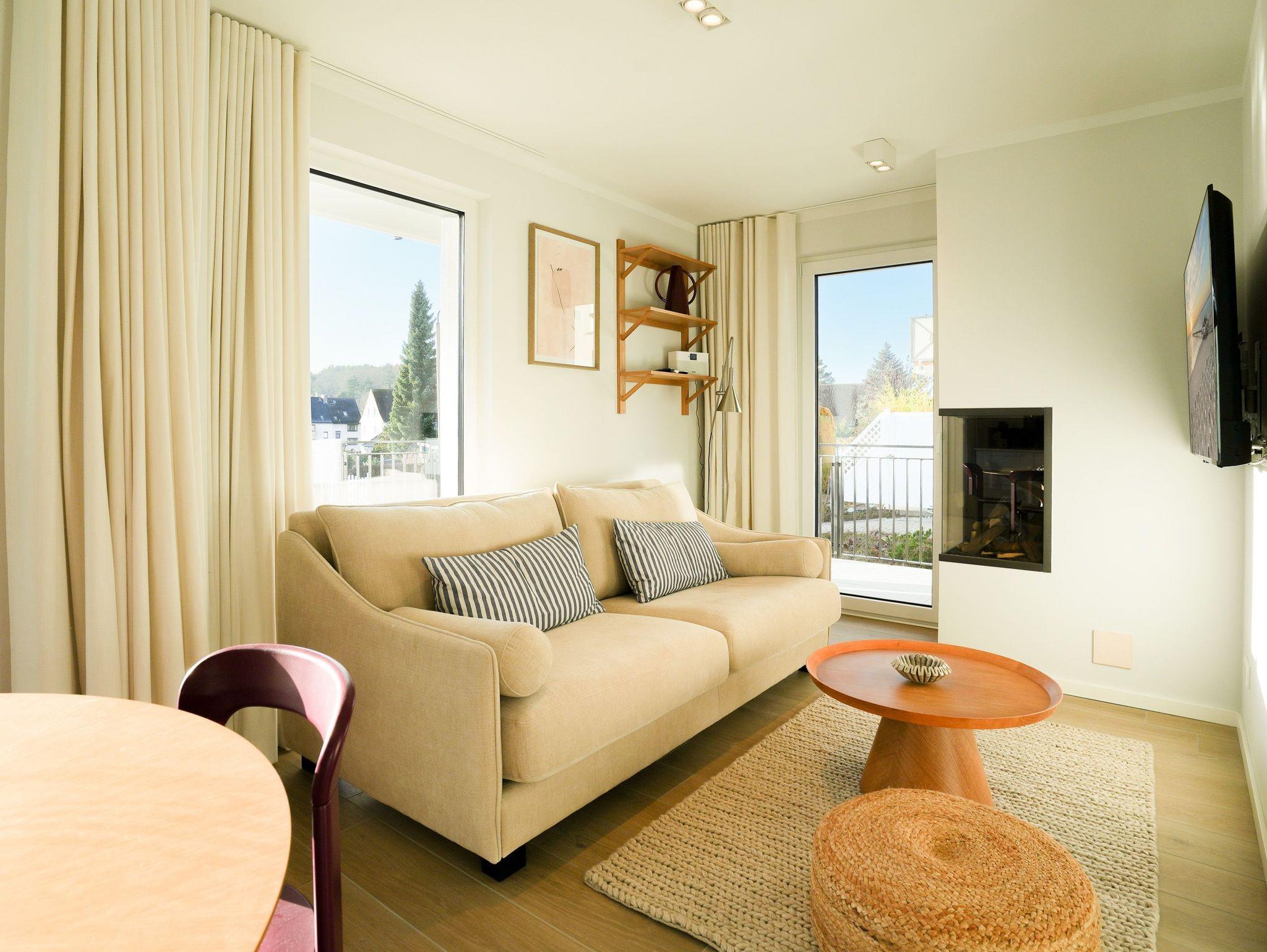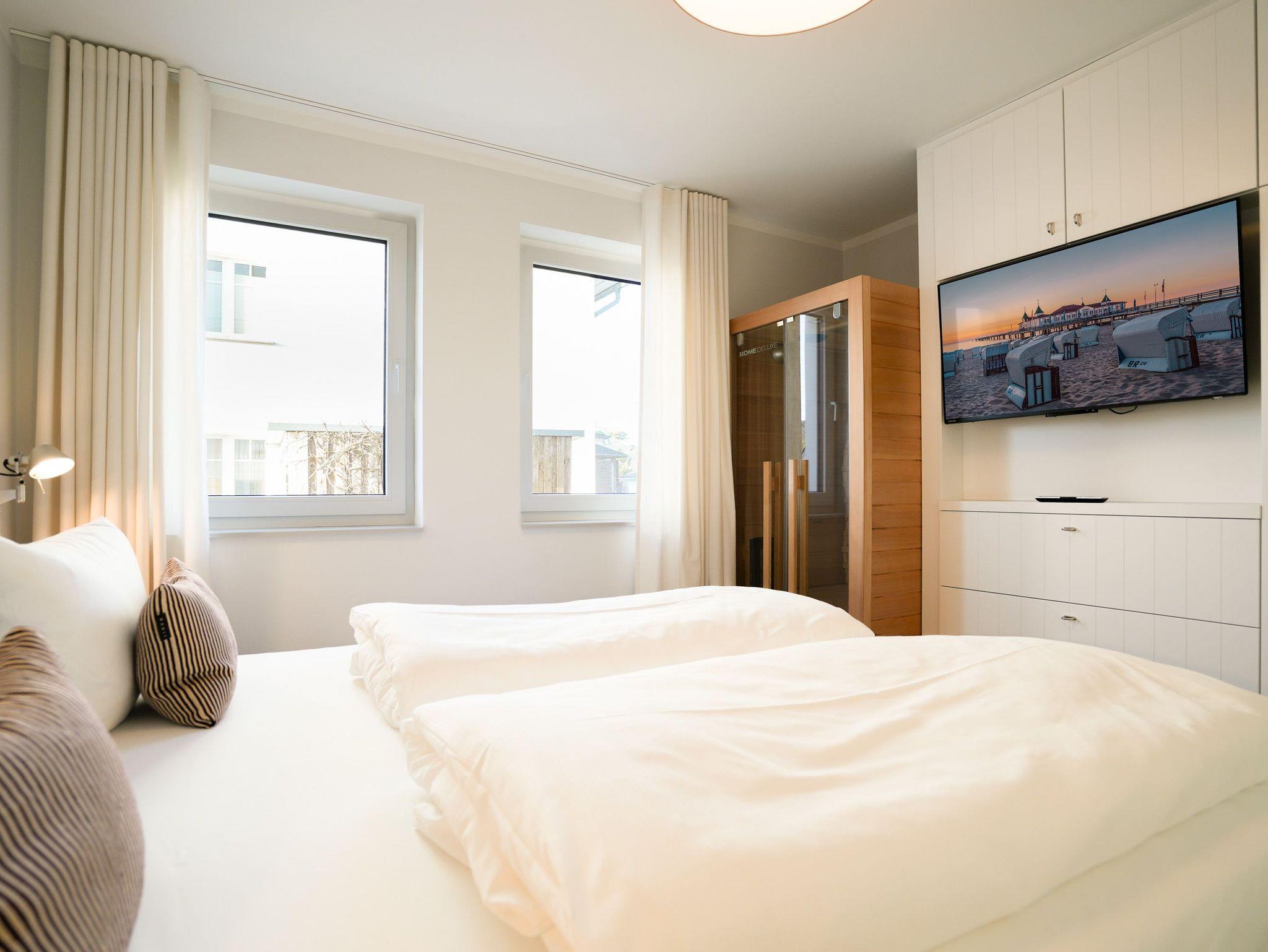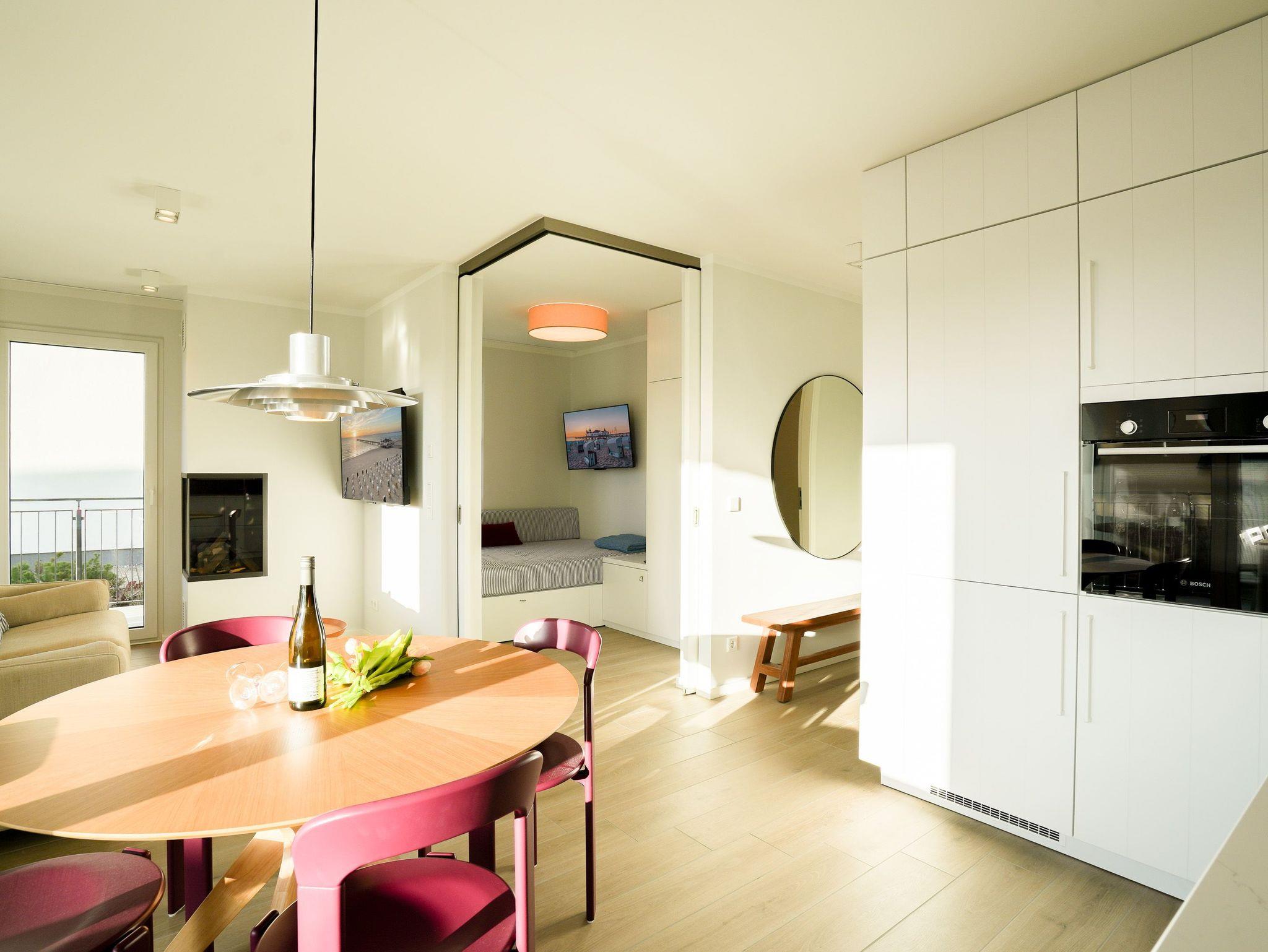 Im Hochparterre der eleganten Villa Kamadori empfängt Sie dieses stilvolle 3-Raum-Appartement mit 54 Quadratmetern Wohnfläche ? perfekt für zwei bis vier Personen sowie ein Kleinkind im Babyreisebett. Der helle, offen gestaltete Wohnbereich mit gemütlicher Sitzgruppe, Gas-Kamin (Fernbedienung) und Flat-TV lädt zu entspannten Stunden ein. Die moderne Küchenzeile ist mit Induktionsherd, Backofen, Spülmaschine, Senseo-Kaffeepadmaschine und Kühlschrank mit Gefrierfach vollständig ausgestattet und wird durch einen integrierten Essplatz harmonisch ergänzt. Von hier aus öffnet sich der Zugang auf den großzügigen Süd-West-Balkon mit etwa 25 Quadratmetern Fläche ? ein herrlicher Ort, um die Sonne bis in die Abendstunden zu genießen oder den Tag bei einem Glas Wein ausklingen zu lassen. Das Hauptschlafzimmer bietet mit einem komfortablen Boxspringbett (180 x 200 cm), Kleiderschrank, Flat-TV und einer privaten Infrarot-Saunakabine den idealen Rückzugsort zum Erholen. Das zweite Schlafzimmer verfügt über ein Doppelbett (140 x 200 cm), Kleiderschrank und Flat-TV; durch Schiebetüren kann es wahlweise offen in den Wohnraum integriert oder abgetrennt werden ? flexibel je nach Bedarf und Stimmung. Das moderne Duschbad mit Waschtisch und WC rundet den gepflegten Gesamteindruck ab. Ein Stellplatz in der Tiefgarage (Durchfahrthöhe 1,95m) steht Ihnen selbstverständlich zur Verfügung.