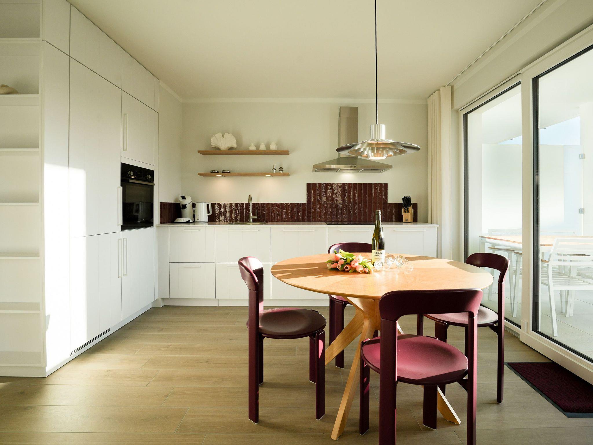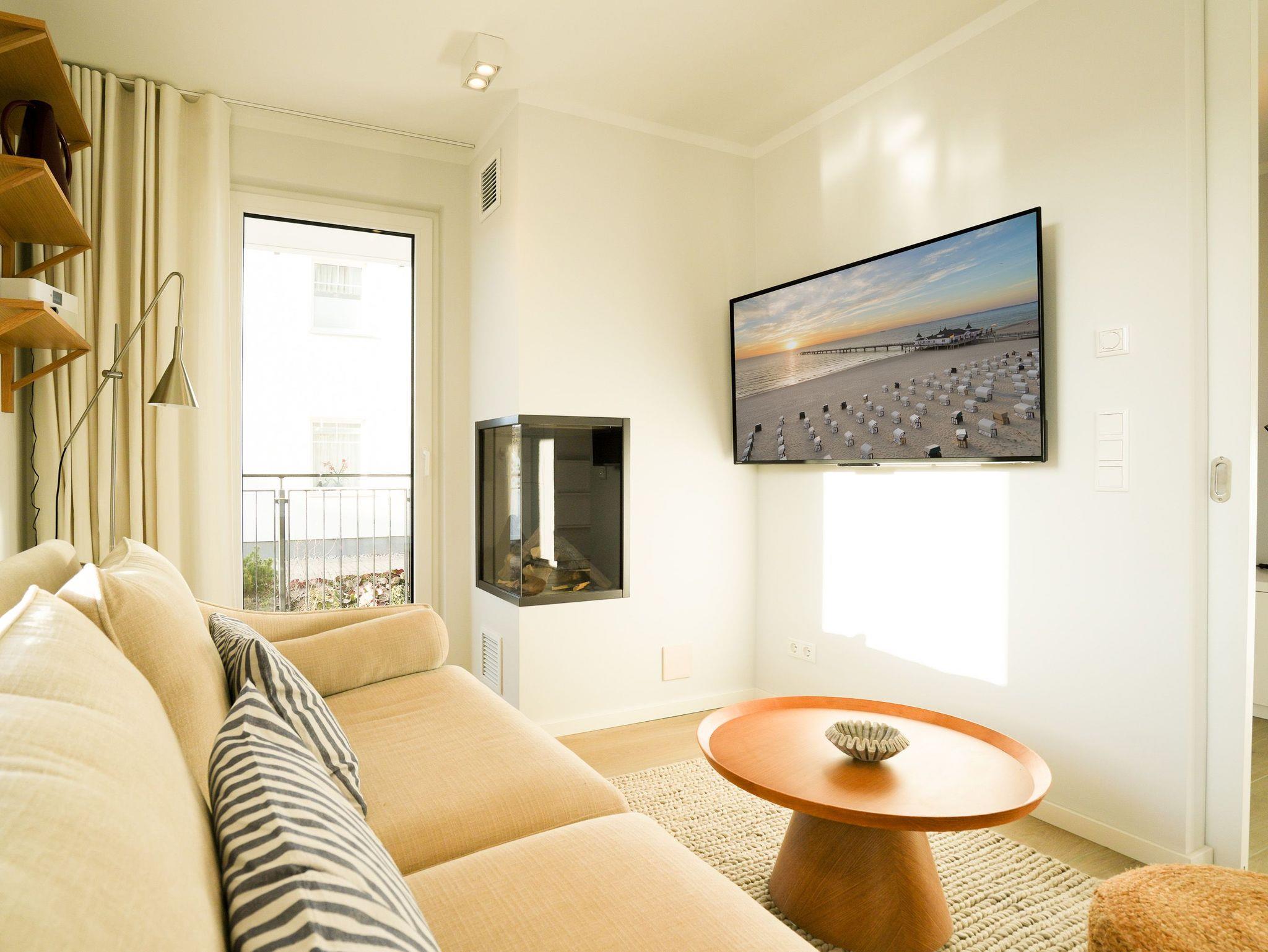 Im Hochparterre der eleganten Villa Kamadori empfängt Sie dieses stilvolle 3-Raum-Appartement mit 54 Quadratmetern Wohnfläche perfekt für zwei bis vier Personen sowie ein Kleinkind im Babyreisebett. Der helle, offen gestaltete Wohnbereich mit gemütlicher Sitzgruppe, Gas-Kamin (Fernbedienung) und Flat-TV lädt zu entspannten Stunden ein. Die moderne Küchenzeile ist mit Induktionsherd, Backofen, Spülmaschine, Senseo-Kaffeepadmaschine und Kühlschrank mit Gefrierfach vollständig ausgestattet und wird durch einen integrierten Essplatz harmonisch ergänzt. Von hier aus öffnet sich der Zugang auf den großzügigen Süd-West-Balkon mit etwa 25 Quadratmetern Fläche ein herrlicher Ort, um die Sonne bis in die Abendstunden zu genießen oder den Tag bei einem Glas Wein ausklingen zu lassen. Das Hauptschlafzimmer bietet mit einem komfortablen Boxspringbett (180 x 200 cm), Kleiderschrank, Flat-TV und einer privaten Infrarot-Saunakabine den idealen Rückzugsort zum Erholen. Das zweite Schlafzimmer verfügt über ein Doppelbett (140 x 200 cm), Kleiderschrank und Flat-TV; durch Schiebetüren kann es wahlweise offen in den Wohnraum integriert oder abgetrennt werden flexibel je nach Bedarf und Stimmung. Das moderne Duschbad mit Waschtisch und WC rundet den gepflegten Gesamteindruck ab. Ein Stellplatz in der Tiefgarage (Durchfahrthöhe 1,95m) steht Ihnen selbstverständlich zur Verfügung.