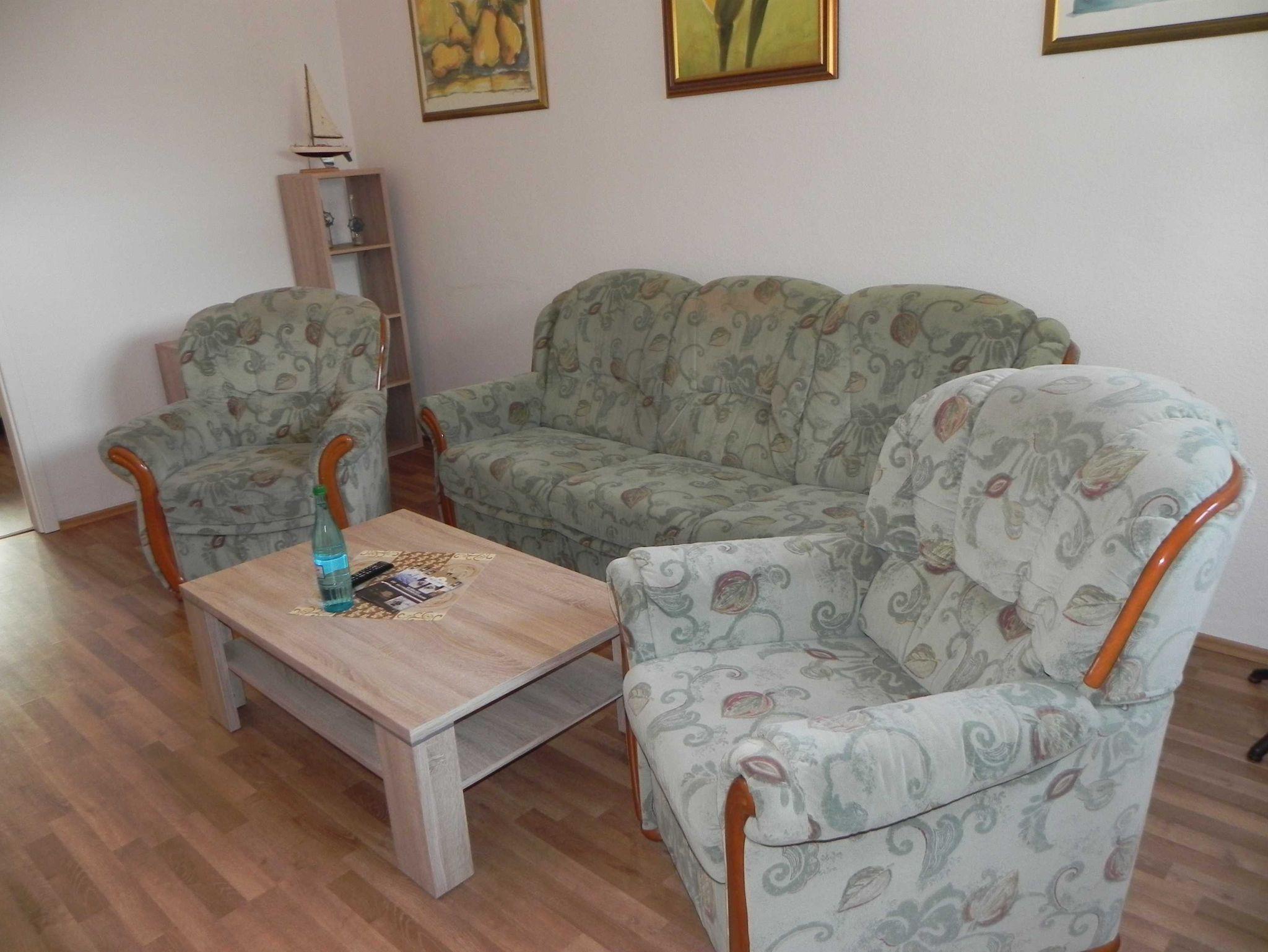 Die ca. 90 qm große Ferienwohnung befindet sich im Obergeschoss und ist über eine separate Außentreppe zu erreichen. Die Wohnung ist mit einem Wohnbereich mit Couch und Sesseln, einer kompletten Küche mit Backofen, Herd, Spülmaschine, Kühlschrank u.v.m., einem großen Essplatz und TV ausgestattet. Die Schlafzimmer verfügen zum Einem über ein Doppelbett, zum anderen über ein Doppelbett und ein Einzelbett. Zwei weitere Aufbettungsmöglichkeiten im Wohnbereich auf der Couch möglich. Zwei Bäder mit Dusche und WC.
