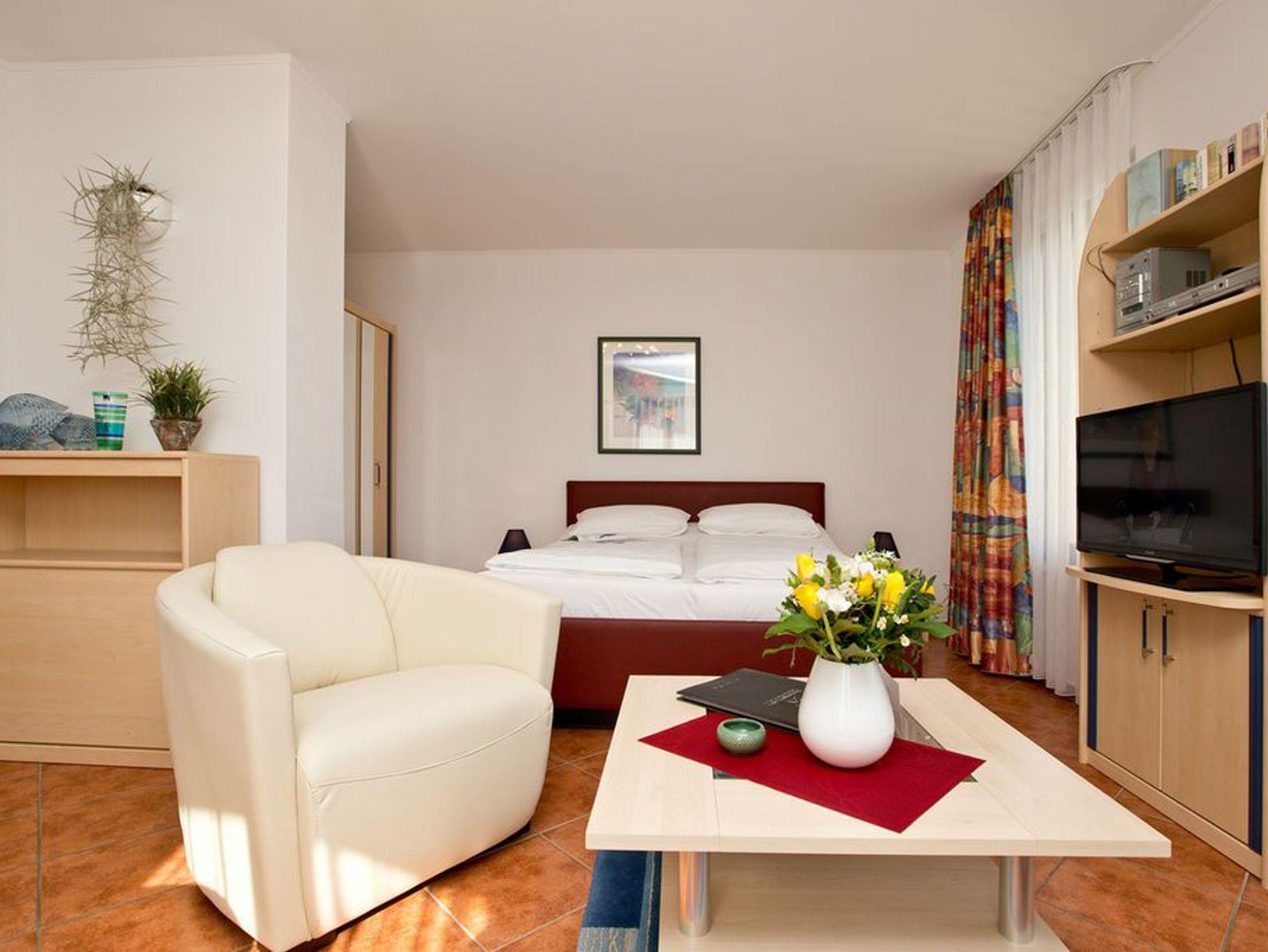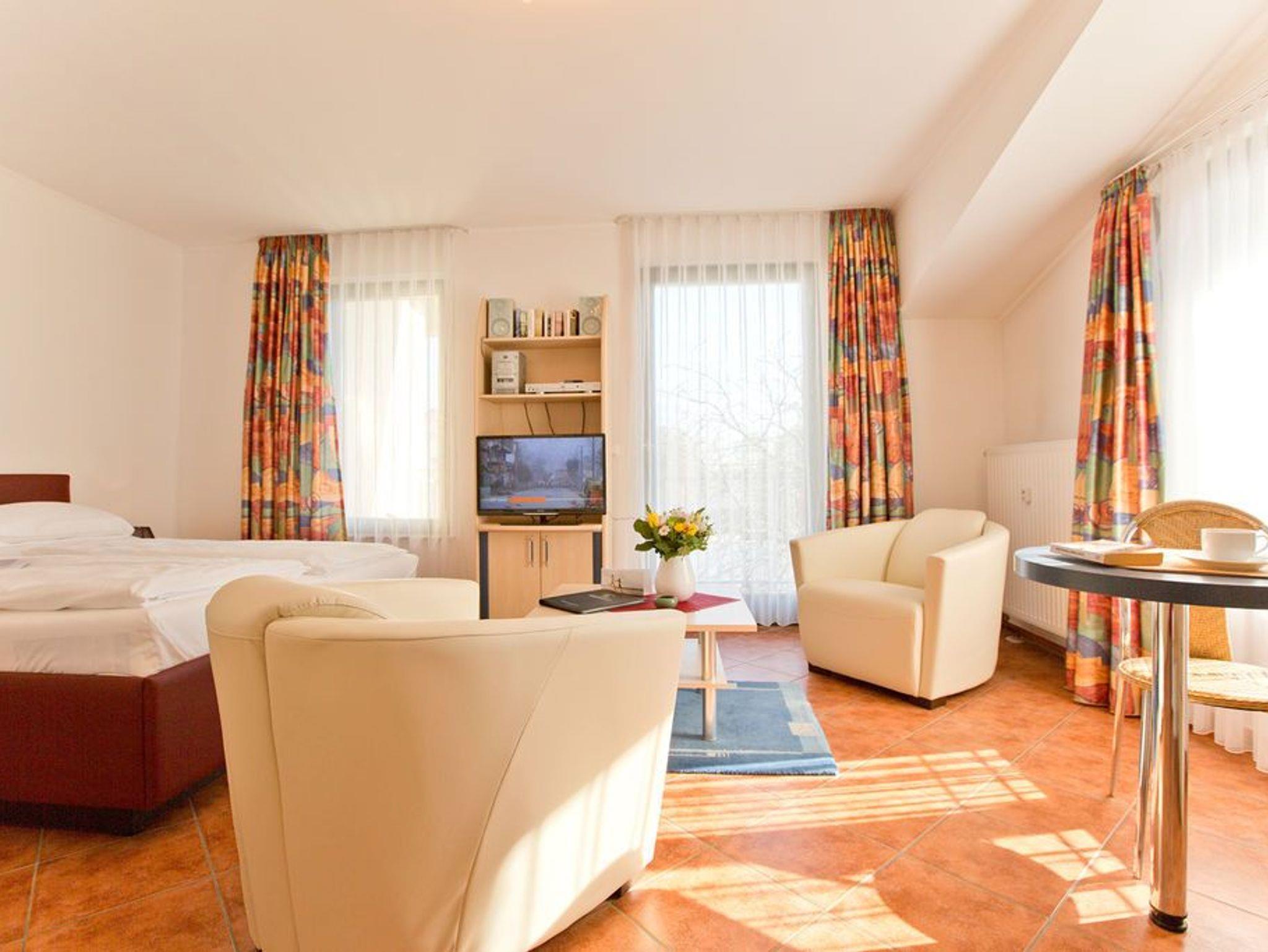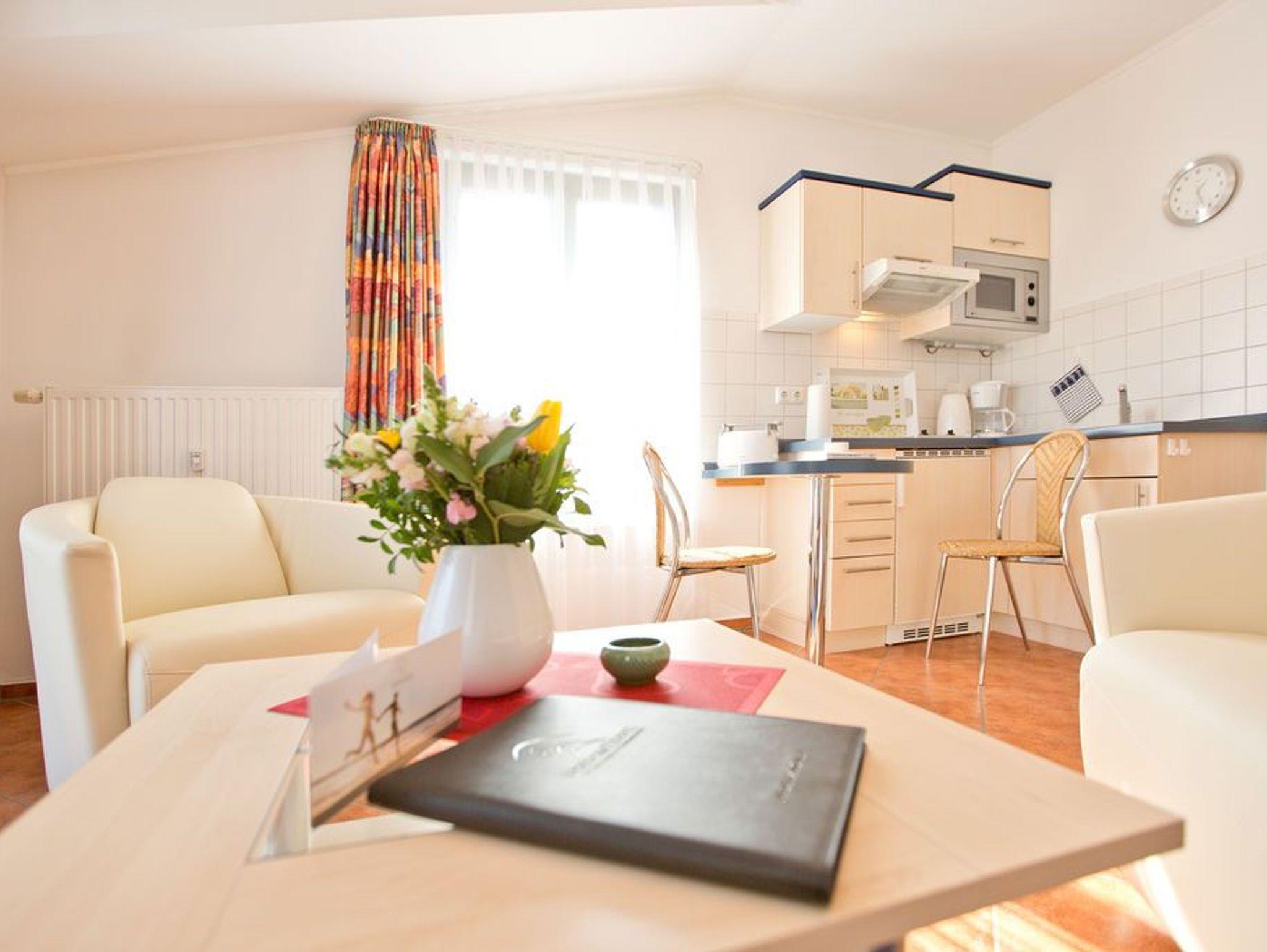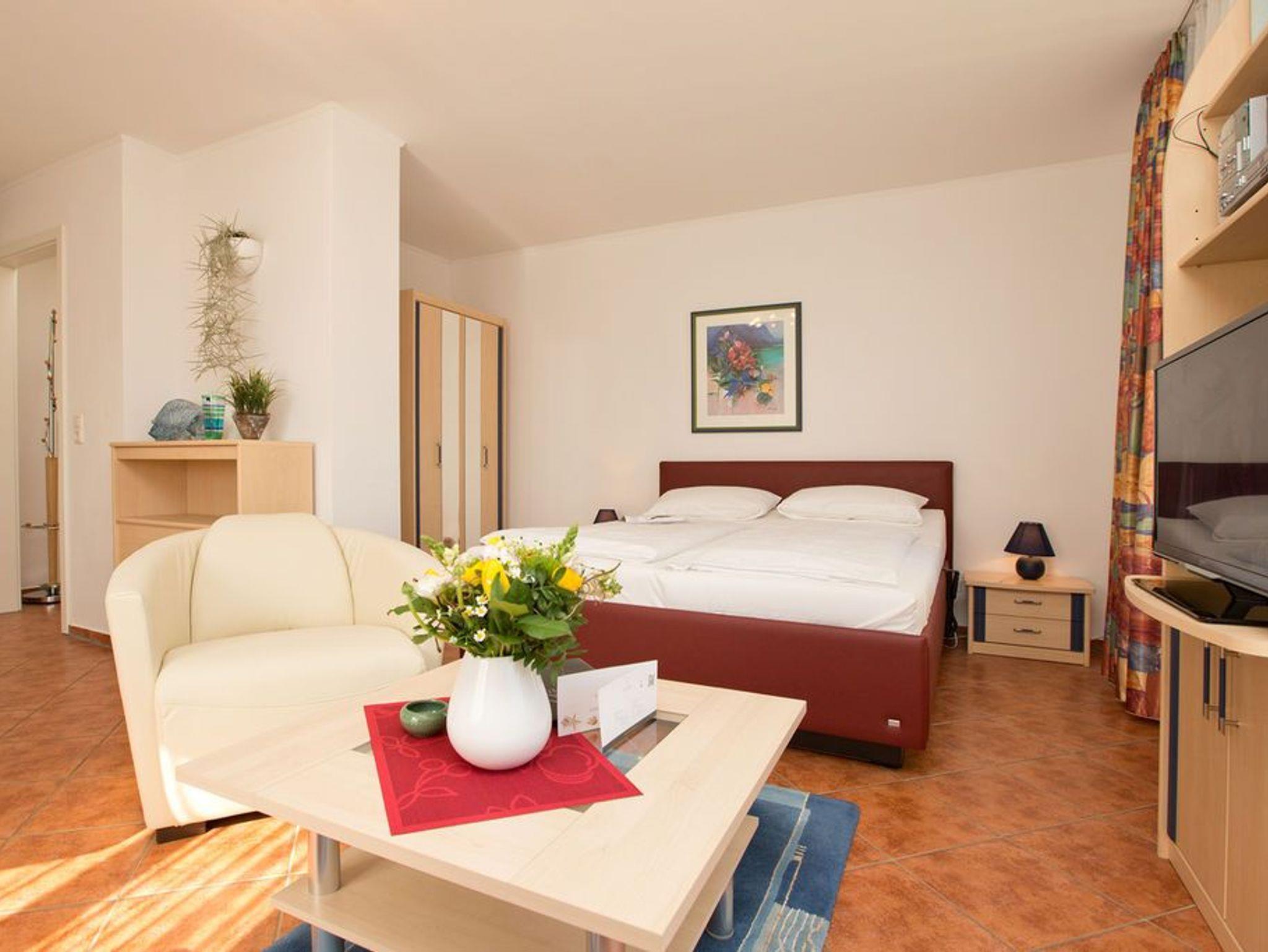 Diese geschmackvoll eingerichtete 1-Raum-Ferienwohnung mit rund 30 qm liegt im Obergeschoss der Villa Goodewind. Der offene Wohnbereich verbindet Wohnen, Schlafen und Kochen auf angenehme Weise. Die gut ausgestattete Küchenzeile bietet alles für die Selbstversorgung, das bequeme Bett sorgt für erholsame Nächte. Das Bad ist mit Dusche und WC ausgestattet. Auf dem Balkon lässt sich der Tag mit einem Frühstück in der Morgensonne beginnen. WLAN steht im Haus kostenfrei zur Verfügung, ein Parkplatz befindet sich direkt am Haus.