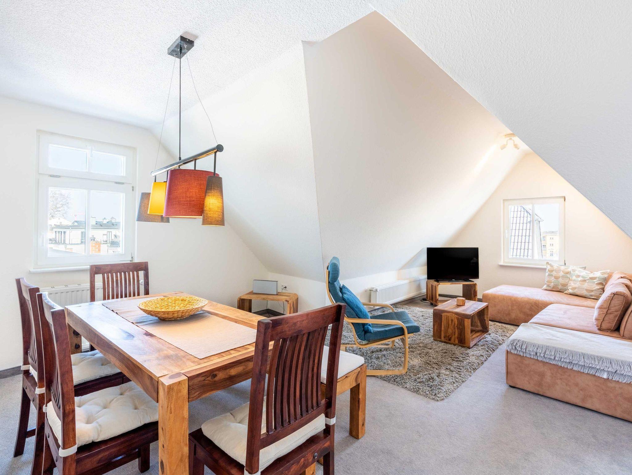 Die im Dachgeschoss (2.OG) liegende Ferienwohnung bietet Platz für 4 - 6 Personen, zwei Schlafzimmer, einen großen Wohn- und Essbereich, eine vollausgestattete Küche und ein Badezimmer mit Dusche/WC.