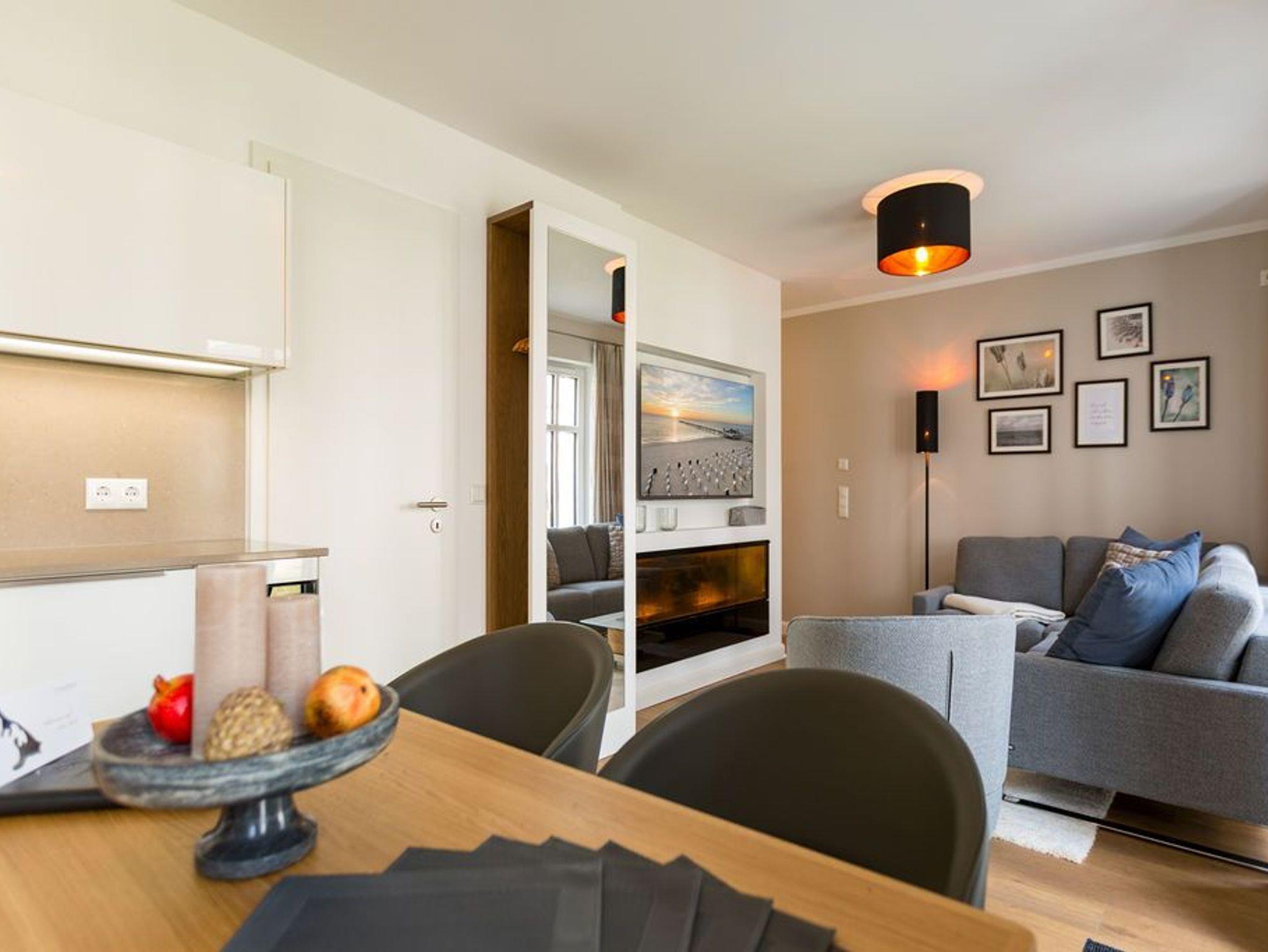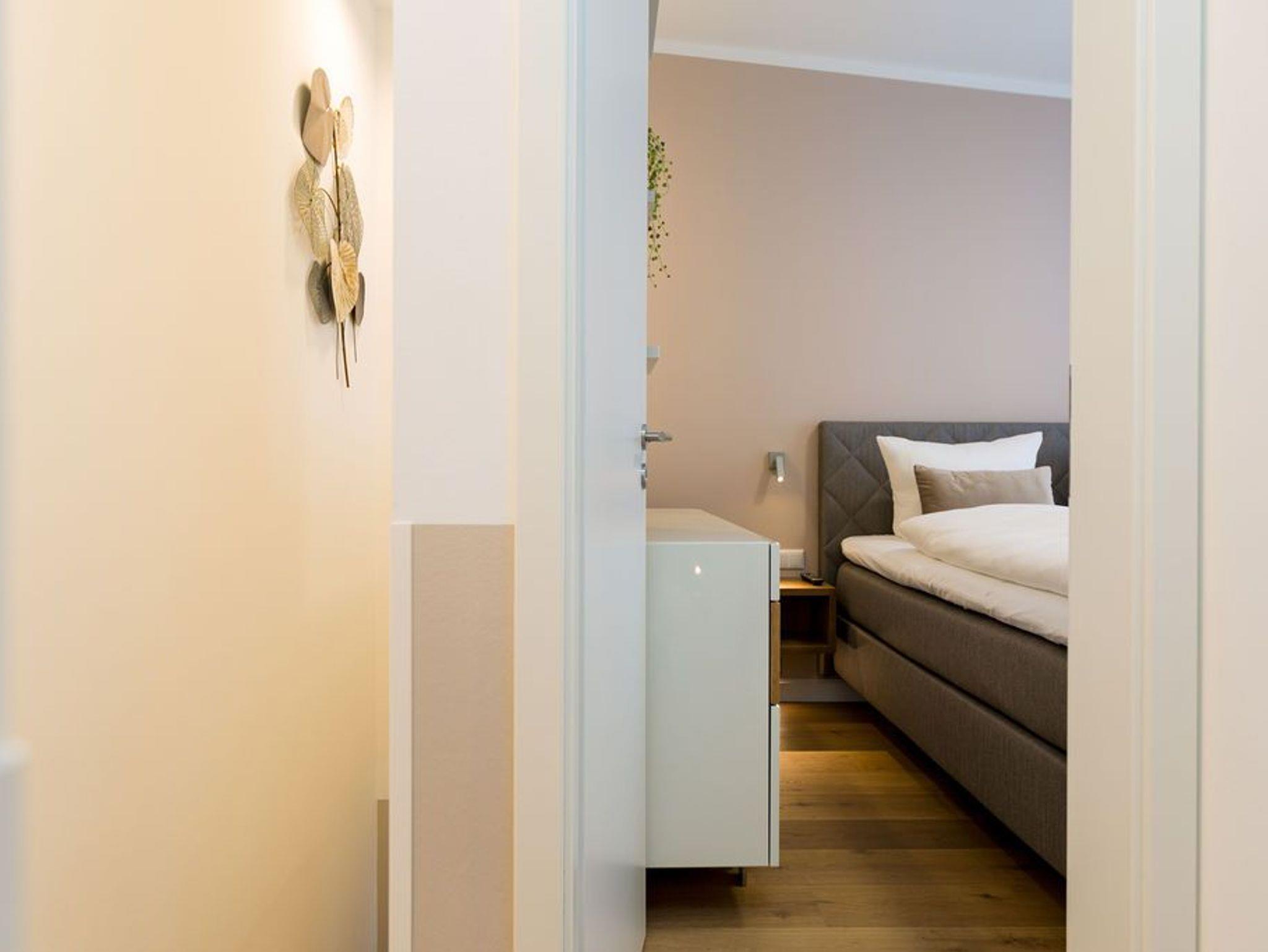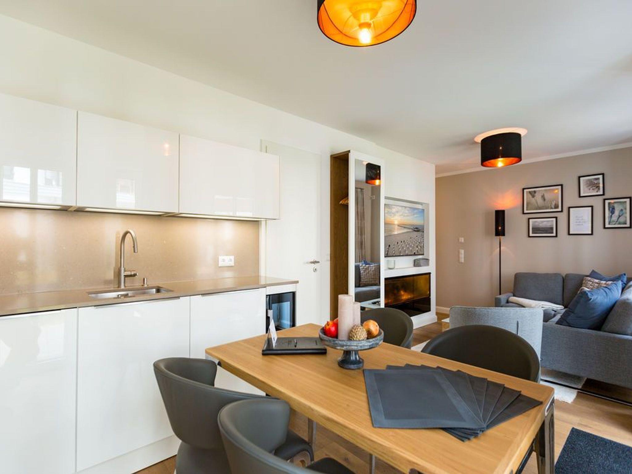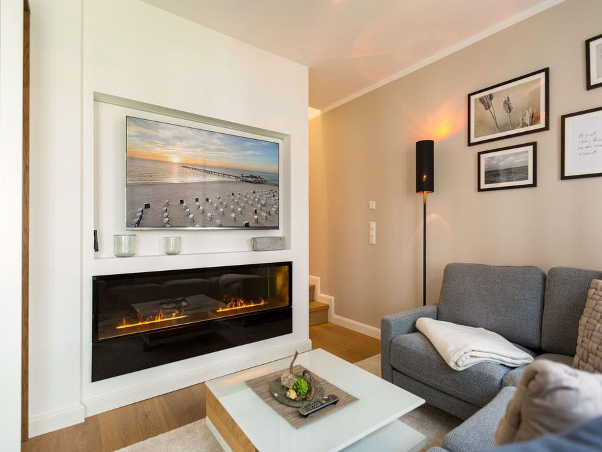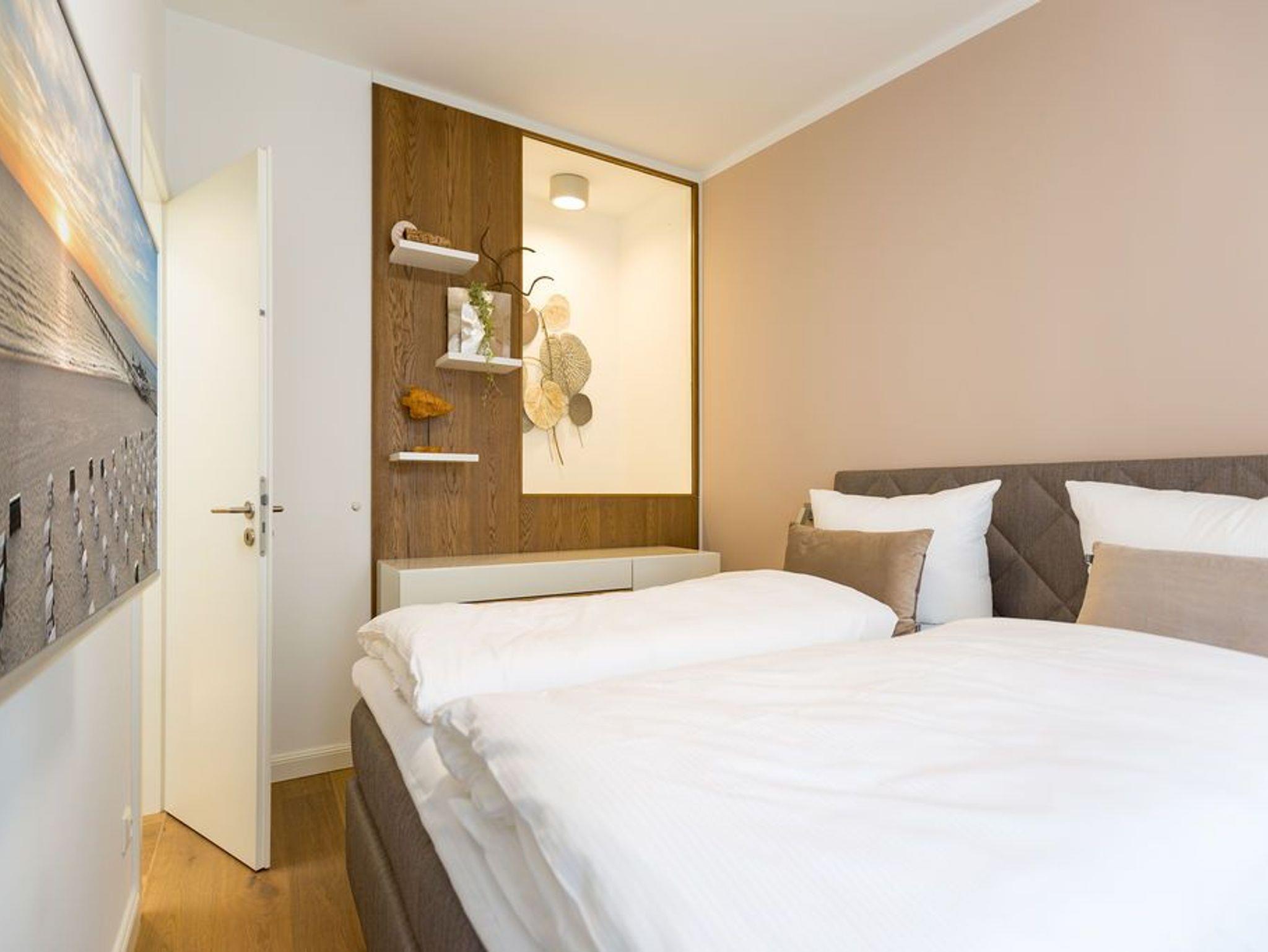 Kommen Sie rein! ?in dieses wunderschöne, 66 Quadratmeter große Urlaubsparadies. Das kleine Studio für bis zu vier Personen wartet nur darauf, auf seinen zwei Etagen Ihre Urlaubsträume wahr werden zu lassen. Über eine Sonnenterrasse mit Gartenmöbeln und großem Sonnenschirm betreten Sie das geräumige und geschmackvoll eingerichtete Wohn-Esszimmer. Eine offene Wohnküche mit allem Schnick und Schnack, hochwertigen Geräten und erlesenem Geschirr schließt sich dem Wohnbereich im Erdgeschoss an. Absolutes Highlight des Wohnzimmers sind nicht die großen, bodentiefen Fenster, die viel Licht einlassen, oder die bequeme Sofalandschaft mit Couch und Sessel, der große Flat-TV oder der großzügige Esstisch. Es ist der riesige Elektro-Kamin, der per Knopfdruck eine romantische Atmosphäre zaubern kann. In den Accessoires wird die Liebe zum Detail sichtbar. Im Erdgeschoss erwartet Entspannungshungrige zudem ein kleiner Wellness-Himmel. Im Badezimmer gibt es neben einer Dusche und einem WC eine Finnische Sauna. Schietwetter-Tage? In diesem Appartement werden solche Tage zu den wahren Erholungstagen. Über eine Treppe geht?s ab in den 1. Stock. Zwei Schlafzimmer und ein Bad mit Dusche und WC sind Rückzugsorte ins Traum- und Kuschelland. Beide Schlafzimmer ? je nach Geschmack in frischem und in warmem Farbton gehalten ? verfügen über ein bequemes Boxspringdoppelbett (1,80 m x 2,00 m), einen geräumigen Schrank bzw. eine Kommode mit viel Ablageflächen und einen Flat-TV. In einem Abstellraum befindet sich eine Waschmaschine. Bei Anreise sind die Betten bereits bezogen und Handtücher liegen bereit. Der Tiefgaragenplatz Nummer 11 ist für Ihr Auto reserviert.