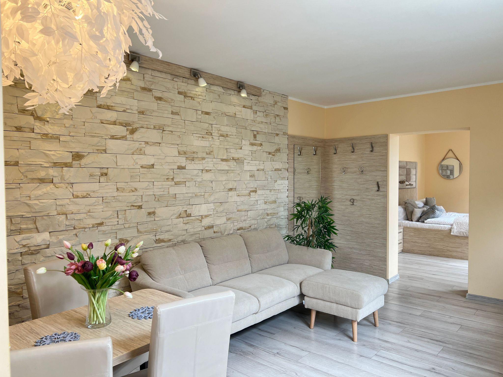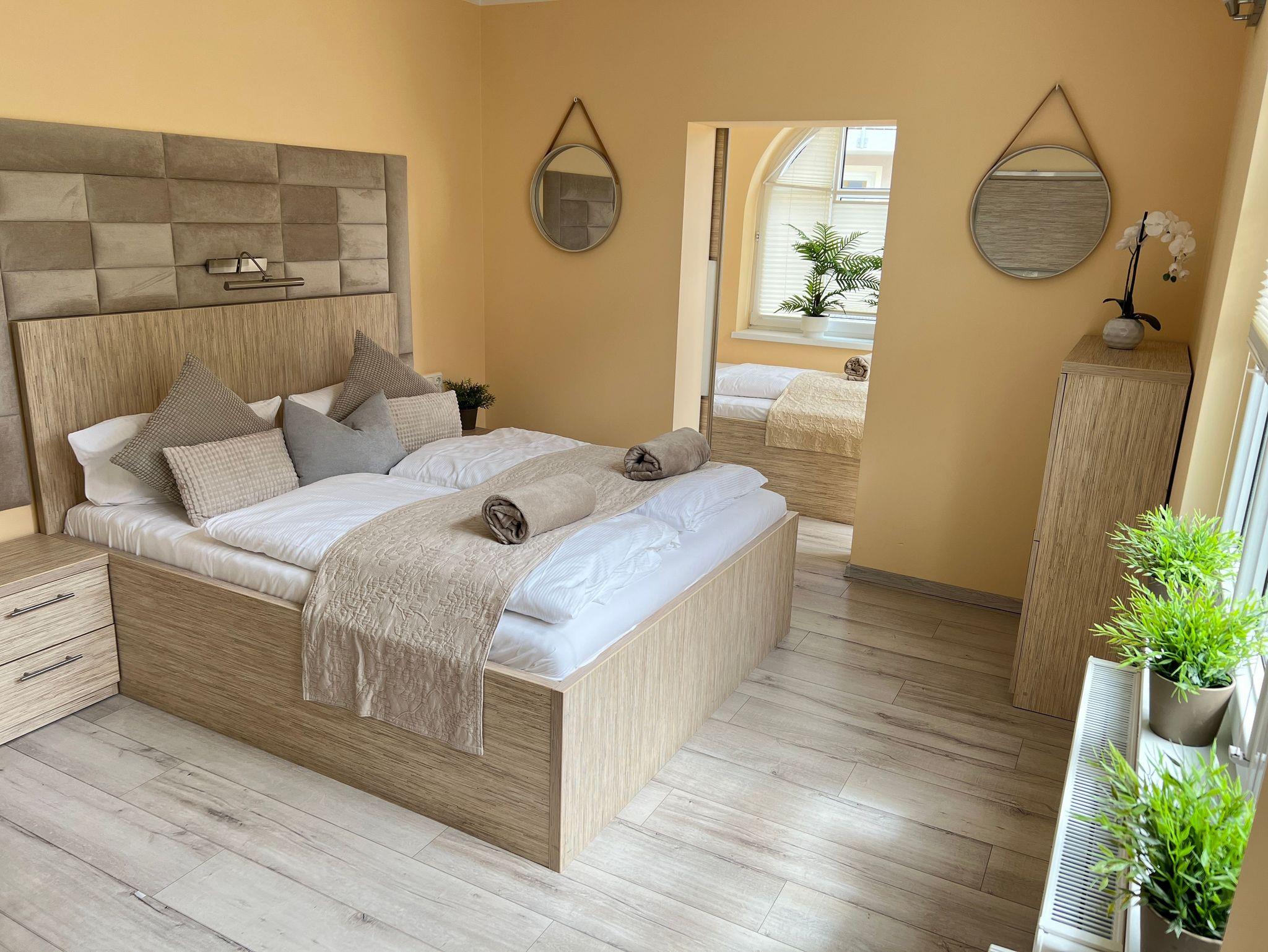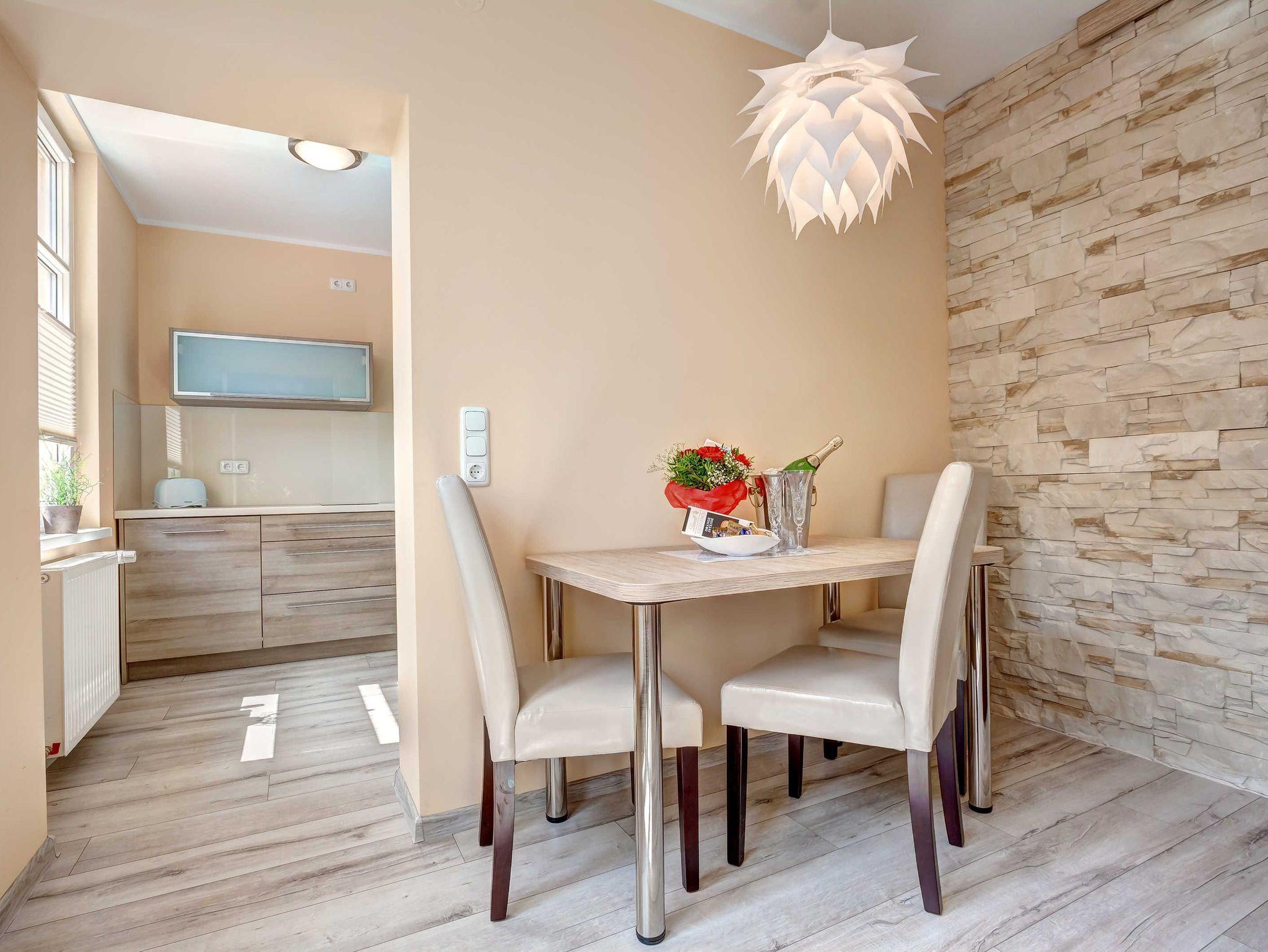 Die nur 80 Meter vom Strand entfernte Erdgeschosswohnung hat einen separaten Eingang. Sie ist besonders familienfreundlich und für Rollstuhlfahrer geeignet durch einen stufenlosen Zugang. Selbst die gesamte Ferienwohnung ist barrierefrei. Allergiker fühlen sich so wohl wie unsere Nichtraucher. In den Schlafzimmern befinden sich zwei extrahohe, bequeme Betten (160cm und 140cm). Selbstverständlich erwartet Sie eine komfortable Vollausstattung. Ansprechende Laminat- und Steinfliesenböden sorgen für Behaglichkeit und eine warme, heimische Atmosphäre. Die gesamte Ferienwohnung wird von einer Fußbodenheizung erwärmt. Im separaten Wohnzimmer steht Ihnen ein LED-SMART-TV, freier Internetzugang sowie eine moderne, grundausgestattete Einbauküche zur Verfügung. Ein Parkplatz direkt vor Ihrem Feriendomizil sorgt für kürzeste Wege. Weiße, kräftige Baumwollbettwäsche und weiche Handtücher werden Ihnen schmeicheln. Geschirrtücher sowie Duschvorleger sind ebenfalls vorhanden. Hochstühle und Kinderreisebetten können nach Rücksprache zur kostenlosen Nutzung bereitgestellt werden. Toilettenhalterung und behindertengerechte Duschhocker sind für unsere bedürftigen Gäste ebenfalls auf Anfrage inklusive. Jungen Familien und gehandicapten Personen werden sämtliche, barrierefreien Zugänge zum Strand, zur Seebrücke und der Ortschaft Ahlbeck sehr entgegenkommen.