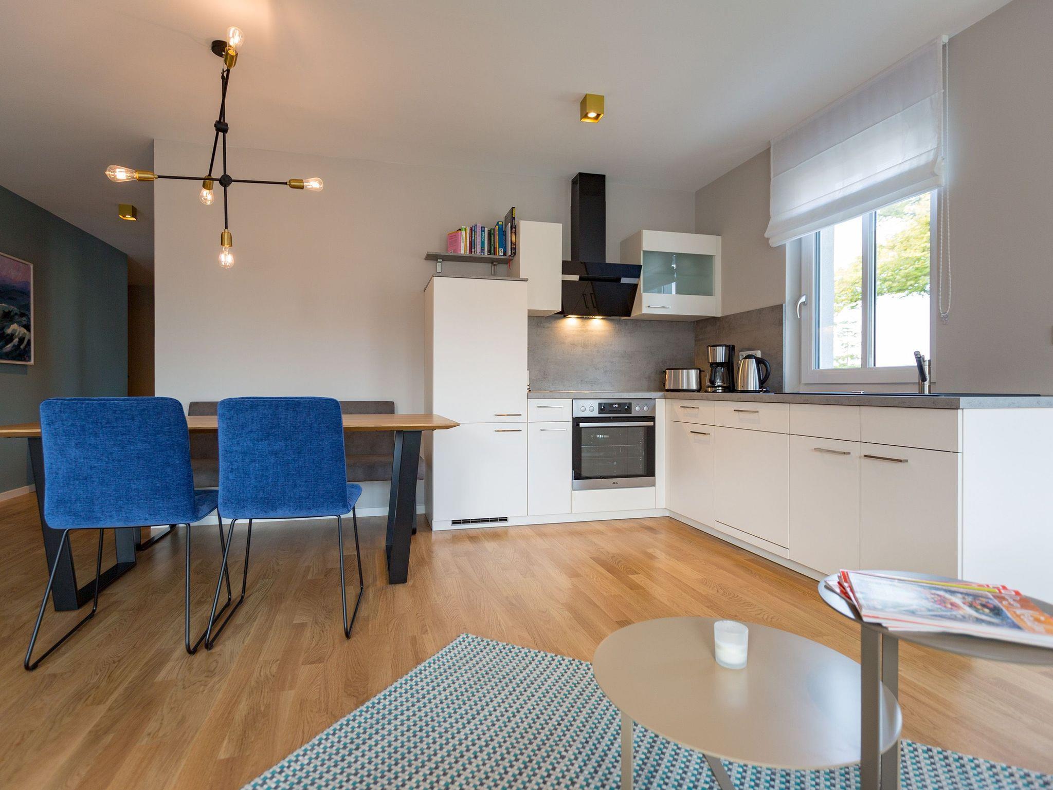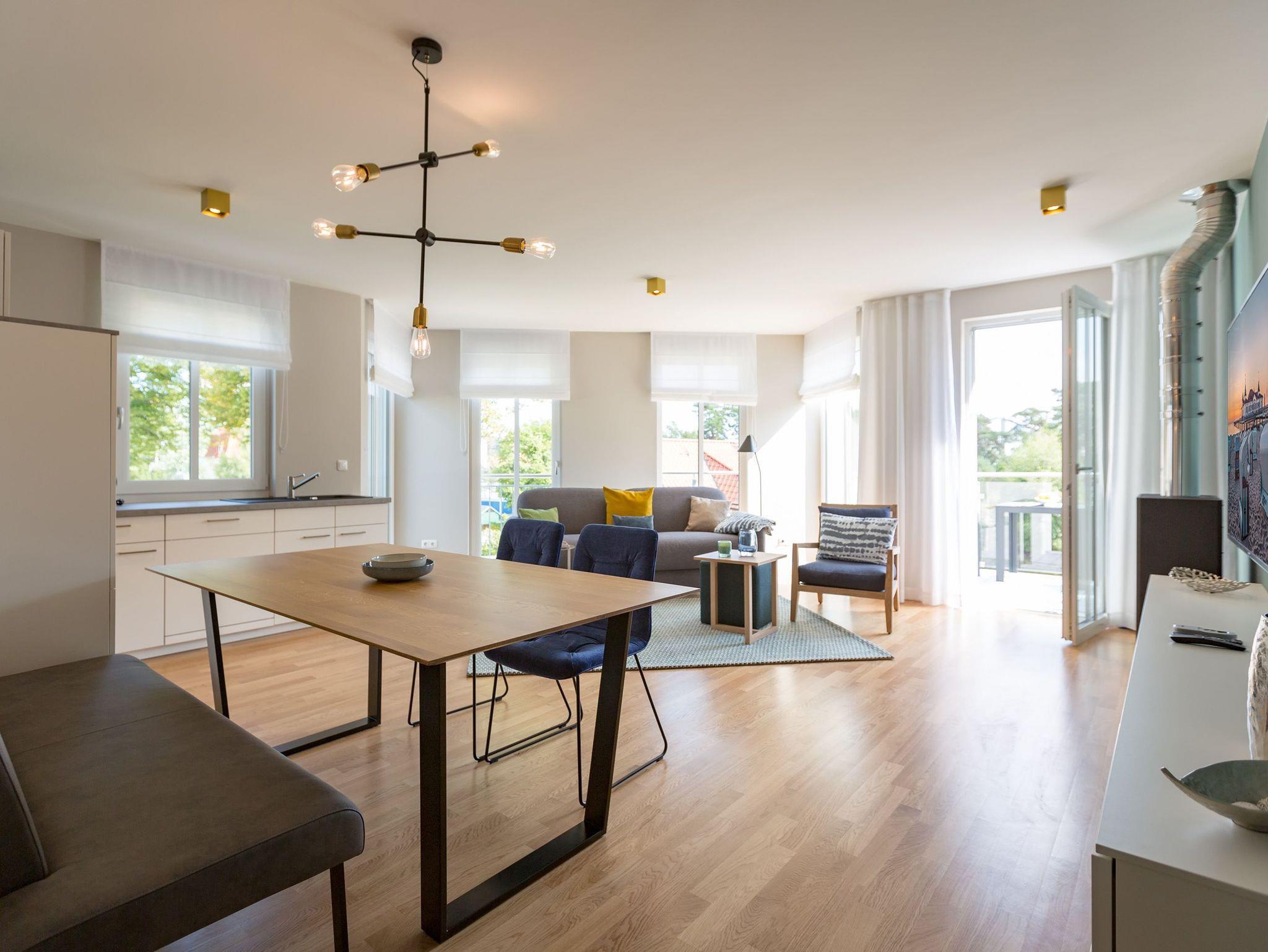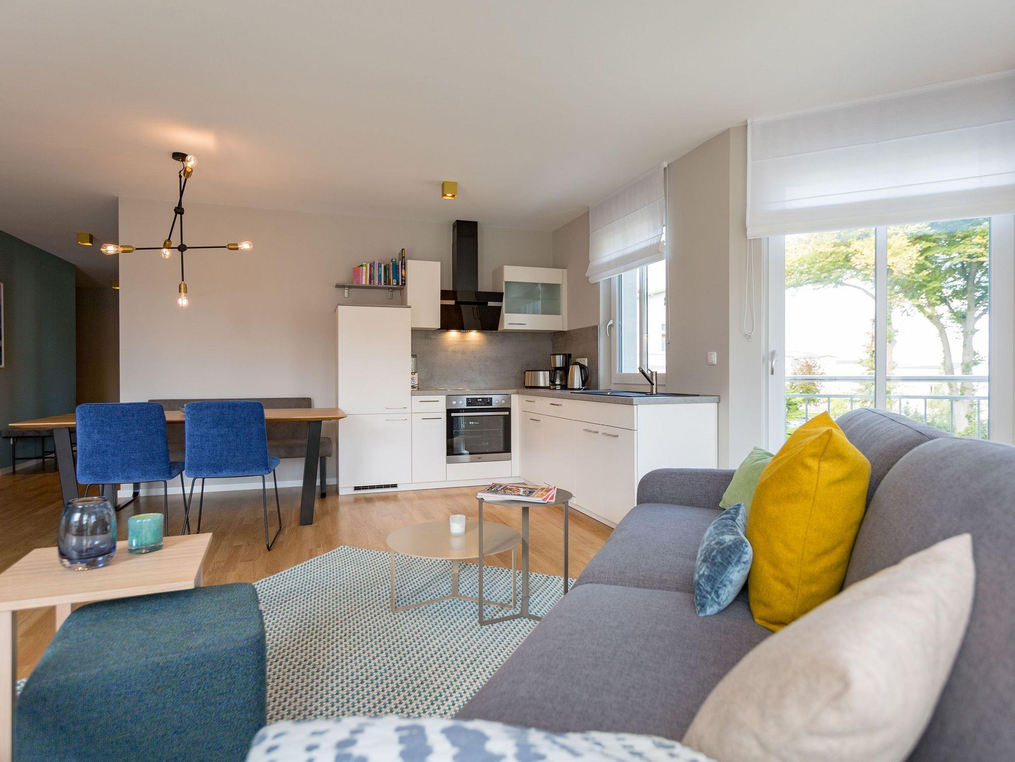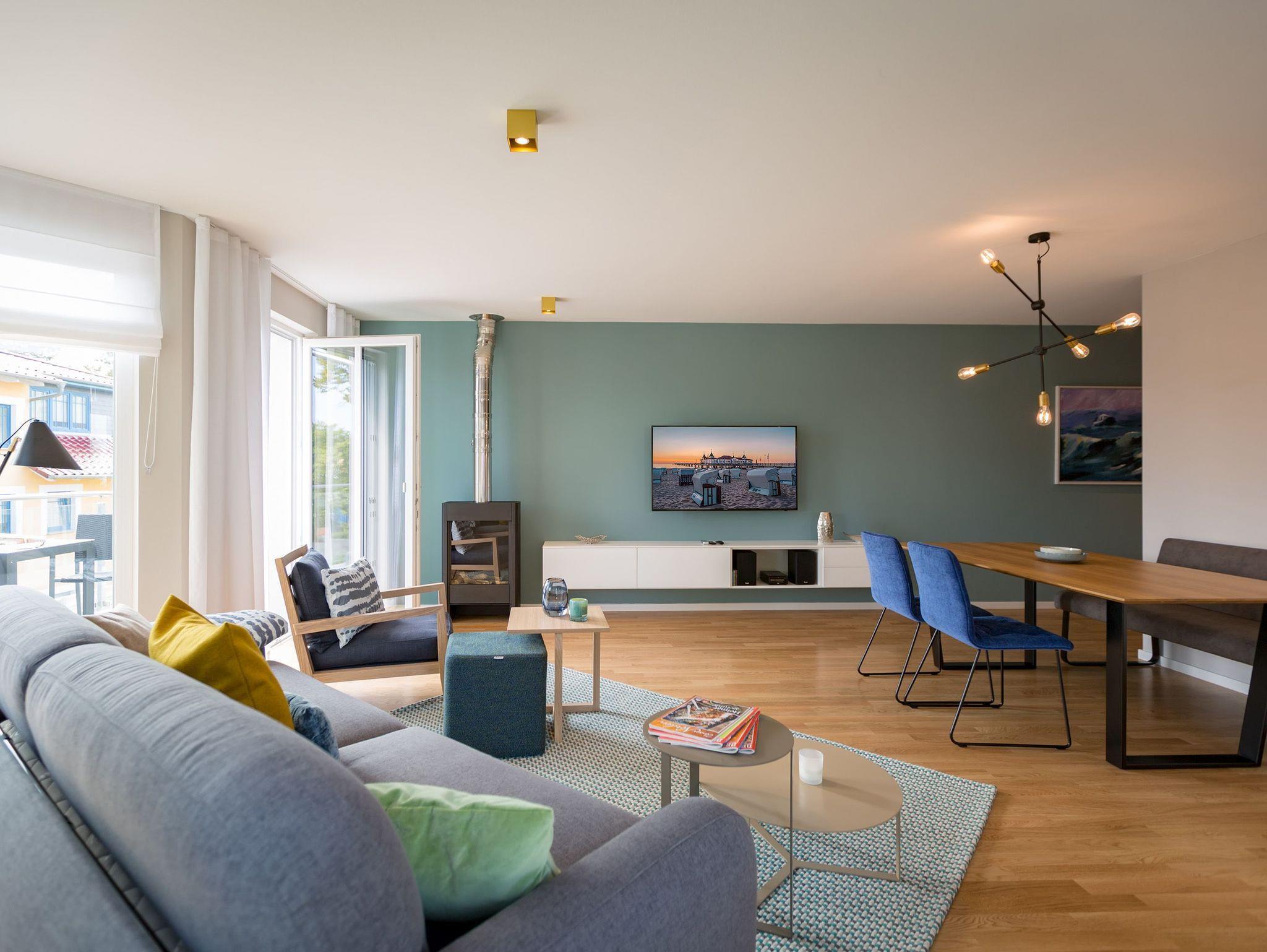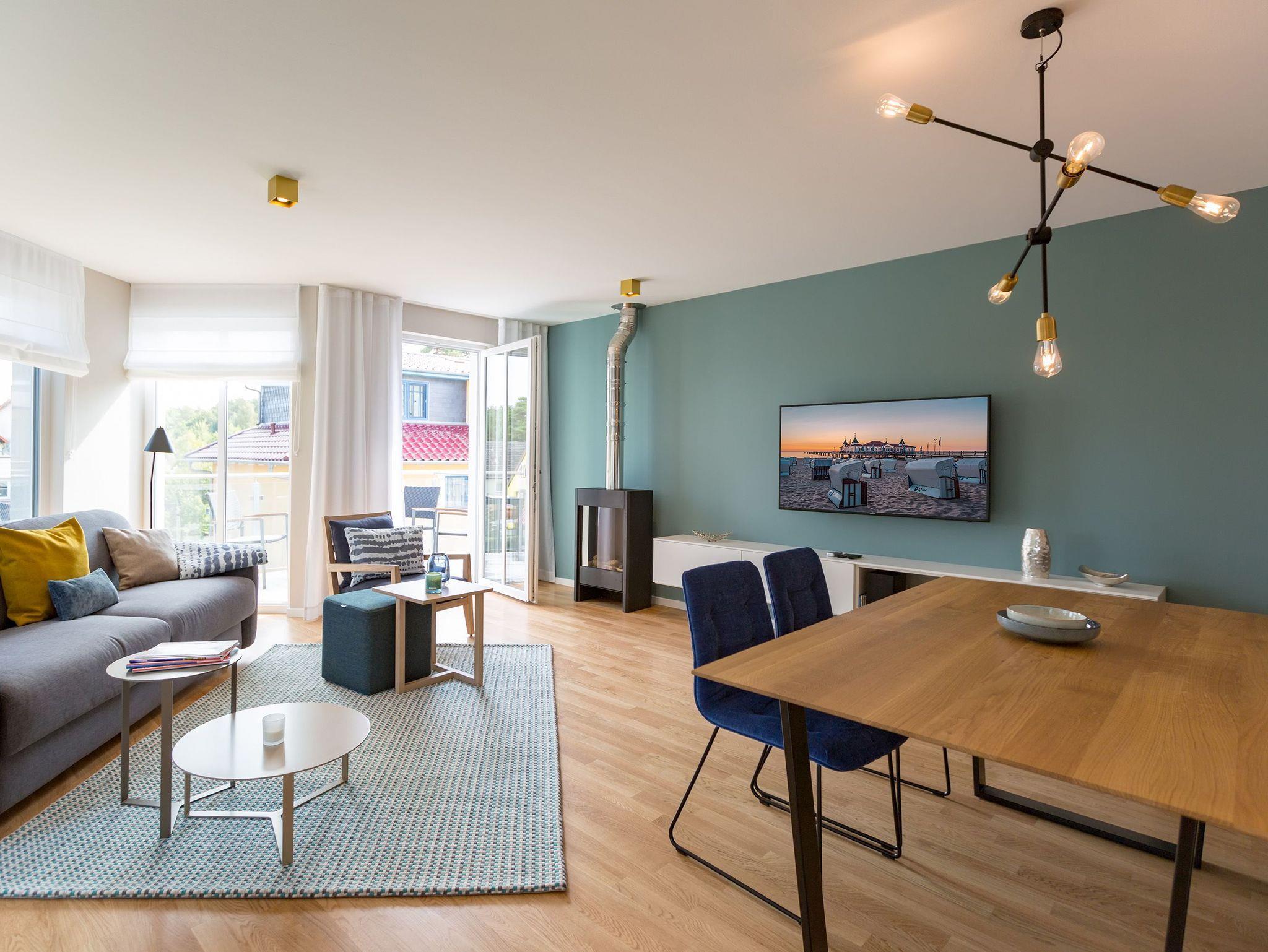 Sanfte Grün- und Blautöne geben diesem kuscheligen, aber geräumigen Urlaubsparadies mit seinen 63 Quadratmetern ein maritimes Flair. Durch große, bodentiefe Fenster scheint viel Licht in das Zwei-Raum-Appartement, das durch die Aufbettungsmöglichkeit einer gemütlichen Schlafcouch im Wohnzimmer Platz für bis zu 3 Personen und ein Kind bietet. Auf den beiden Balkonen (1 x 2,5 Quadratmeter Richtung Süd-West [&] 1 x 8 Quadratmeter Richtung Westen) können Sie nicht nur die Sonne genießen. Auch das Rauschen der Ostsee ist hier ganz nah. Kein Wunder, denn bis zum Meer sind es nur ein paar Meter. Das große Wohn-Esszimmer hat noch einiges mehr als eine Schlafcouch zu bieten. Ein kuscheliges Highlight ist der urige Gas-Kamin, der an ungemütlichen Tagen für wundervolle Wärme sorgt. Ein großer Flat-TV bietet Home-Entertainment vom Feinsten. Und der schöne Essplatz lädt zu gemeinsamen, kulinarischen Muße- und Genussstunden ein. Alles für die Zubereitung feiner Speisen Notwendige finden Sie in der modernen und mit hochwertigen Markengeräten versehenen, offenen Küche. Einen eigenen, kleinen Balkon hat das Schlafzimmer, das mit seinem komfortablen Doppelbett (1,60 m x 2,00 m) mehr als nur Schlafvergnügen verspricht. Im Schrank finden Sie viel Ablagefläche für Ihr Reisegepäck. Schließlich will man im Urlaub auf nichts verzichten müssen. Freuen Sie sich auf das Badezimmer. Denn es beherbergt eine kleine Entspannungsoase. Eine Finnische Sauna steht Ihnen hier zur freien Verfügung. Natürlich verfügt das Bad auch über einen Waschtisch, eine schöne, ebenerdige Dusche und ein WC. Für Ihren Urlaubskomfort haben wir die Betten bei Anreise bezogen und Handtücher liegen bereit. Das WLAN können Sie kostenfrei benutzen und ein Pkw-Stellplatz befindet sich am Haus.