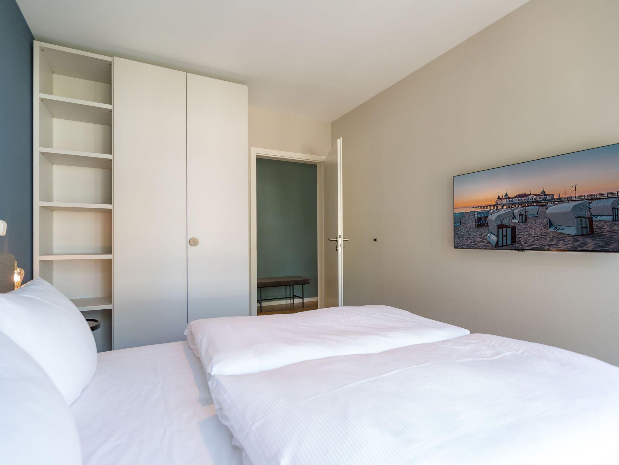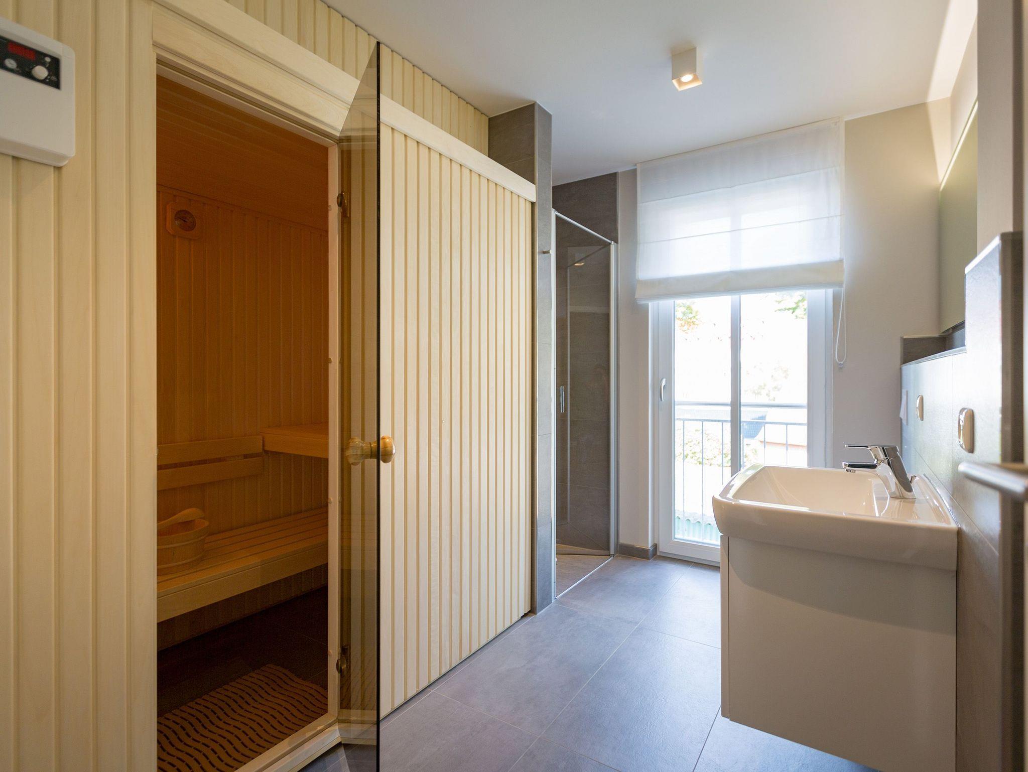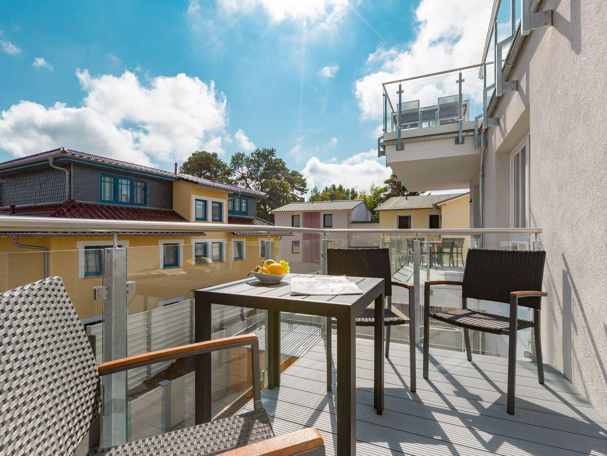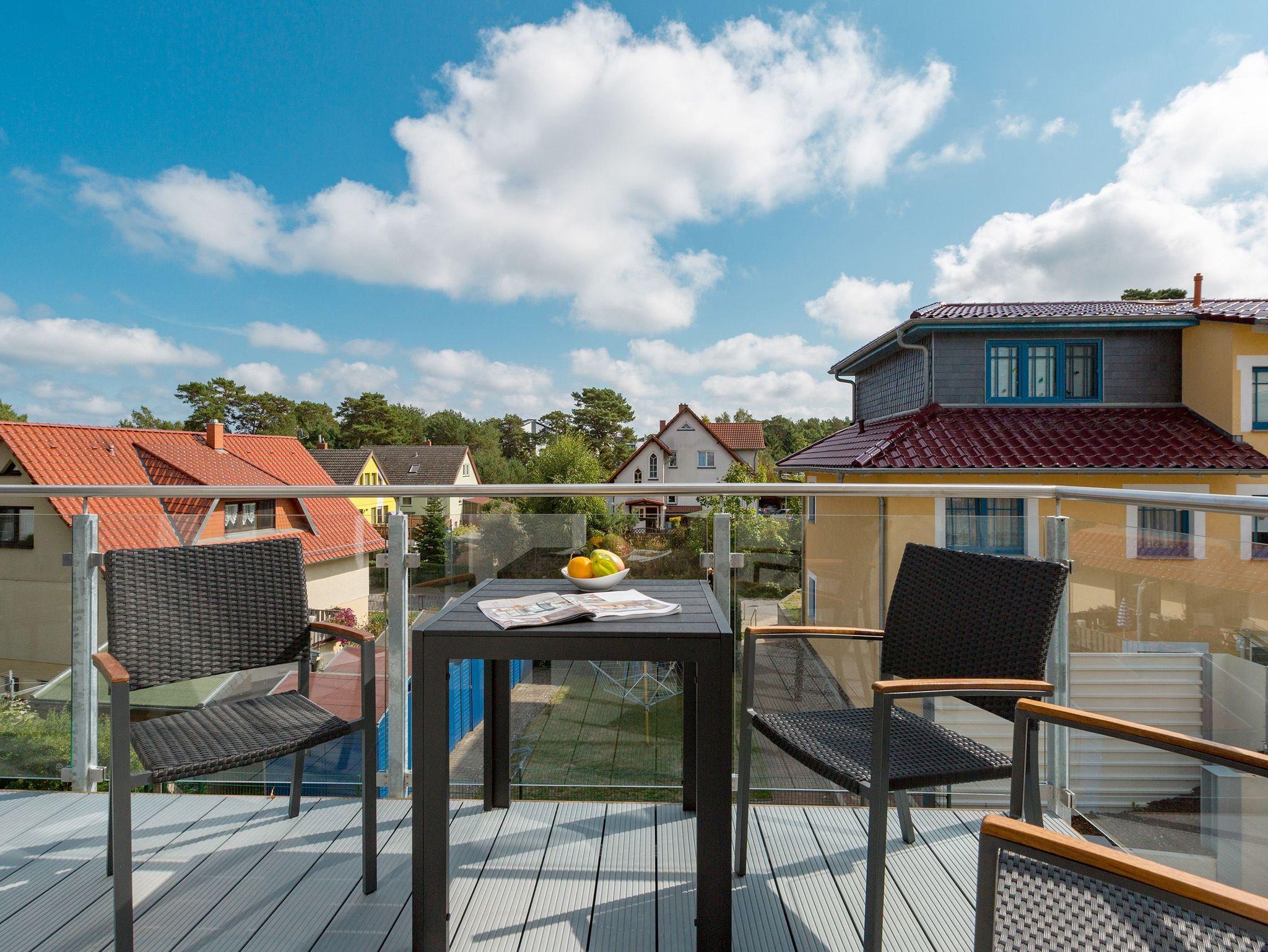 Sanfte Grün- und Blautöne geben diesem kuscheligen, aber geräumigen Urlaubsparadies mit seinen 63 Quadratmetern ein maritimes Flair. Durch große, bodentiefe Fenster scheint viel Licht in das Zwei-Raum-Appartement, das durch die Aufbettungsmöglichkeit einer gemütlichen Schlafcouch im Wohnzimmer Platz für bis zu 3 Personen und ein Kind bietet. Auf den beiden Balkonen (1 x 2,5 Quadratmeter Richtung Süd-West [&] 1 x 8 Quadratmeter Richtung Westen) können Sie nicht nur die Sonne genießen. Auch das Rauschen der Ostsee ist hier ganz nah. Kein Wunder, denn bis zum Meer sind es nur ein paar Meter. Das große Wohn-Esszimmer hat noch einiges mehr als eine Schlafcouch zu bieten. Ein kuscheliges Highlight ist der urige Gas-Kamin, der an ungemütlichen Tagen für wundervolle Wärme sorgt. Ein großer Flat-TV bietet Home-Entertainment vom Feinsten. Und der schöne Essplatz lädt zu gemeinsamen, kulinarischen Muße- und Genussstunden ein. Alles für die Zubereitung feiner Speisen Notwendige finden Sie in der modernen und mit hochwertigen Markengeräten versehenen, offenen Küche. Einen eigenen, kleinen Balkon hat das Schlafzimmer, das mit seinem komfortablen Doppelbett (1,60 m x 2,00 m) mehr als nur Schlafvergnügen verspricht. Im Schrank finden Sie viel Ablagefläche für Ihr Reisegepäck. Schließlich will man im Urlaub auf nichts verzichten müssen. Freuen Sie sich auf das Badezimmer. Denn es beherbergt eine kleine Entspannungsoase. Eine Finnische Sauna steht Ihnen hier zur freien Verfügung. Natürlich verfügt das Bad auch über einen Waschtisch, eine schöne, ebenerdige Dusche und ein WC. Für Ihren Urlaubskomfort haben wir die Betten bei Anreise bezogen und Handtücher liegen bereit. Das WLAN können Sie kostenfrei benutzen und ein Pkw-Stellplatz befindet sich am Haus.