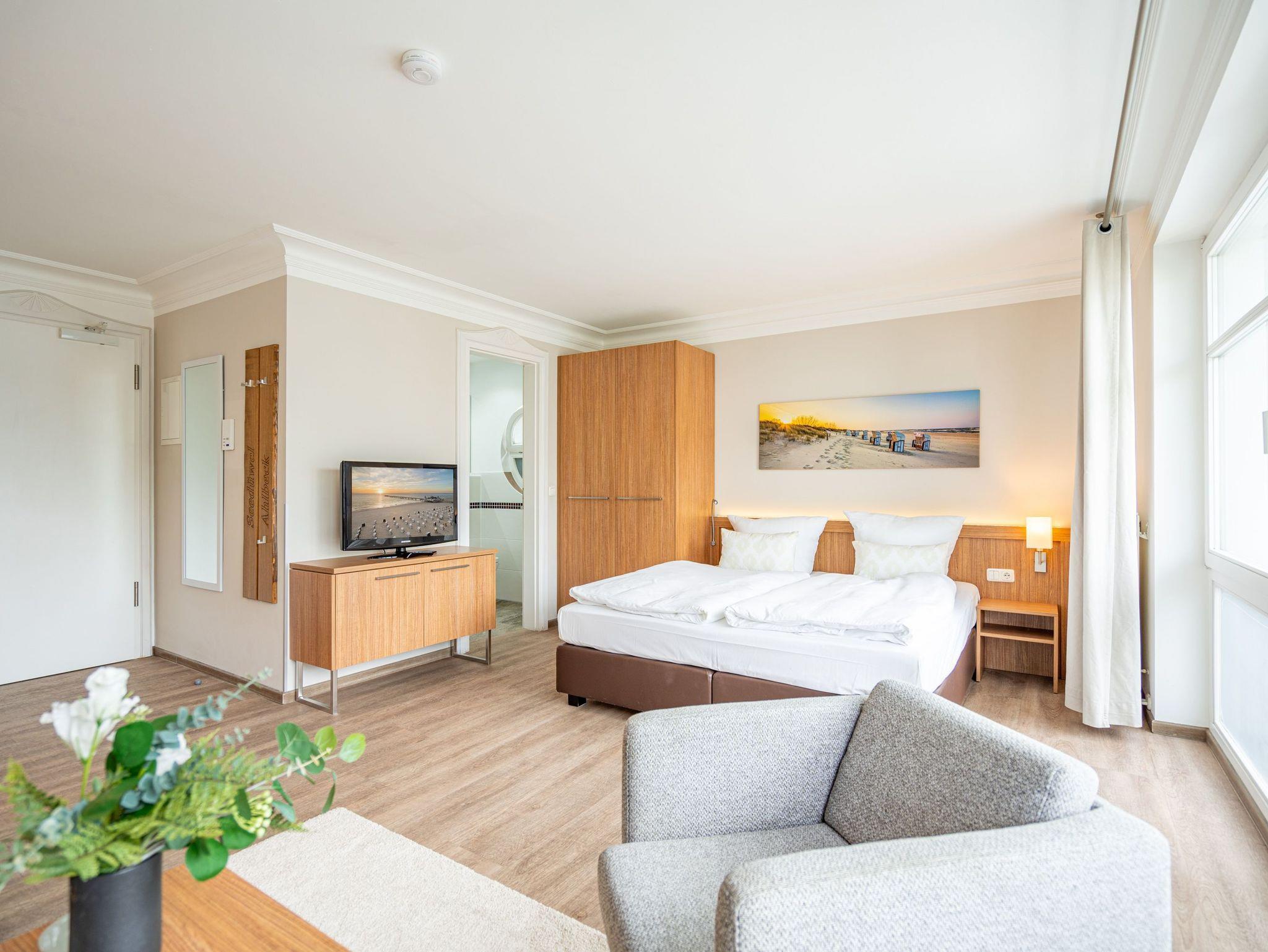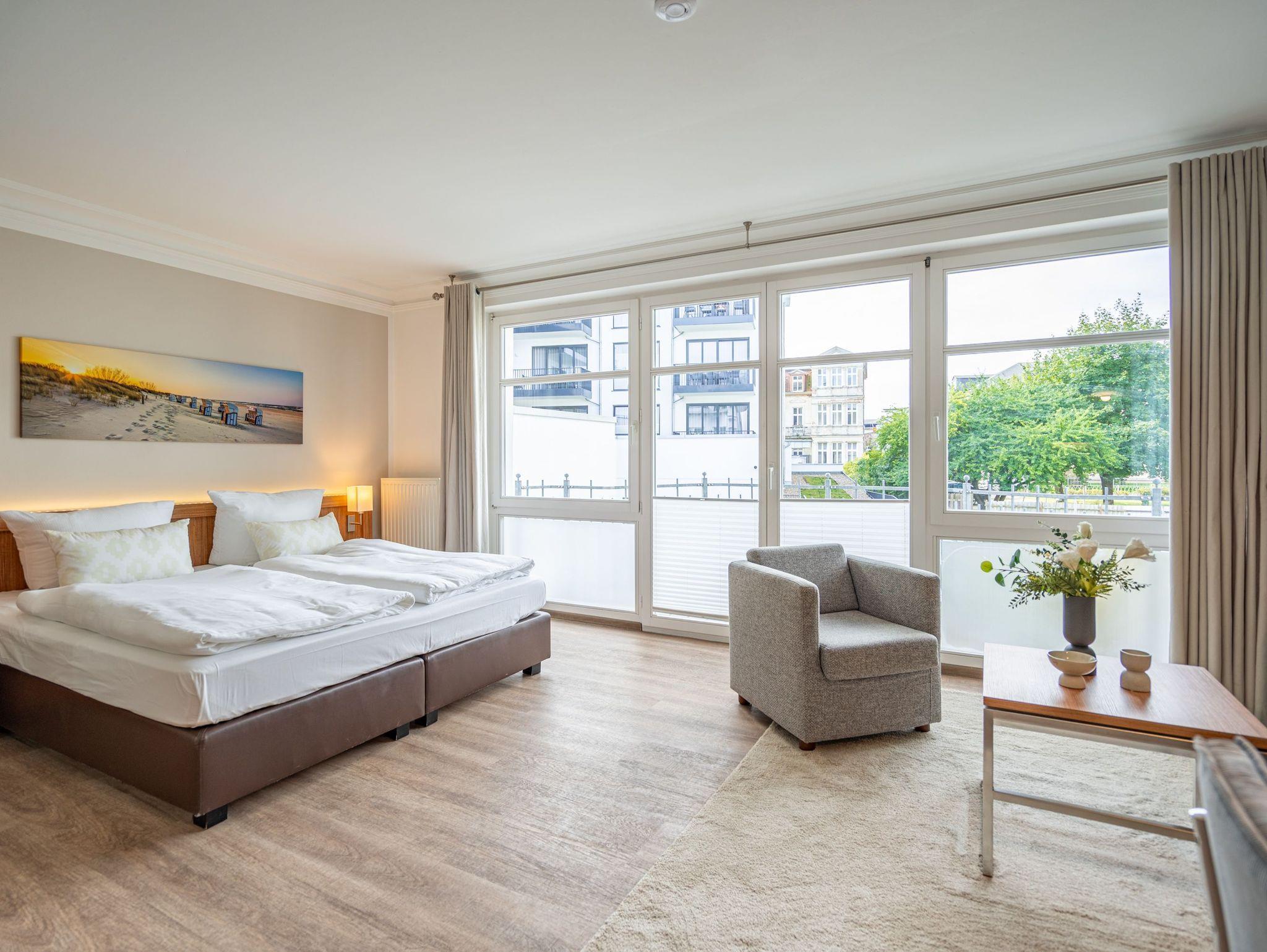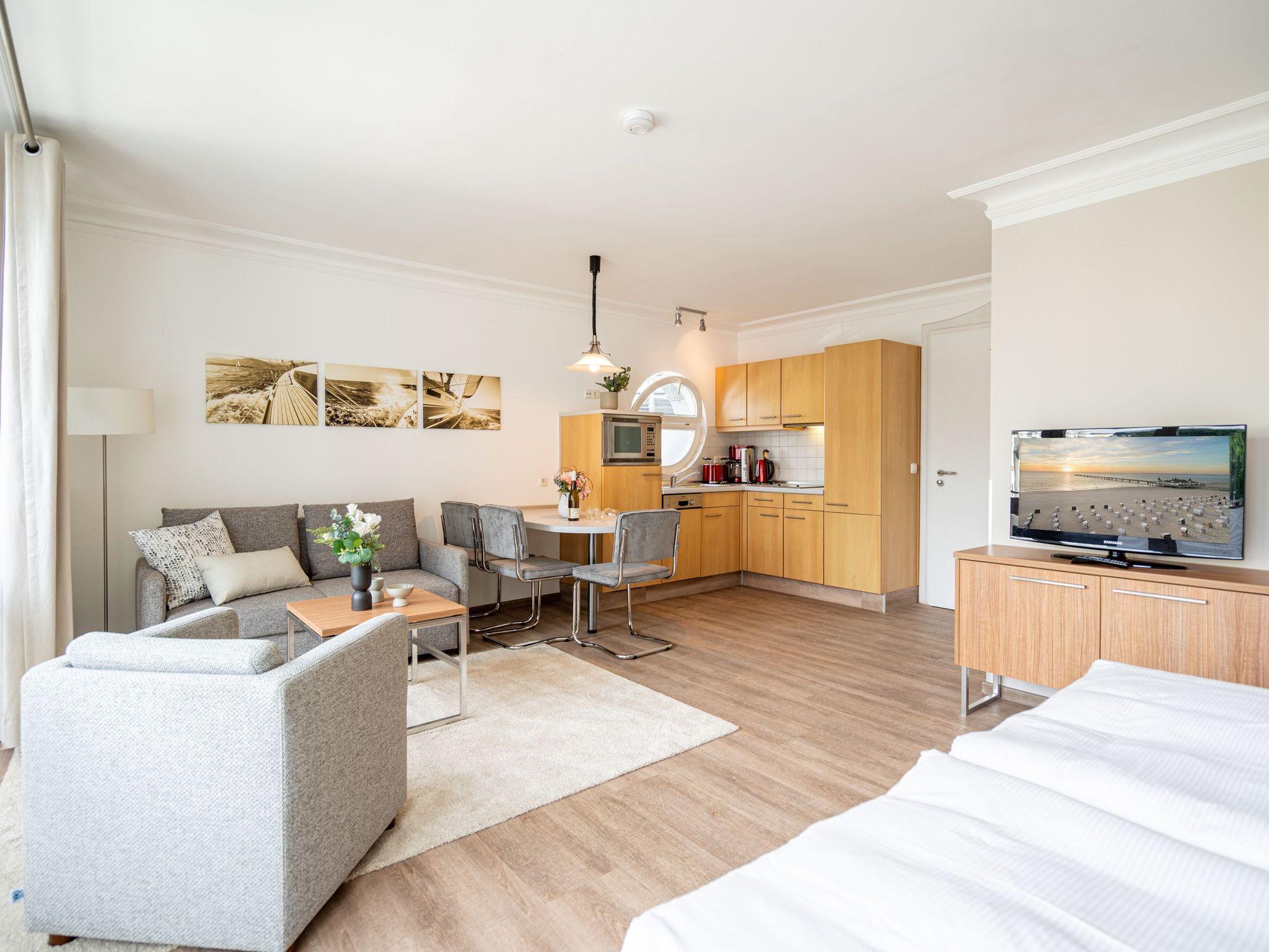 Die 1-Raum-Ferienwohnung Nr. C03 in der Villa Seedüwel bietet auf 35 qm komfortablen Platz für zwei Personen und befindet sich in der 1. Etage. Der offene Wohnbereich ist mit einer Küchenzeile ausgestattet, die ein 2-Platten-Cerankochfeld, eine Mikrowelle und einen Kühlschrank mit Gefrierfach umfasst. Ein Essplatz für zwei Personen, eine gemütliche Sitzgruppe und ein Flat-TV sorgen für Komfort. Das Doppelbett (1,80 m x 2,00 m) befindet sich ebenfalls im Wohnbereich und wird durch eine Kommode sowie einen Kleiderschrank ergänzt. Von hier aus gelangen Sie auf den sonnigen Süd-West-Balkon. Das Tageslicht-Bad verfügt über eine Dusche, ein Waschbecken und ein WC. Ein Stellplatz in der Tiefgarage ( Einfahrthöhe 2,03m) des benachbarten Hauses „Strandterrasse“ ist für Sie reserviert. WLAN steht Ihnen kostenfrei zur Verfügung.