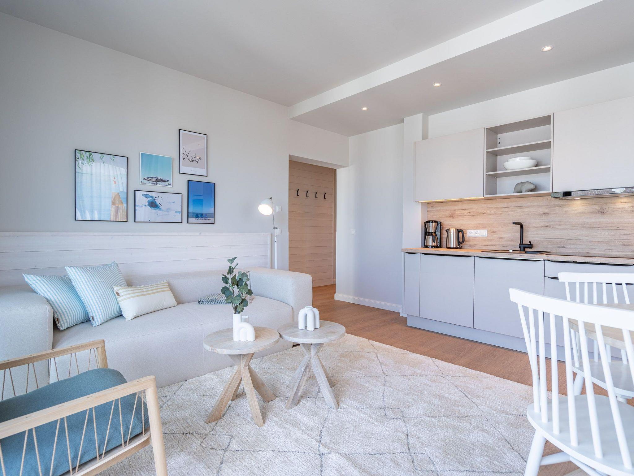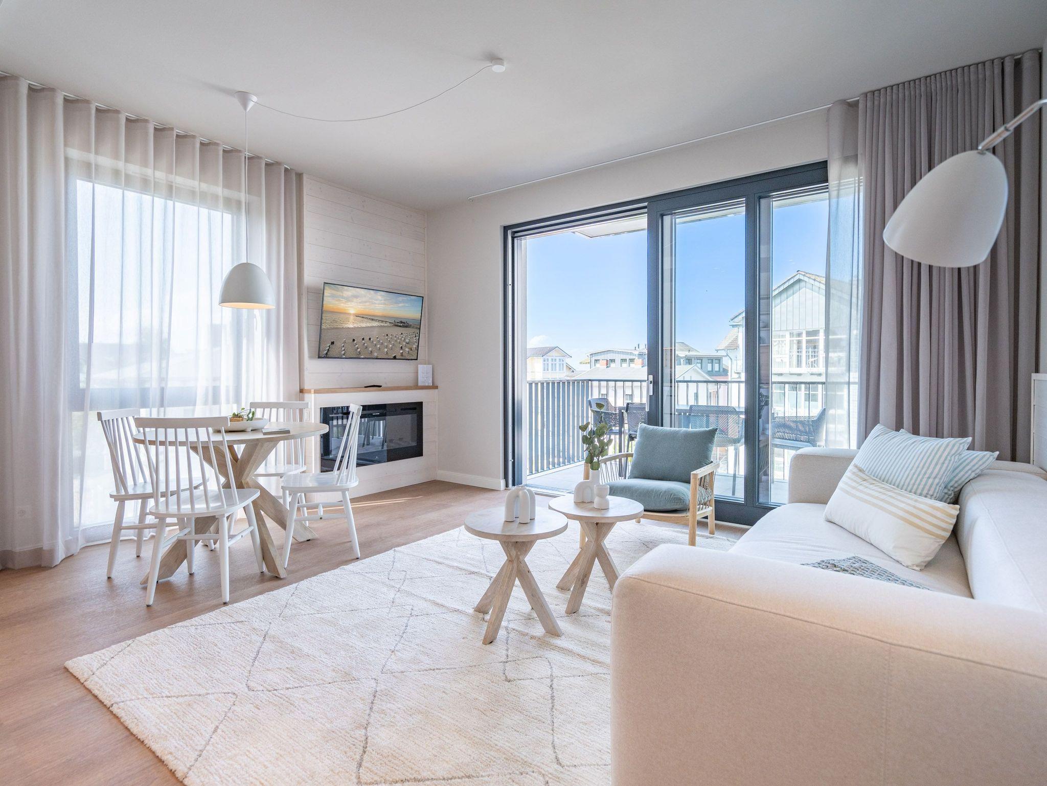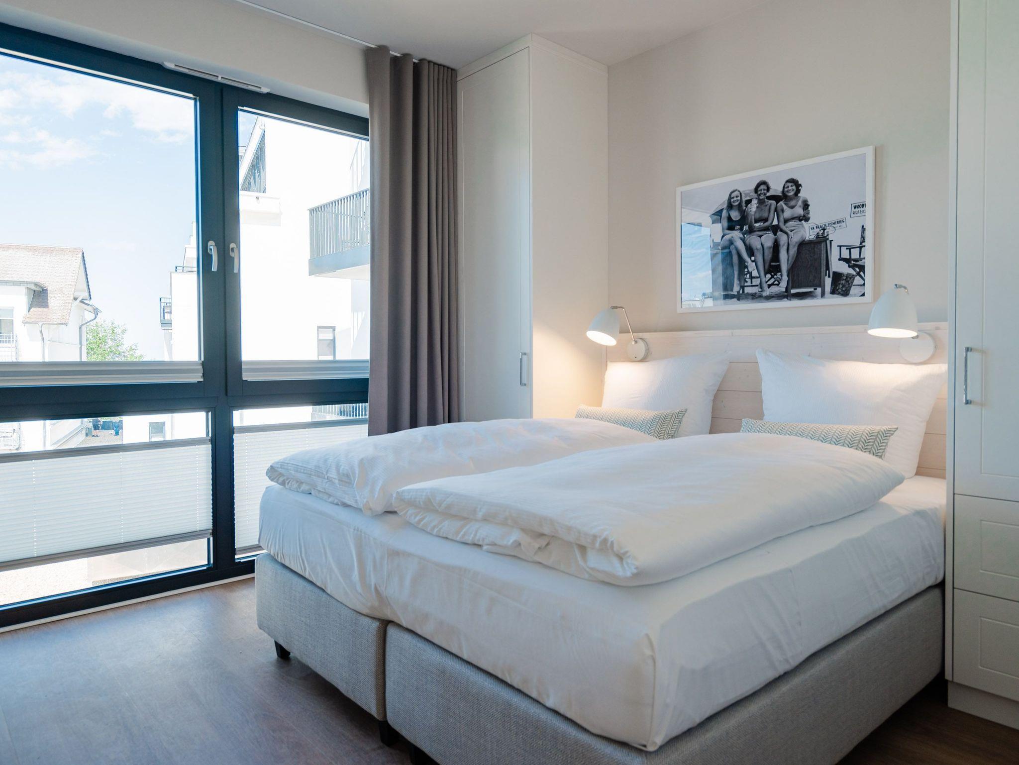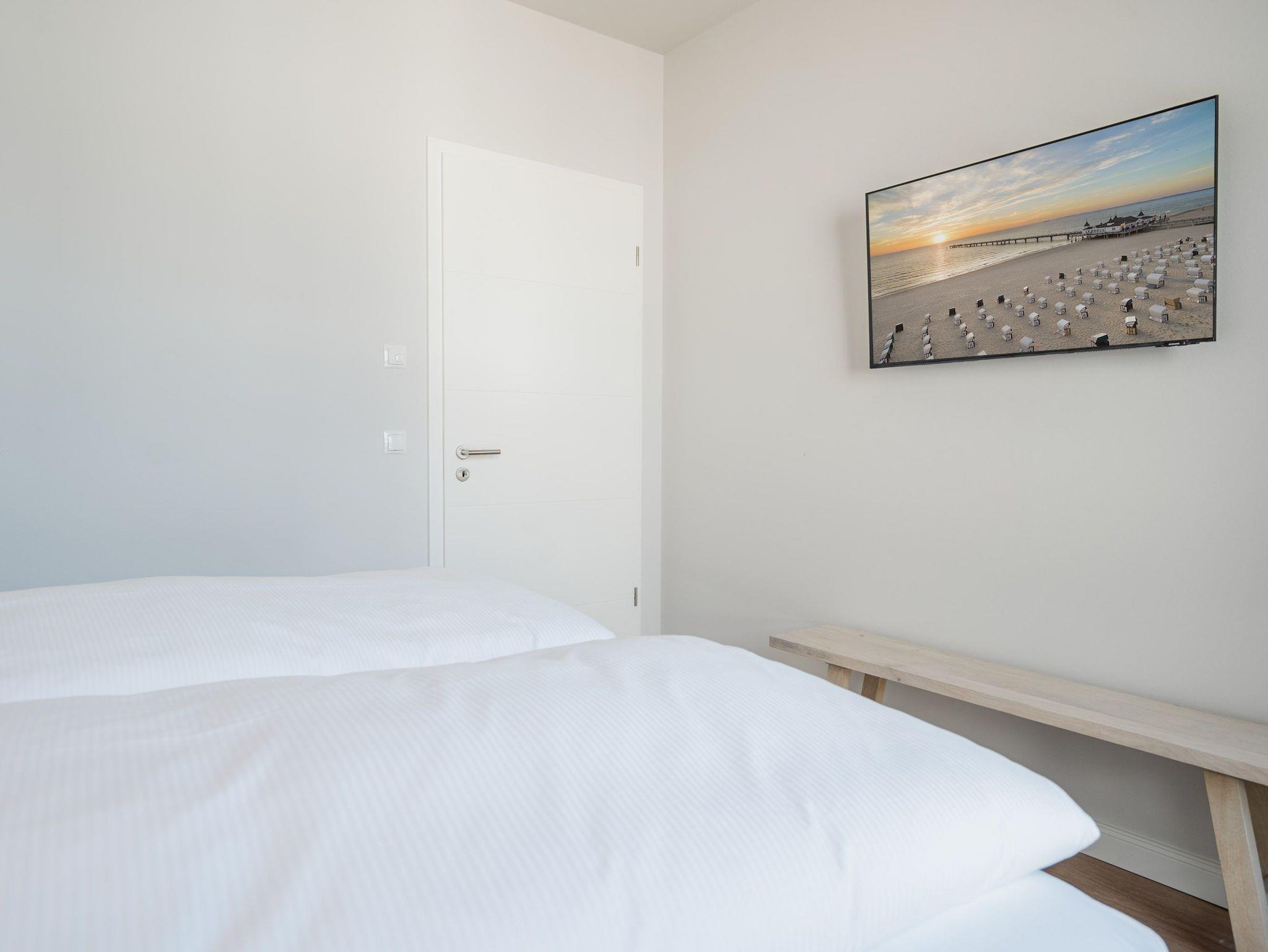 Ein helles und freundliches Urlaubsparadies empfängt Sie im 3-Raum-Appartement B 2.8 (Haus B) in der 2. Etage der Strandterrasse. Freuen Sie sich auf viel Gemütlichkeit und Komfort, denn die Wohnung ist ein absolutes Wohlfühlreich für bis zu 4 Personen. Viel Licht und wunderschöne Designmöbel verschönern Ihren Aufenthalt in den 62 Quadratmetern ungemein. Schon beim Eintreten bekommen Sie ein entspanntes Urlaubsgefühl. Der offene Wohn- und Essbereich bietet eine moderne Küchenzeile mit vielen Annehmlichkeiten wie einem Backofen, einem 4-Platten-Induktionsherd und einer Nespresso-Kapselmaschine. Hier macht das Kochen und das Zubereiten von Frühstück, Mittag oder Abendessen richtig Spaß. Essen können Sie am großen Esstisch mit 4 Stühlen. Viel Vergnügen beim Entspannen auf dem Sofa oder dem Sessel. Für Unterhaltung sorgt ein großer Flat-TV (50 Zoll). Wer es gern romantisch mag, kann sich mit dem Elektrokamin (ohne Wärmeabgabe) eine kuschelige Atmosphäre zaubern. Das Appartement verfügt über einen Nord-Ost-Balkon. Treten Sie aus dem Wohnzimmer hinaus und schnuppern Sie frische Ostseeluft. Und hinten schimmert es Blau: Denn zwischen der Strandterrasse und der Villa Seedüwel können Sie vom Balkon aus sogar aufs Meer schauen. Die Wohnung besitzt zwei Schlafzimmer. Beide sind mit einem komfortablen Boxspringdoppelbett (je 1,80m x 2,00m), einem Kleiderschrank und einem Flat-TV (43 Zoll) aufs Trefflichste eingerichtet. Viel Platz also für Privatsphäre und entspannte Nächte. Zwei moderne Bäder mit Dusche, Waschtisch und WC sind Ihre ganz persönlichen Wellnesszonen. Zum Appartement gehört in der Tiefgarage auch ein PKW-Stellplatz. Bei so viel Aussicht auf erholsame Tage kann Ihre Meerauszeit nur wunderschön werden.