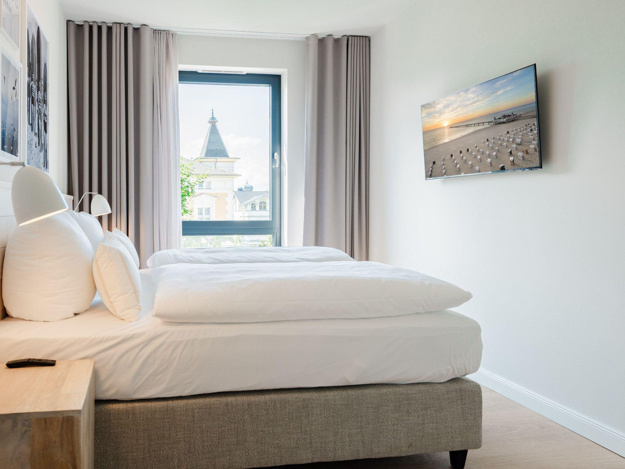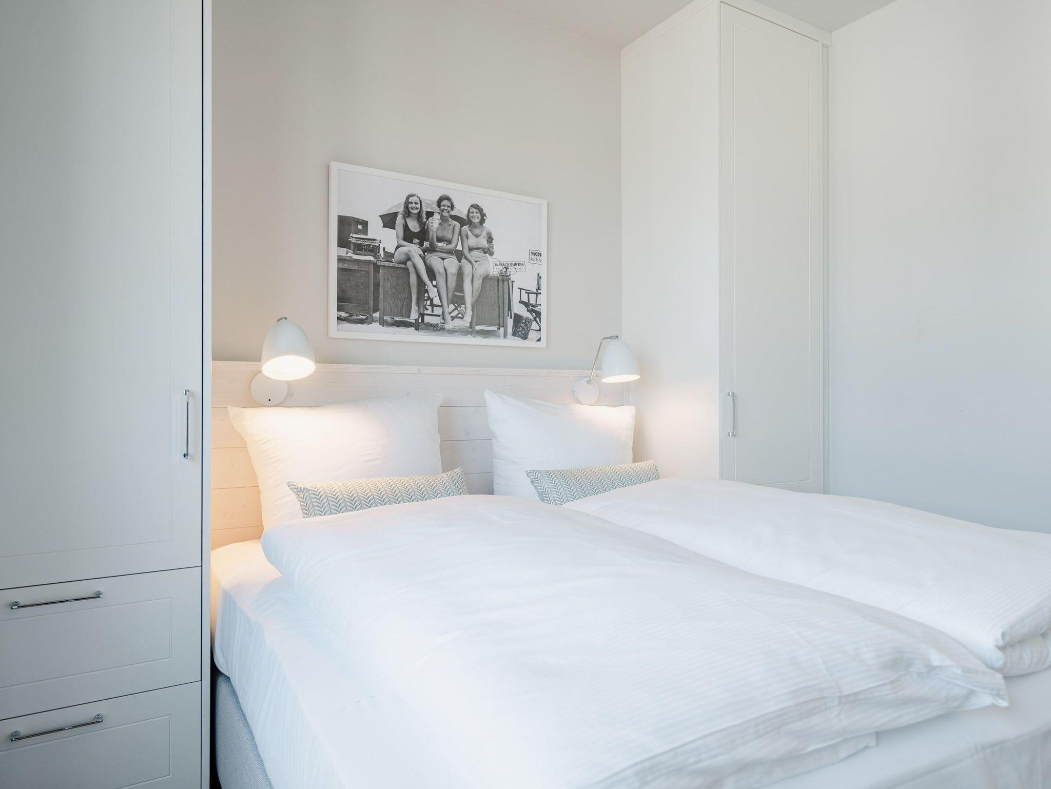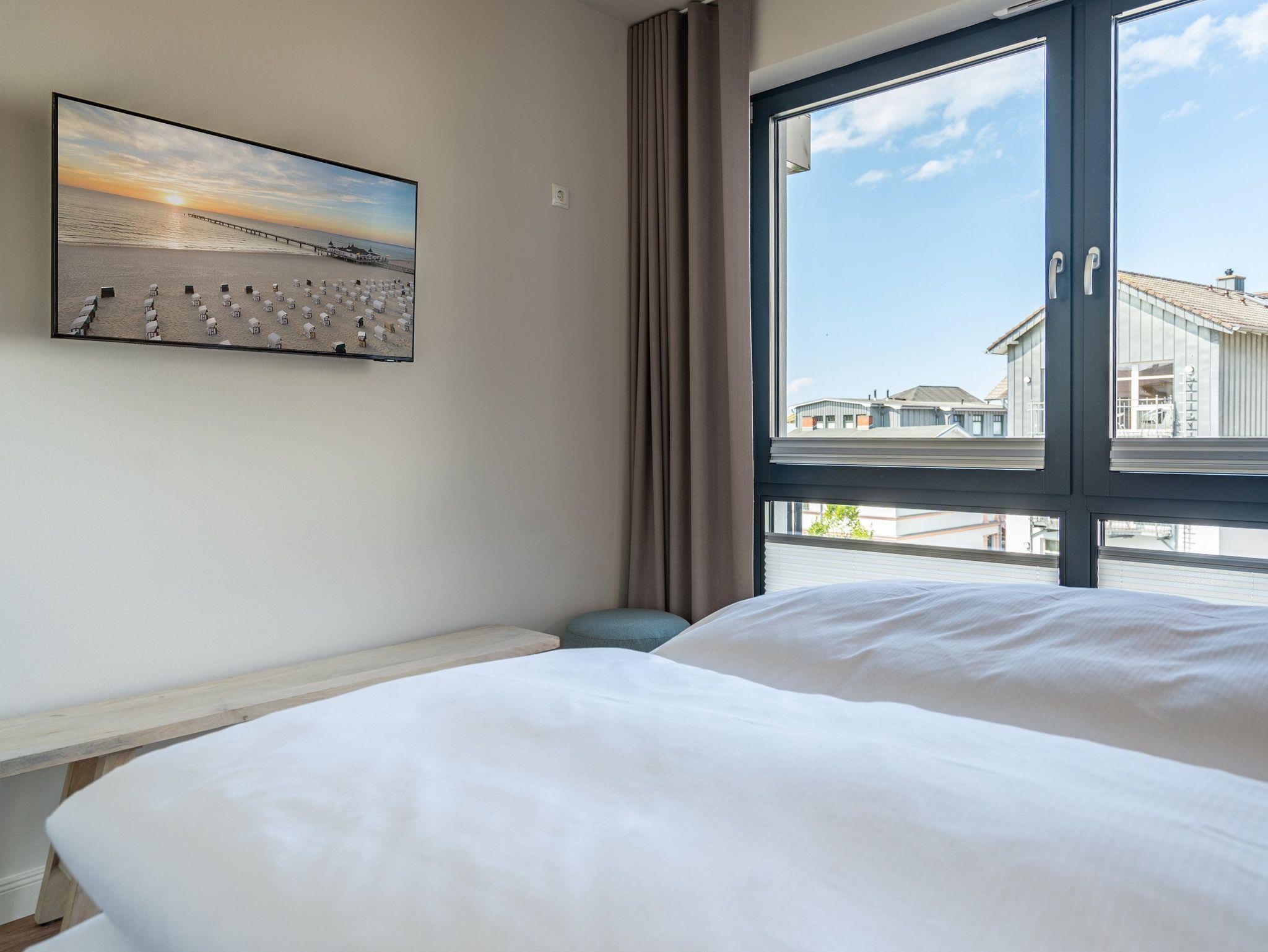 Ein helles und freundliches Urlaubsparadies empfängt Sie im 3-Raum-Appartement B 2.8 (Haus B) in der 2. Etage der Strandterrasse. Freuen Sie sich auf viel Gemütlichkeit und Komfort, denn die Wohnung ist ein absolutes Wohlfühlreich für bis zu 4 Personen. Viel Licht und wunderschöne Designmöbel verschönern Ihren Aufenthalt in den 62 Quadratmetern ungemein. Schon beim Eintreten bekommen Sie ein entspanntes Urlaubsgefühl. Der offene Wohn- und Essbereich bietet eine moderne Küchenzeile mit vielen Annehmlichkeiten wie einem Backofen, einem 4-Platten-Induktionsherd und einer Nespresso-Kapselmaschine. Hier macht das Kochen und das Zubereiten von Frühstück, Mittag oder Abendessen richtig Spaß. Essen können Sie am großen Esstisch mit 4 Stühlen. Viel Vergnügen beim Entspannen auf dem Sofa oder dem Sessel. Für Unterhaltung sorgt ein großer Flat-TV (50 Zoll). Wer es gern romantisch mag, kann sich mit dem Elektrokamin (ohne Wärmeabgabe) eine kuschelige Atmosphäre zaubern. Das Appartement verfügt über einen Nord-Ost-Balkon. Treten Sie aus dem Wohnzimmer hinaus und schnuppern Sie frische Ostseeluft. Und hinten schimmert es Blau: Denn zwischen der Strandterrasse und der Villa Seedüwel können Sie vom Balkon aus sogar aufs Meer schauen. Die Wohnung besitzt zwei Schlafzimmer. Beide sind mit einem komfortablen Boxspringdoppelbett (je 1,80m x 2,00m), einem Kleiderschrank und einem Flat-TV (43 Zoll) aufs Trefflichste eingerichtet. Viel Platz also für Privatsphäre und entspannte Nächte. Zwei moderne Bäder mit Dusche, Waschtisch und WC sind Ihre ganz persönlichen Wellnesszonen. Zum Appartement gehört in der Tiefgarage auch ein PKW-Stellplatz. Bei so viel Aussicht auf erholsame Tage kann Ihre Meerauszeit nur wunderschön werden.