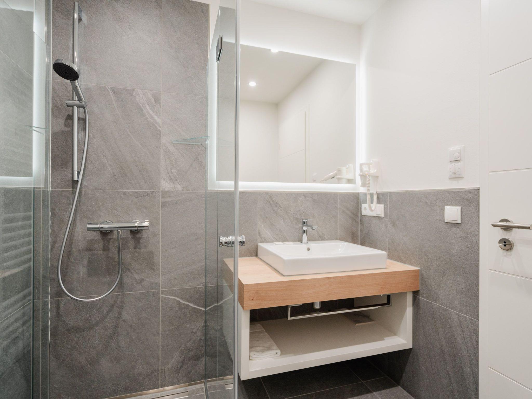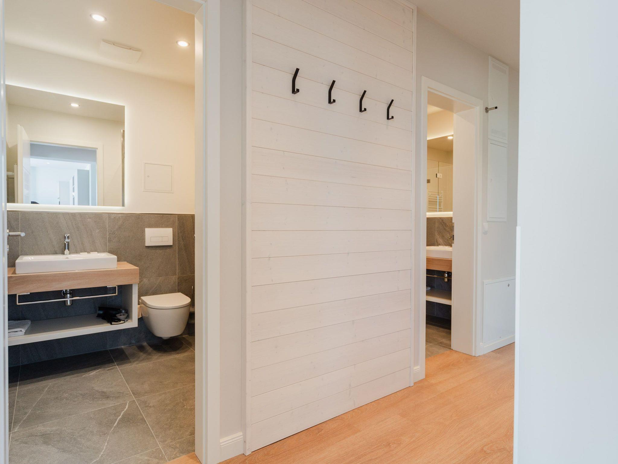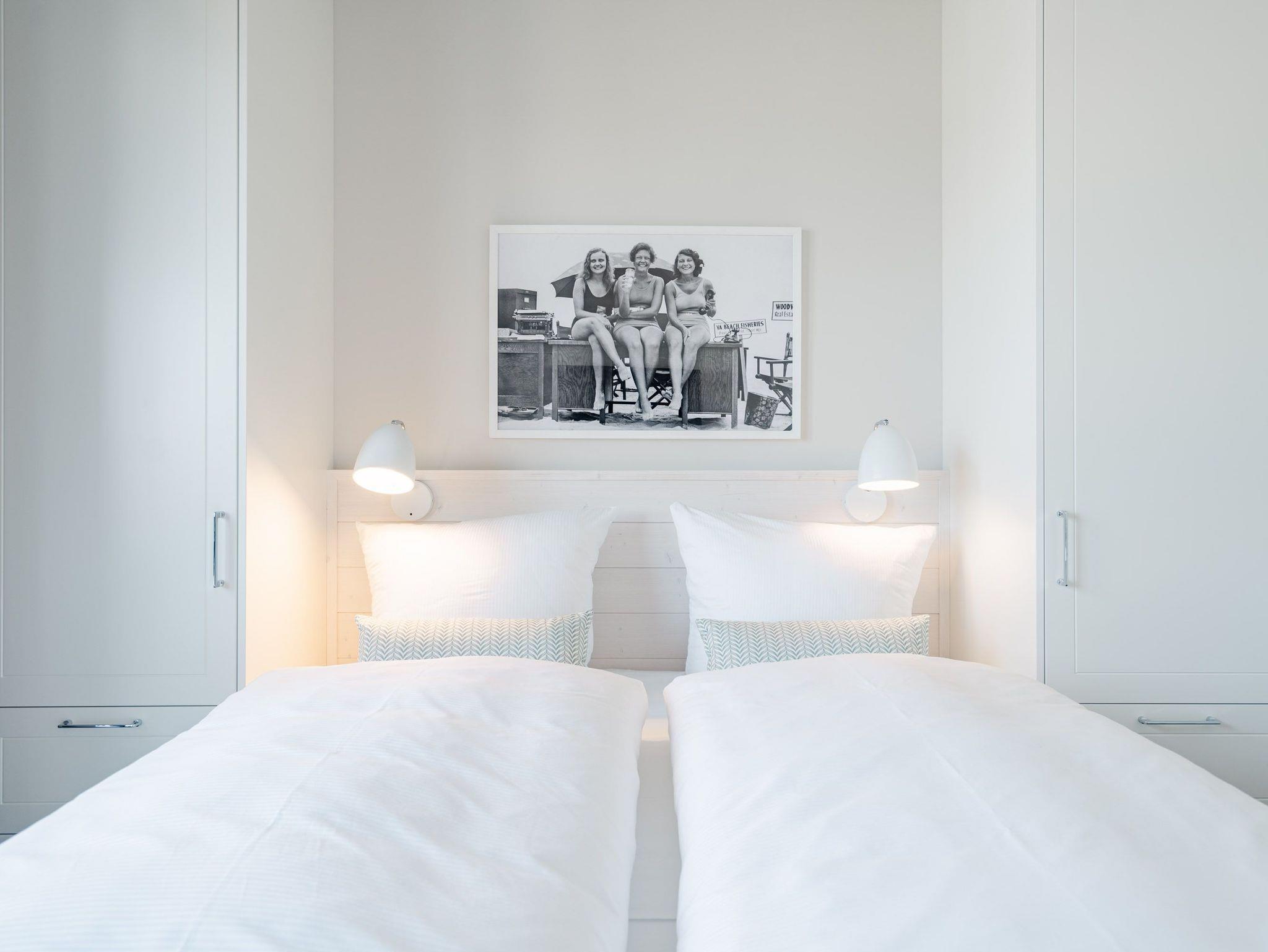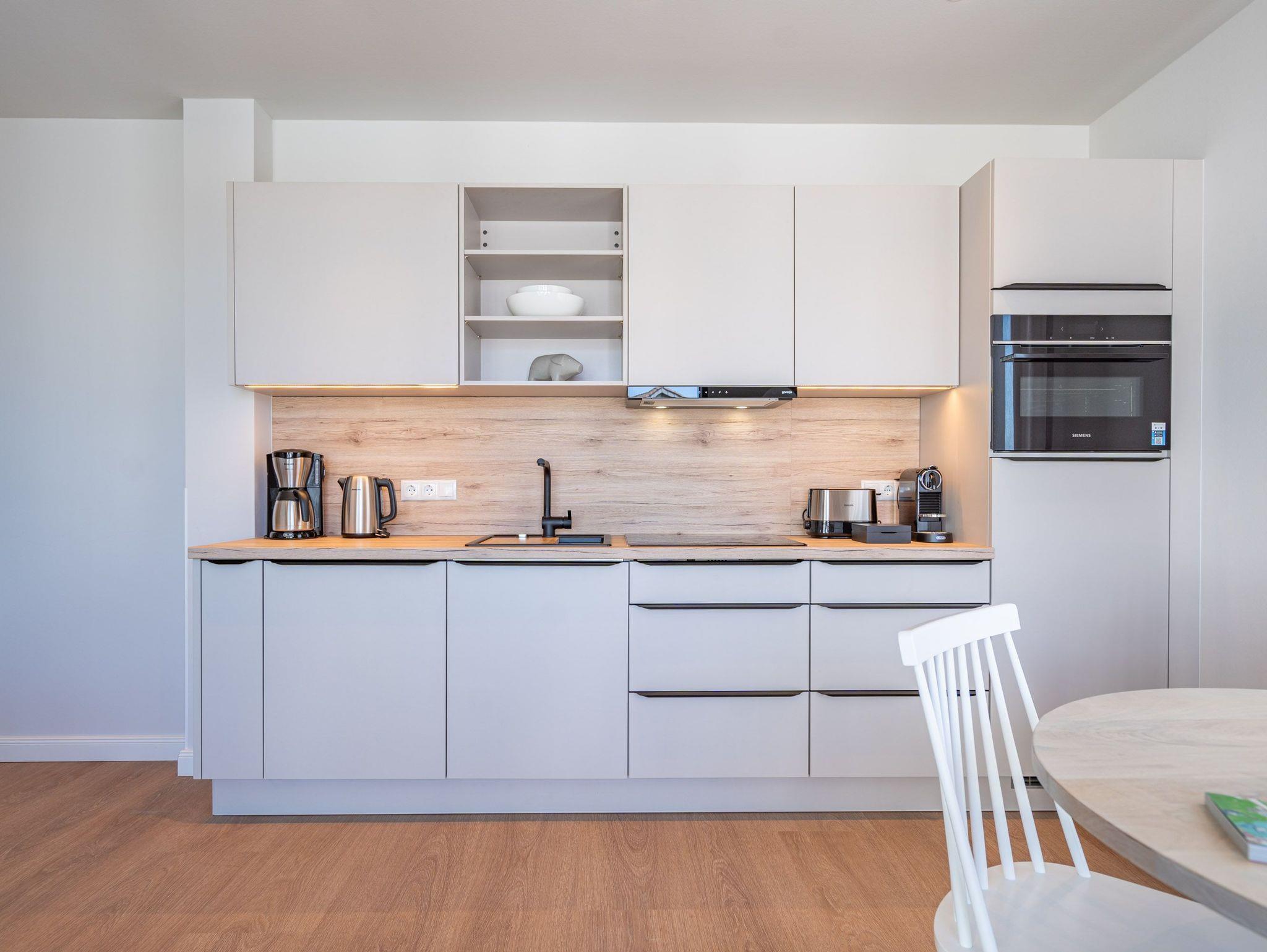 Ein helles und freundliches Urlaubsparadies empfängt Sie im 3-Raum-Appartement B 2.8 (Haus B) in der 2. Etage der Strandterrasse. Freuen Sie sich auf viel Gemütlichkeit und Komfort, denn die Wohnung ist ein absolutes Wohlfühlreich für bis zu 4 Personen. Viel Licht und wunderschöne Designmöbel verschönern Ihren Aufenthalt in den 62 Quadratmetern ungemein. Schon beim Eintreten bekommen Sie ein entspanntes Urlaubsgefühl. Der offene Wohn- und Essbereich bietet eine moderne Küchenzeile mit vielen Annehmlichkeiten wie einem Backofen, einem 4-Platten-Induktionsherd und einer Nespresso-Kapselmaschine. Hier macht das Kochen und das Zubereiten von Frühstück, Mittag oder Abendessen richtig Spaß. Essen können Sie am großen Esstisch mit 4 Stühlen. Viel Vergnügen beim Entspannen auf dem Sofa oder dem Sessel. Für Unterhaltung sorgt ein großer Flat-TV (50 Zoll). Wer es gern romantisch mag, kann sich mit dem Elektrokamin (ohne Wärmeabgabe) eine kuschelige Atmosphäre zaubern. Das Appartement verfügt über einen Nord-Ost-Balkon. Treten Sie aus dem Wohnzimmer hinaus und schnuppern Sie frische Ostseeluft. Und hinten schimmert es Blau: Denn zwischen der Strandterrasse und der Villa Seedüwel können Sie vom Balkon aus sogar aufs Meer schauen. Die Wohnung besitzt zwei Schlafzimmer. Beide sind mit einem komfortablen Boxspringdoppelbett (je 1,80m x 2,00m), einem Kleiderschrank und einem Flat-TV (43 Zoll) aufs Trefflichste eingerichtet. Viel Platz also für Privatsphäre und entspannte Nächte. Zwei moderne Bäder mit Dusche, Waschtisch und WC sind Ihre ganz persönlichen Wellnesszonen. Zum Appartement gehört in der Tiefgarage auch ein PKW-Stellplatz. Bei so viel Aussicht auf erholsame Tage kann Ihre Meerauszeit nur wunderschön werden.
