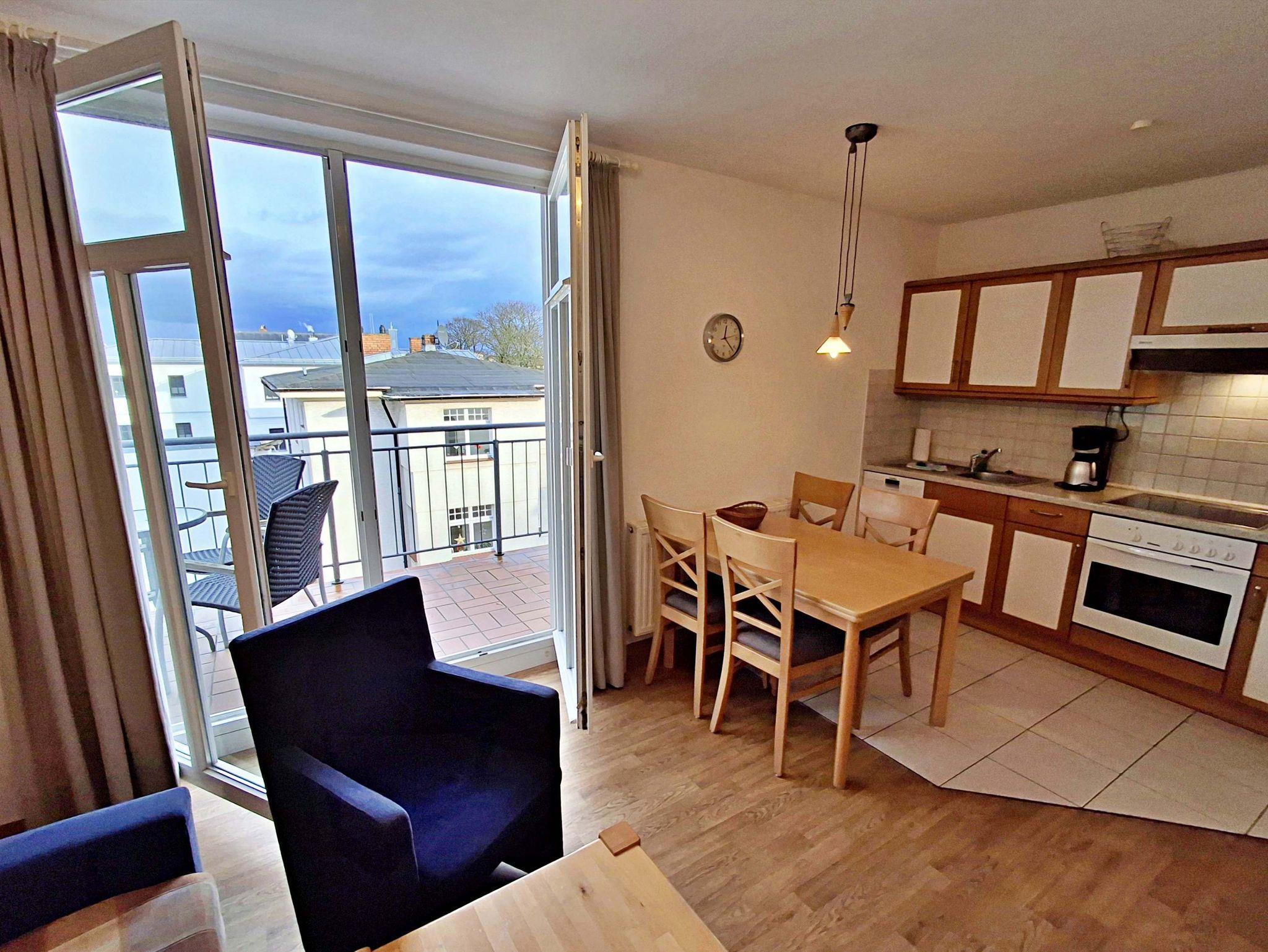 Die freundliche 3-Zimmer-Wohnung Korswandt mit Balkon für max. 4 Erwachsene und 1 Kleinkind bis 3 Jahre befindet in der zweiten Etage im Haus am Kurpark - nur wenige Schritte von der Promenade und dem Strand entfernt. Im Wohnbereich befinden sich neben der gemütlichen Couch auch zwei Sessel sowie ein Esstisch mit 4 Stühlen, der genügend Platz bietet. Vom Wohnbereich aus gelangen Sie auf den Balkon, welcher zur See-/Hofseite gelegen ist. Hier können Sie bereits morgens Ihren Kaffee genießen oder den Abend bei einem Glas Wein ausklingen lassen. Die moderne Küchenzeile mit Ceranherd, Backofen, Geschirrspüler, Mikrowelle, Kaffeemaschine, Wasserkocher und Toaster lässt keine Wünsche offen. Für die Unterhaltung sorgen ein Flachbild-TV, Radio-CD-Player und kostenfreies W-LAN. Das 1. Schlafzimmer verfügt über ein Doppelbett und das zweite Schlafzimmer über 2 Einzelbetten. Das Badezimmer hat DU/WC.