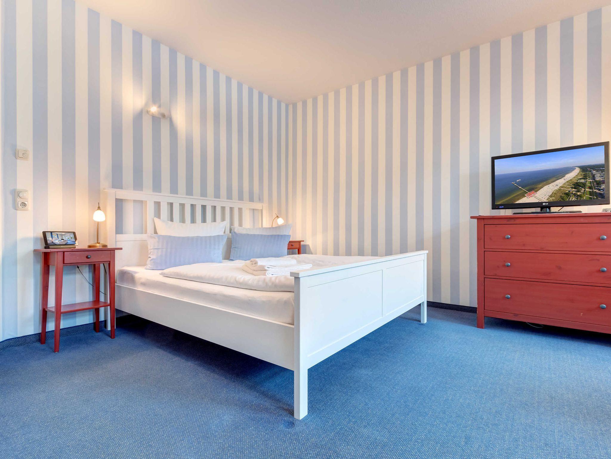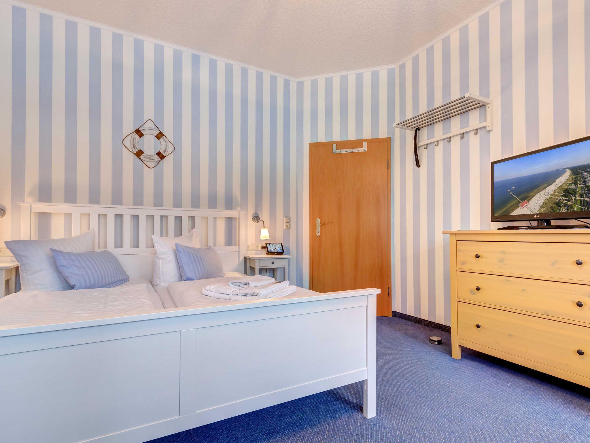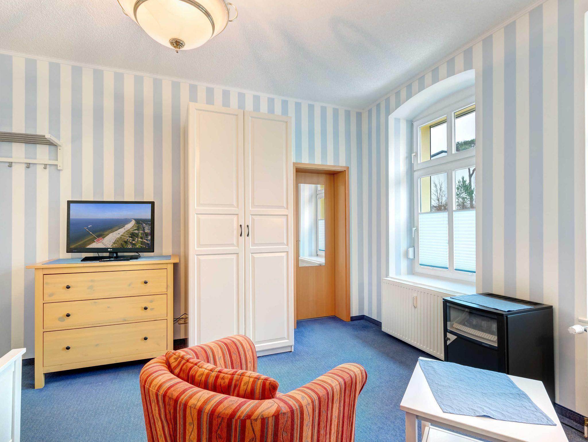 Doppelzimmer zur Landseite mit Doppelbett, Couchgruppe, Kühlmöglichkeit, Kabel-TV, Tablet-PC, Bad mit Fenster.