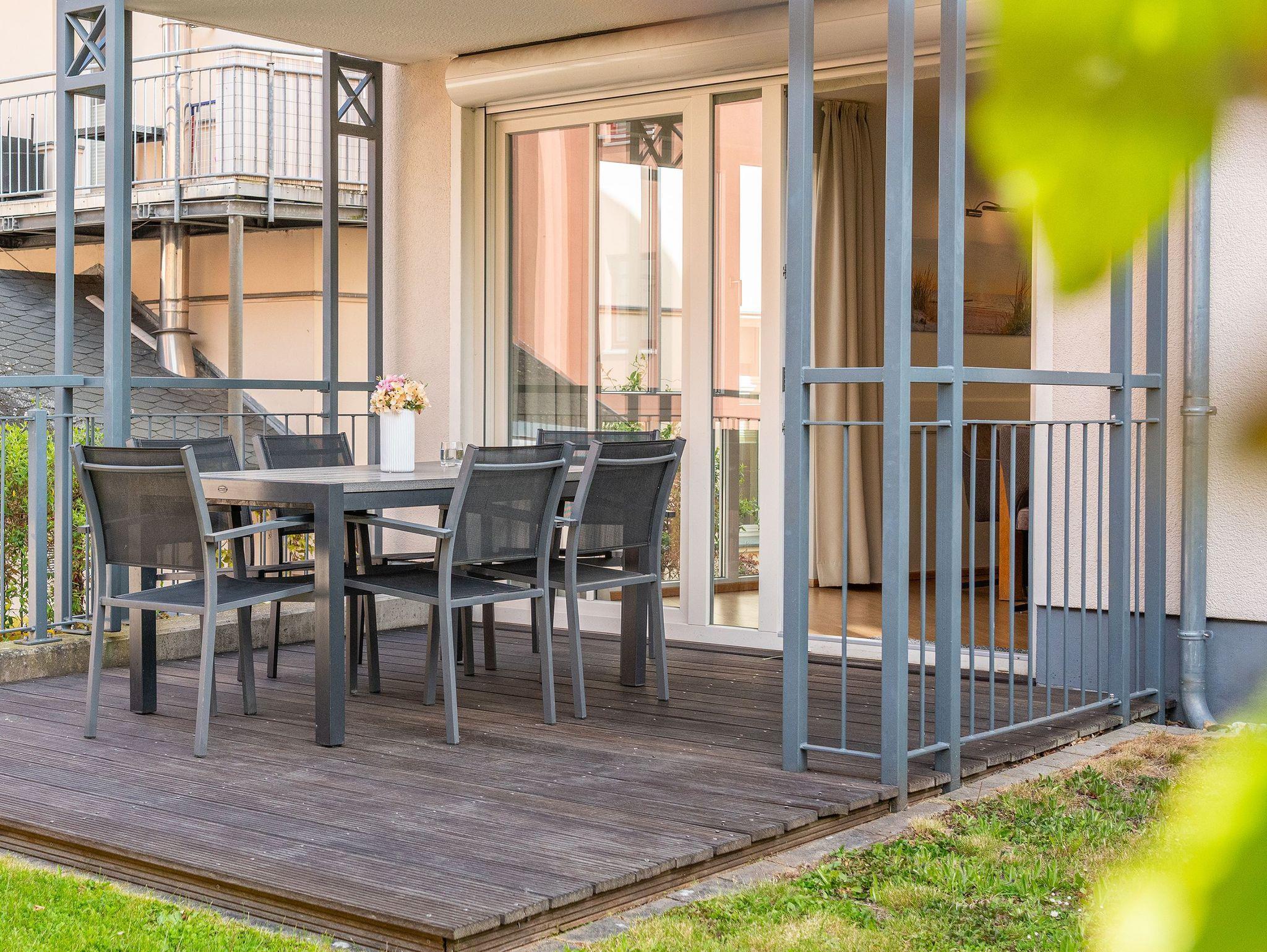 Der offene Wohn- und Kochbereich ist modern und gleichzeitig gemütlich eingerichtet. Die Polstersitzecke lädt zum Relaxen dank Flat-TV und Blu-ray-Player ein, ist aber auch ein idealer Ort für gesellige Spielabende. Im Handumdrehen können Sie die hochwertige Boxspringcouch zum Schlafplatz für zwei Gäste umwandeln. Vom Wohnbereich gelangen Sie auf Ihre private Terrasse mit Südwestausrichtung: dank des kleinen Gartenanteils empfiehlt sich dieses Appartement ideal für Familien. Auf der Terrasse können Sie sich dem Sonnenbaden hingeben oder den Abend bei einem Gläschen Wein ausklingen lassen.