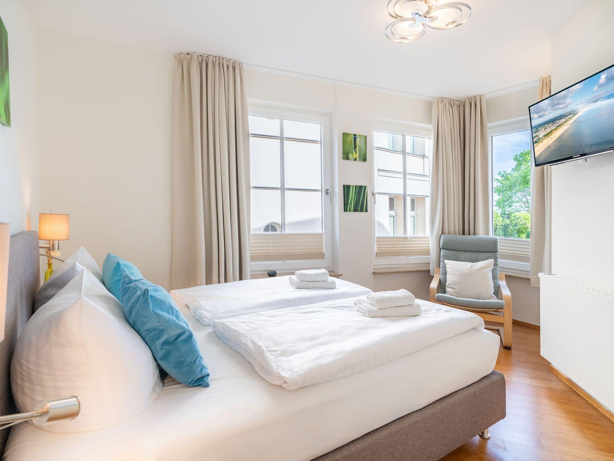 Damit Sie Ihre wohlverdiente Urlaubszeit bereits am Anreisetag in vollen Zügen genießen können, haben wir das Bett für Sie und das für Ihre lieben Mitreisenden bereits bezogen und ein Duschtuch sowie ein kleines Handtuch bereitgelegt. Das Appartement besitzt ein luxuriöses und großzügiges Badezimmer mit WC und einem Haartrockner - nach Belieben können Sie sich in der Echtglas-Dusche erfrischen oder in der Badewanne entspannen.