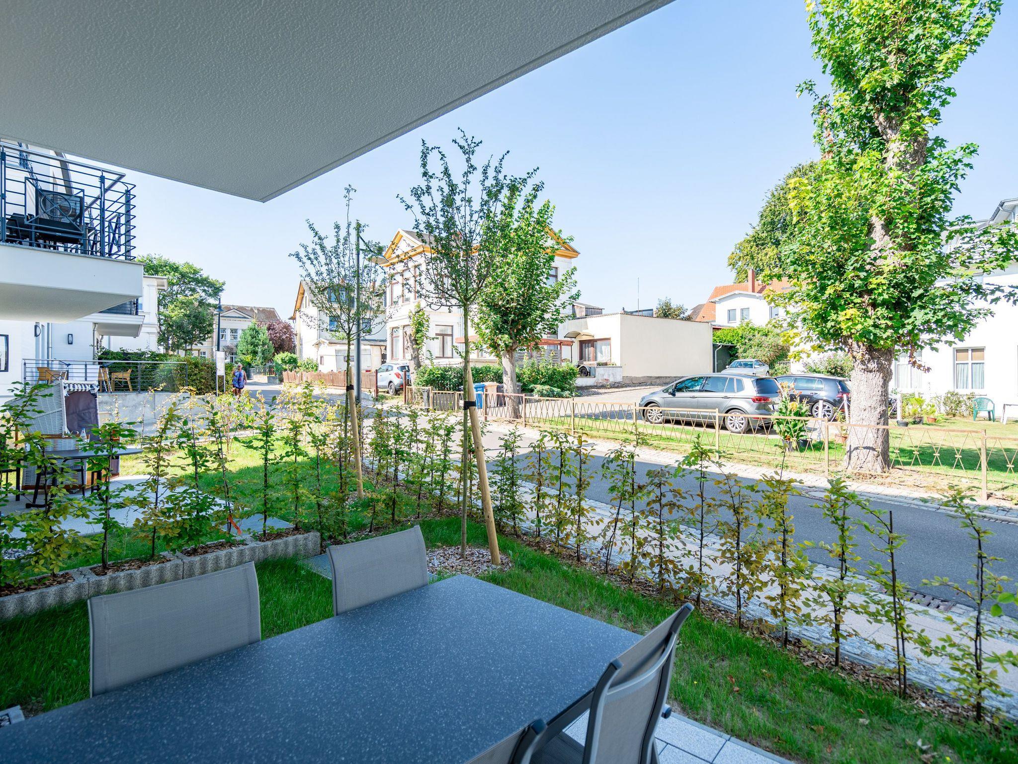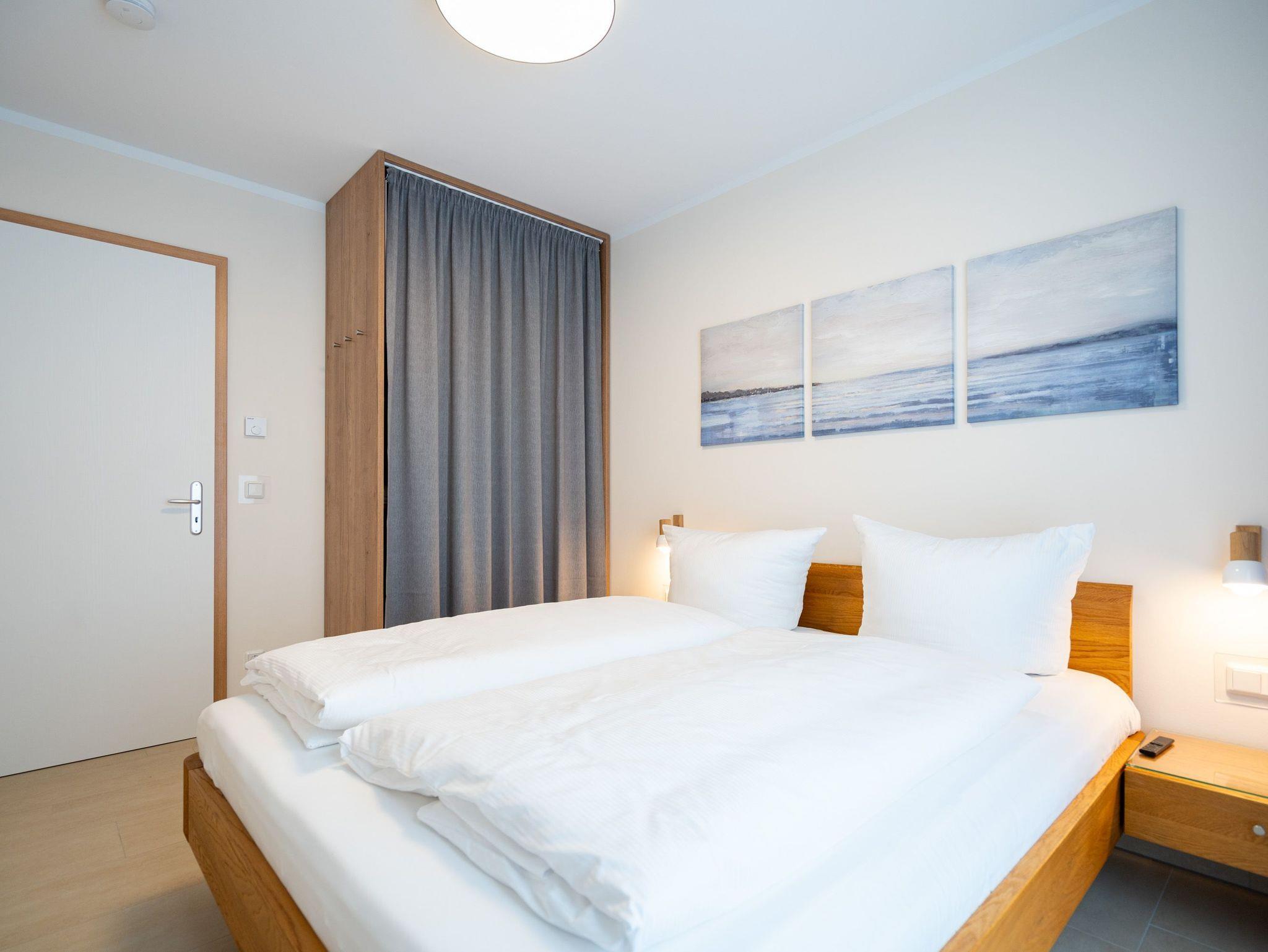 Die 3-Raum-Ferienwohnung Nr. 02 im Erdgeschoss des Quartier 6 bietet auf 73 m² Platz für bis zu 4 Personen und überzeugt mit einer modernen und komfortablen Ausstattung. Der offene Wohnbereich verfügt über eine voll ausgestattete Küchenzeile mit Induktionsherd, Mikrowelle und Backofen. Ein Essplatz für 4 Personen lädt zu gemeinsamen Mahlzeiten ein, während die gemütliche Sitzgruppe mit Flat-TV und ein per Fernbedienung gesteuerter Gas-Kamin für entspannte Abende sorgen. Von hier aus gelangen Sie auf die sonnige Süd-West-Terrasse mit einer Fläche von 10 m², die einen seitlichen Blick in Richtung Ostsee bietet. Die Ferienwohnung verfügt über zwei Schlafzimmer, jeweils mit einem Doppelbett (1,60 m x 2,00 m), Kleiderschrank und Flat-TV ausgestattet. Es stehen Ihnen zwei Bäder zur Verfügung: das erste innenliegende Bad bietet eine Dusche, einen Waschtisch, einen Haarfön und ein WC, während das zweite Bad ebenfalls mit Dusche, Waschtisch und WC ausgestattet ist und zusätzlich über eine Infrarotwärmekabine verfügt. Ein Hauswirtschaftsraum mit Waschmaschine und Trockner sorgt für zusätzlichen Komfort. Zur Wohnung gehört ein PKW-Stellplatz in der Tiefgarage sowie ein eigener Abstellraum im Keller für Fahrräder.
