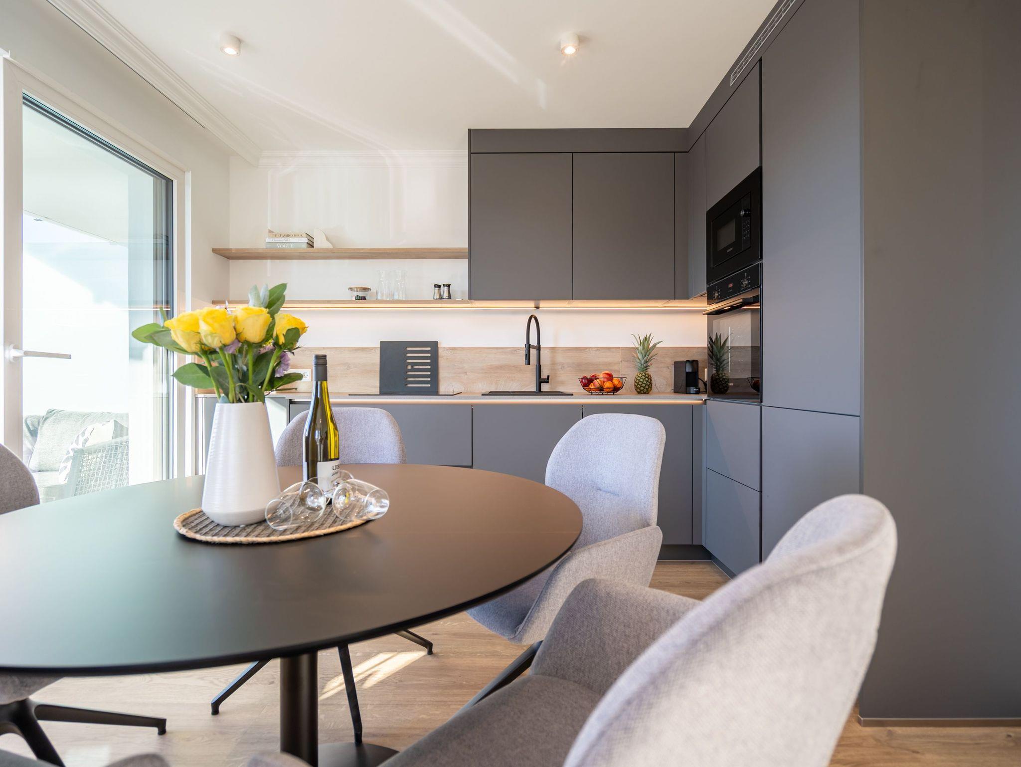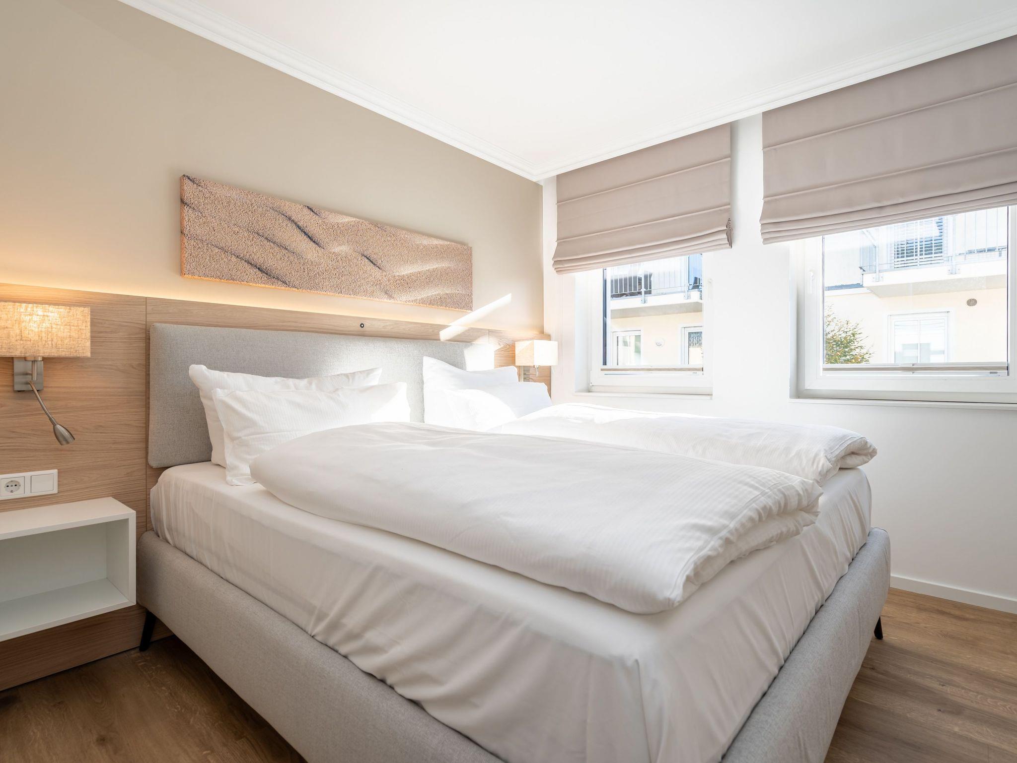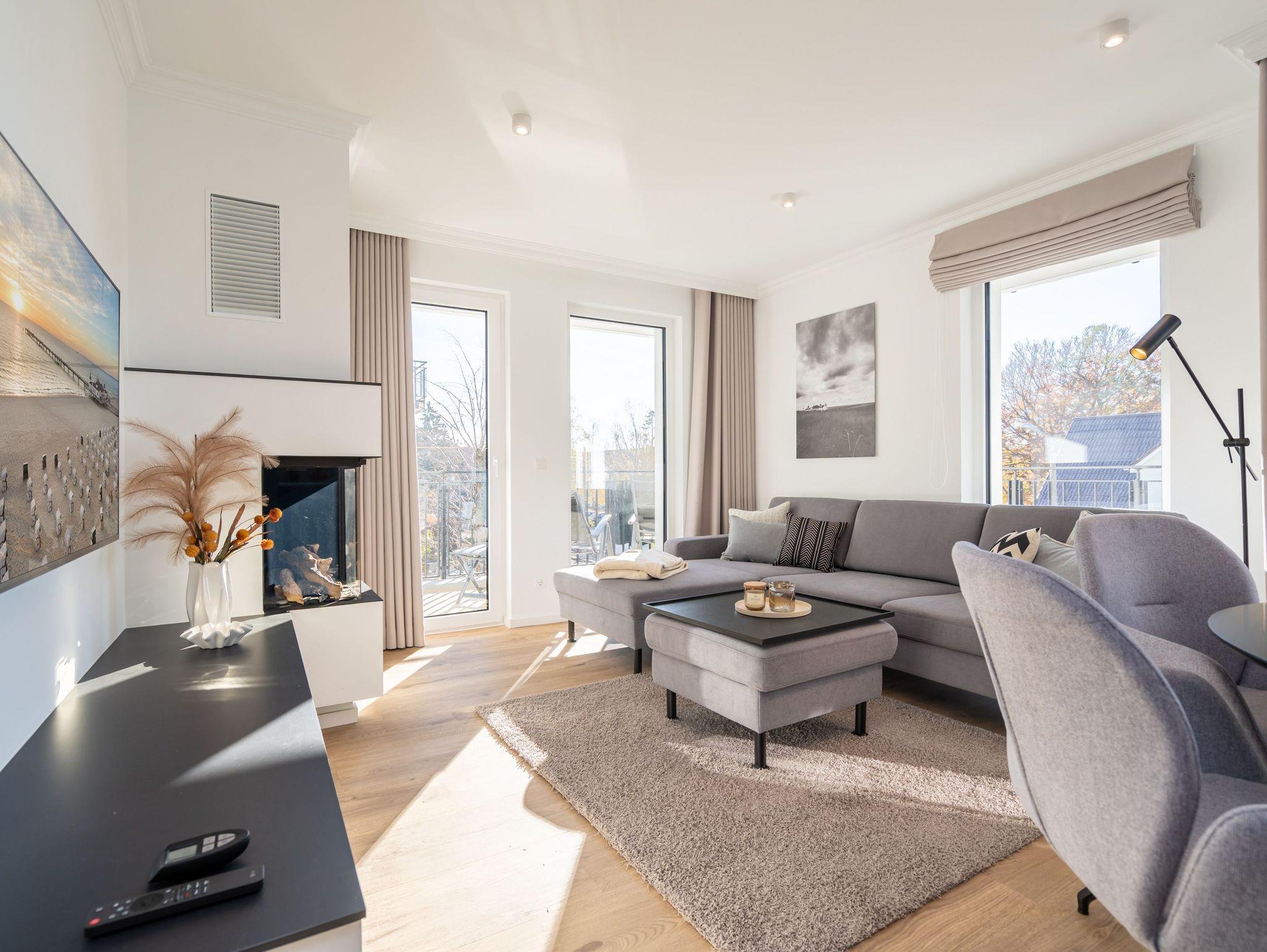 Ein stilvolles 3-Raum-Appartement mit 68 m² Wohnfläche in der zweiten Etage, das modernes Design und wohnliche Atmosphäre harmonisch verbindet. Ideal für bis zu vier Personen, die Komfort und eine hochwertige Ausstattung zu schätzen wissen. Der großzügige, lichtdurchflutete Wohnbereich präsentiert sich in eleganten Grautönen und lädt mit einer bequemen Sitzgruppe, Gas-Kamin (per Fernbedienung steuerbar) und 50-Zoll-Flachbild-TV zu entspannten Stunden ein. Die offene Küchenzeile ist perfekt ausgestattet mit Backofen, 3-Zonen-Induktionskochfeld samt integriertem Bora-Abzug, Spülmaschine und Kühlschrank mit Gefrierfach und wird durch einen modernen Essplatz ergänzt. Vom Wohnbereich führt der Zugang auf den sonnigen Süd-Ost-Balkon (10 m²) mit hochwertigen Gartenmöbeln ein idealer Ort für das Frühstück in der Morgensonne oder den Kaffee am Nachmittag. Beide Schlafzimmer sind mit komfortablen Boxspringbetten (180 × 200 cm), geräumigen Kleiderschränken und je einem Flat-TV ausgestattet. Das innenliegende Bad bietet eine ebenerdige Dusche, Waschtisch und WC. Ein zusätzliches Gäste-WC sorgt für extra Komfort. Ein Abstellraum mit Waschtrockner, ein Stellplatz in der Tiefgarage (Durchfahrthöhe 1,95m) sowie kostenfreies WLAN runden das Angebot ab. Ein hochwertiges Appartement mit klarer Linie und wohnlicher Eleganz perfekt für Gäste, die Wert auf Stil und Qualität legen.