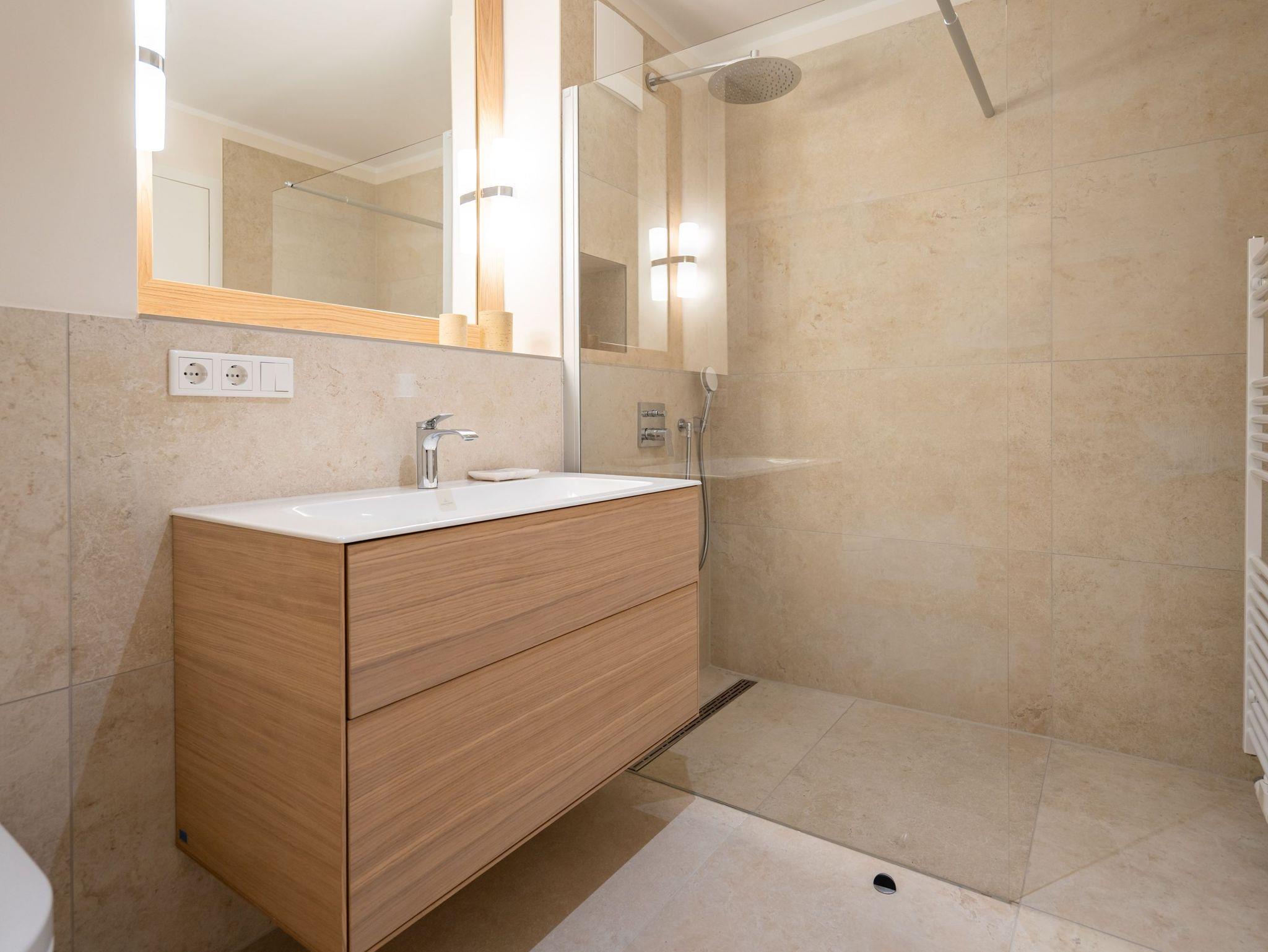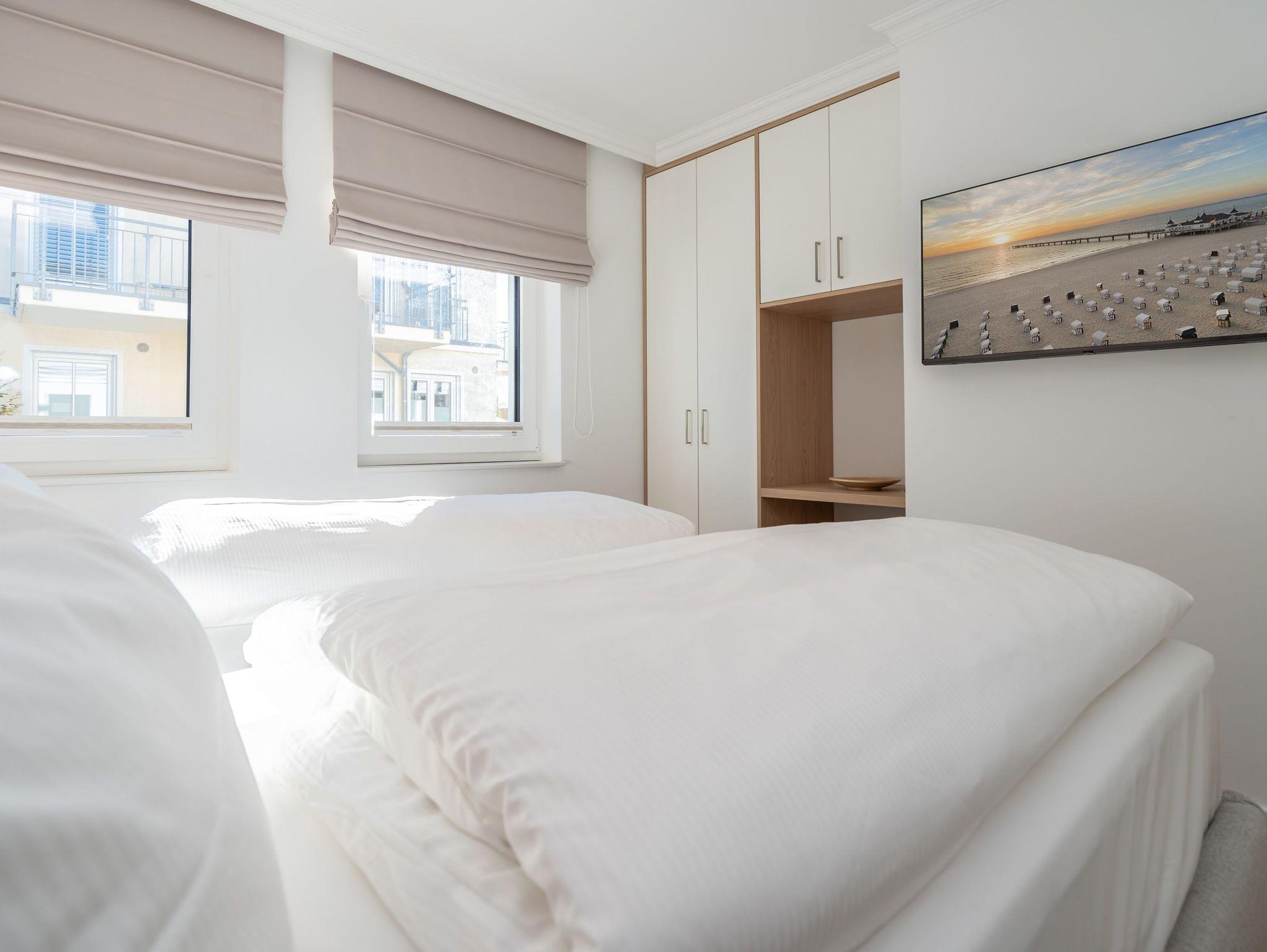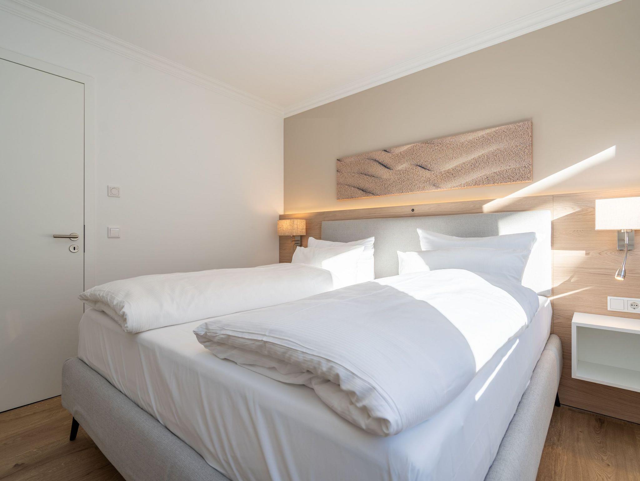 Ein stilvolles 3-Raum-Appartement mit 68 m² Wohnfläche in der zweiten Etage, das modernes Design und wohnliche Atmosphäre harmonisch verbindet. Ideal für bis zu vier Personen, die Komfort und eine hochwertige Ausstattung zu schätzen wissen. Der großzügige, lichtdurchflutete Wohnbereich präsentiert sich in eleganten Grautönen und lädt mit einer bequemen Sitzgruppe, Gas-Kamin (per Fernbedienung steuerbar) und 50-Zoll-Flachbild-TV zu entspannten Stunden ein. Die offene Küchenzeile ist perfekt ausgestattet mit Backofen, 3-Zonen-Induktionskochfeld samt integriertem Bora-Abzug, Spülmaschine und Kühlschrank mit Gefrierfach und wird durch einen modernen Essplatz ergänzt. Vom Wohnbereich führt der Zugang auf den sonnigen Süd-Ost-Balkon (10 m²) mit hochwertigen Gartenmöbeln ein idealer Ort für das Frühstück in der Morgensonne oder den Kaffee am Nachmittag. Beide Schlafzimmer sind mit komfortablen Boxspringbetten (180 × 200 cm), geräumigen Kleiderschränken und je einem Flat-TV ausgestattet. Das innenliegende Bad bietet eine ebenerdige Dusche, Waschtisch und WC. Ein zusätzliches Gäste-WC sorgt für extra Komfort. Ein Abstellraum mit Waschtrockner, ein Stellplatz in der Tiefgarage (Durchfahrthöhe 1,95m) sowie kostenfreies WLAN runden das Angebot ab. Ein hochwertiges Appartement mit klarer Linie und wohnlicher Eleganz perfekt für Gäste, die Wert auf Stil und Qualität legen.