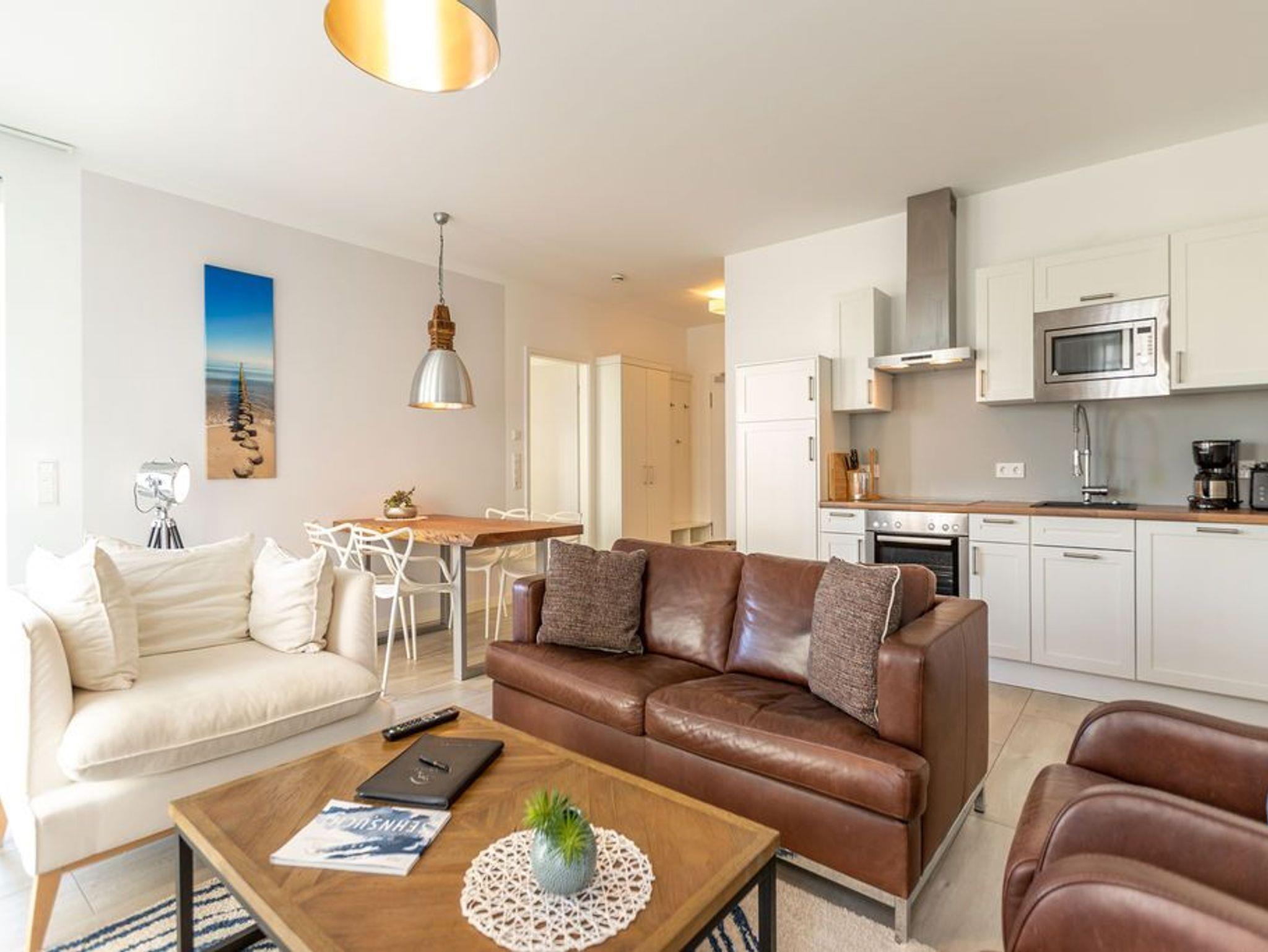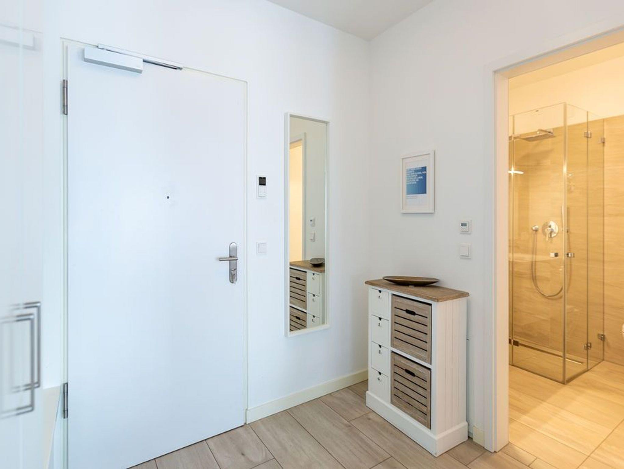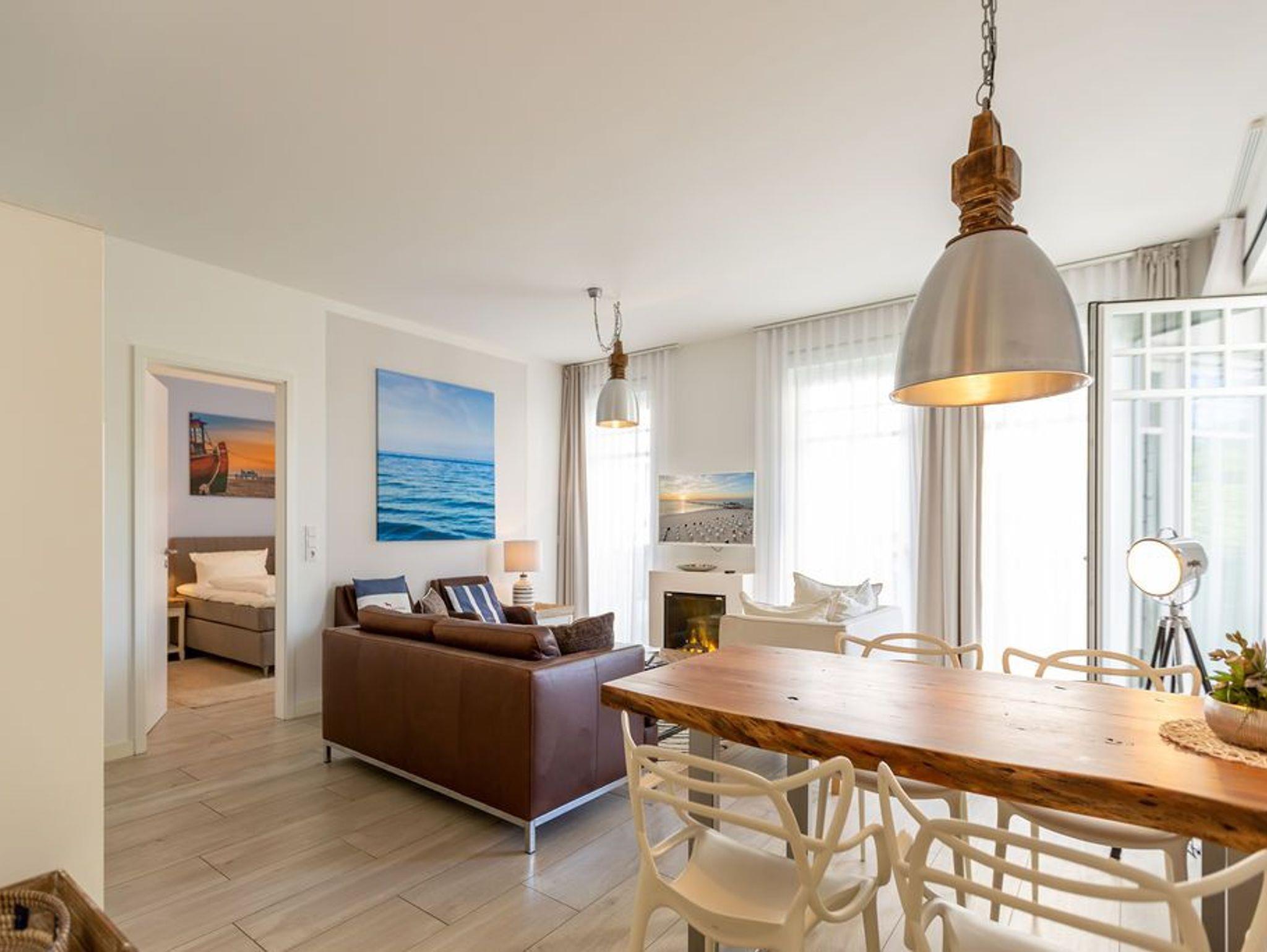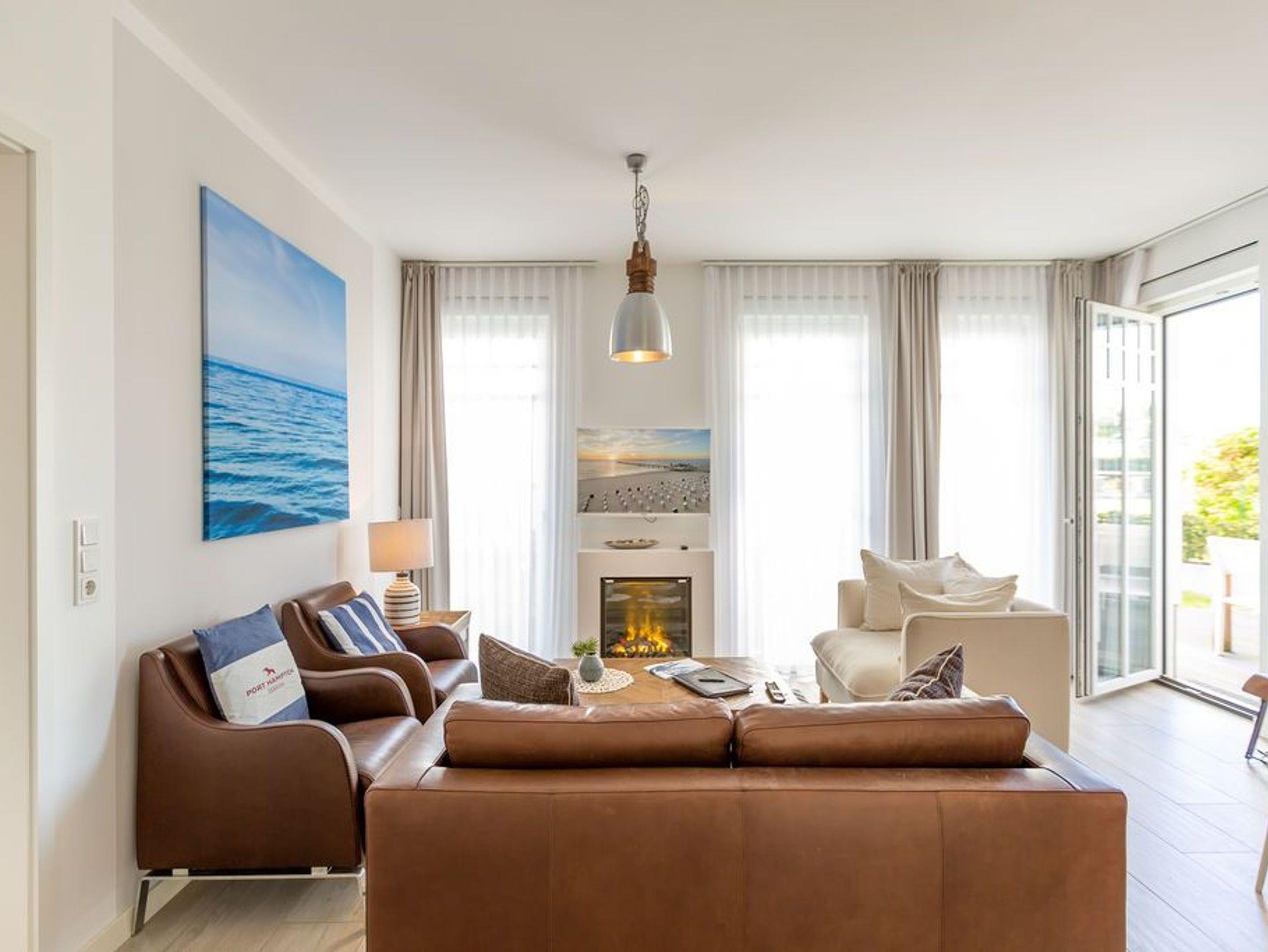 Nordisch nobel, mit einem Hauch von Industriechic präsentiert sich die 77 Quadratmeter große Ferienwohnung Nummer 5 im Erdgeschoss der Villa Westend. Sie empfängt ihre Besucher mit einem offenen und geschmackvoll eingerichteten Wohn- und Essbereich. Der hochwertige Esstisch mit großer Echtholzplatte und die skandinavischen Designstühle fallen dabei sofort ins Auge. Ebenso wie die gemütliche Sitzgruppe, die zum Relaxen vor dem Elektro-Kamin einlädt. Der zaubert ? egal ob nach einem winterfrischen Strandspaziergang oder einem sonnenreichen Sommerstrandtag ? mit seinen Flammen herrliches Wohlgefühl in Ihre Urlaubsabende. Per Knopfdruck mit oder ohne Wärme. Industrie-Designlampen setzen im Wohnraum stylische Akzente. Die offene Küche mit hochwertigen Elektrogeräten ist voll ausgestattet. Vom Wohnzimmer aus gelangen Sie auf die Terrasse, wo die Ostsee in nur 50 Metern Entfernung durch die Dünengräser glitzert. Zwei in harmonischen Farben gehaltene Schlafzimmer bieten in Boxspringdoppelbetten (1,80 m x 2,00 m) Platz für 4 Personen. In jedem Zimmer gibt es einen Flat-TV. Viel Platz für die Urlaubsgarderobe bietet je ein Kleiderschrank. In einem großen Wellnessbad, das von einem der beiden Schlafzimmer aus zugänglich ist, lässt es sich in der finnischen Sauna, der Badewanne oder unter der Regendusche wunderbar entspannen. Ein zweites Bad ist ebenfalls mit Dusche, WC und Waschtisch ausgestattet. Für den puren Urlaubsgenuss liegen Handtücher für Sie bereit und die Betten sind frisch bezogen. Es steht Ihnen ein Pkw-Stellplatz in der Tiefgarage zur Verfügung.
