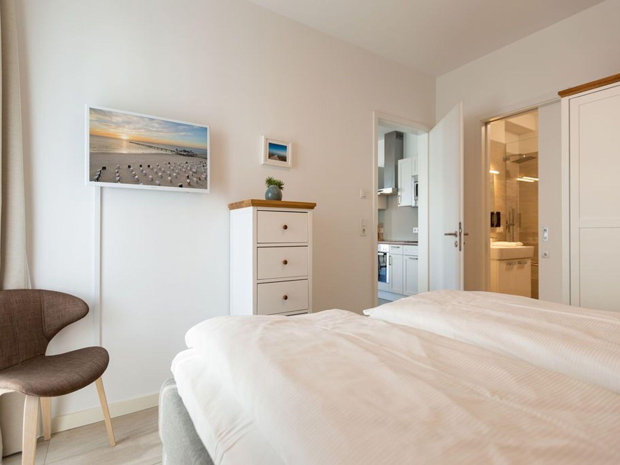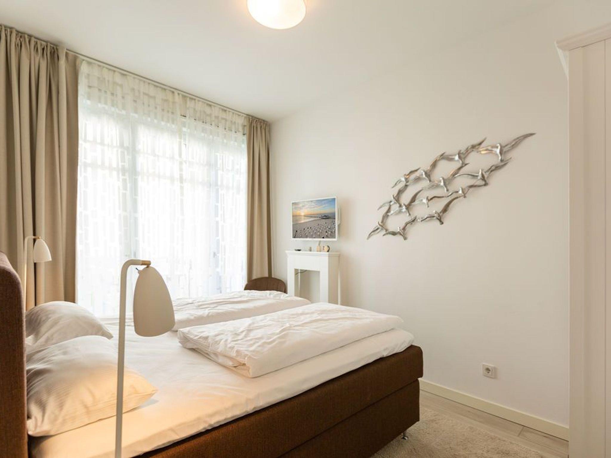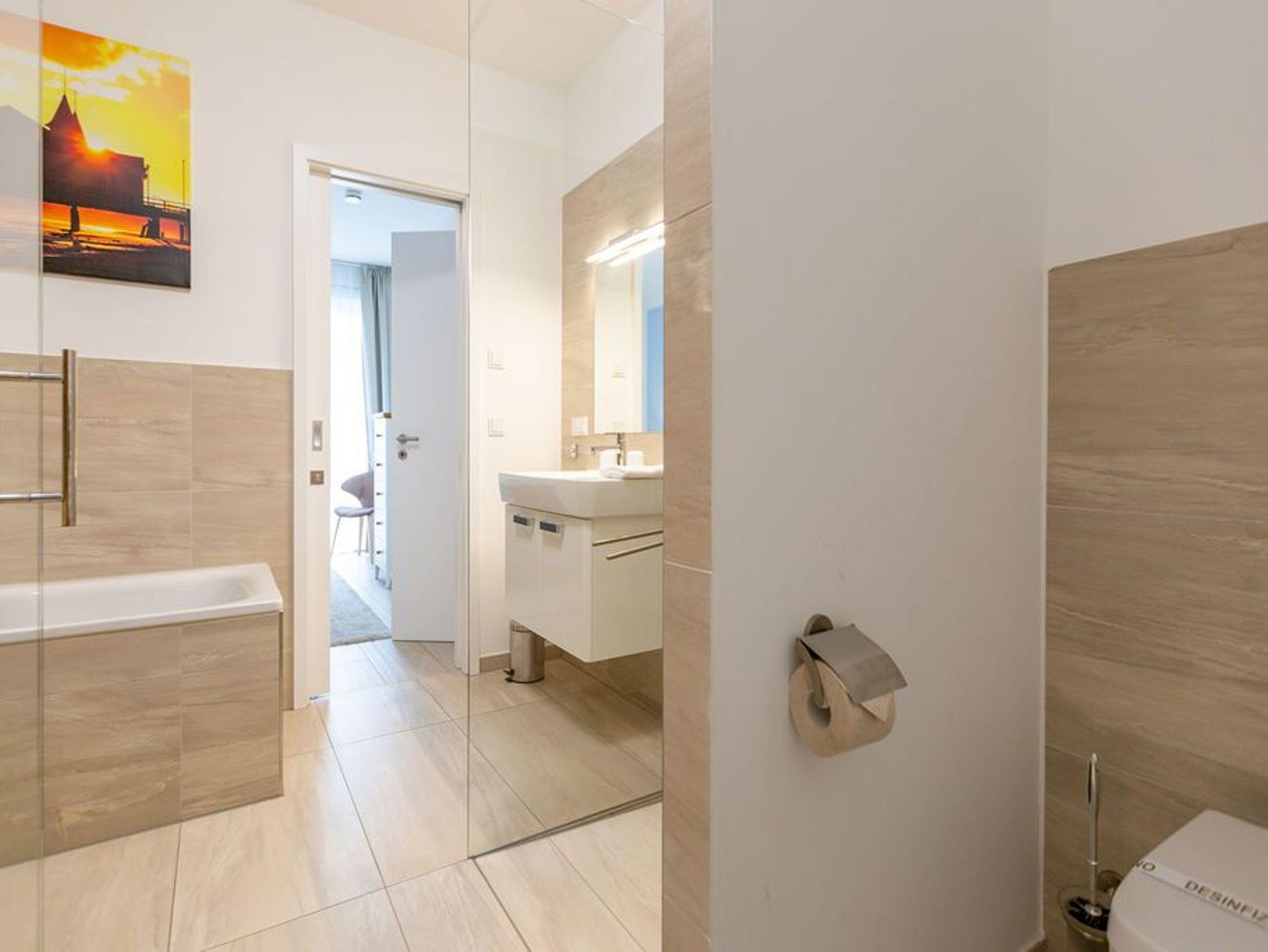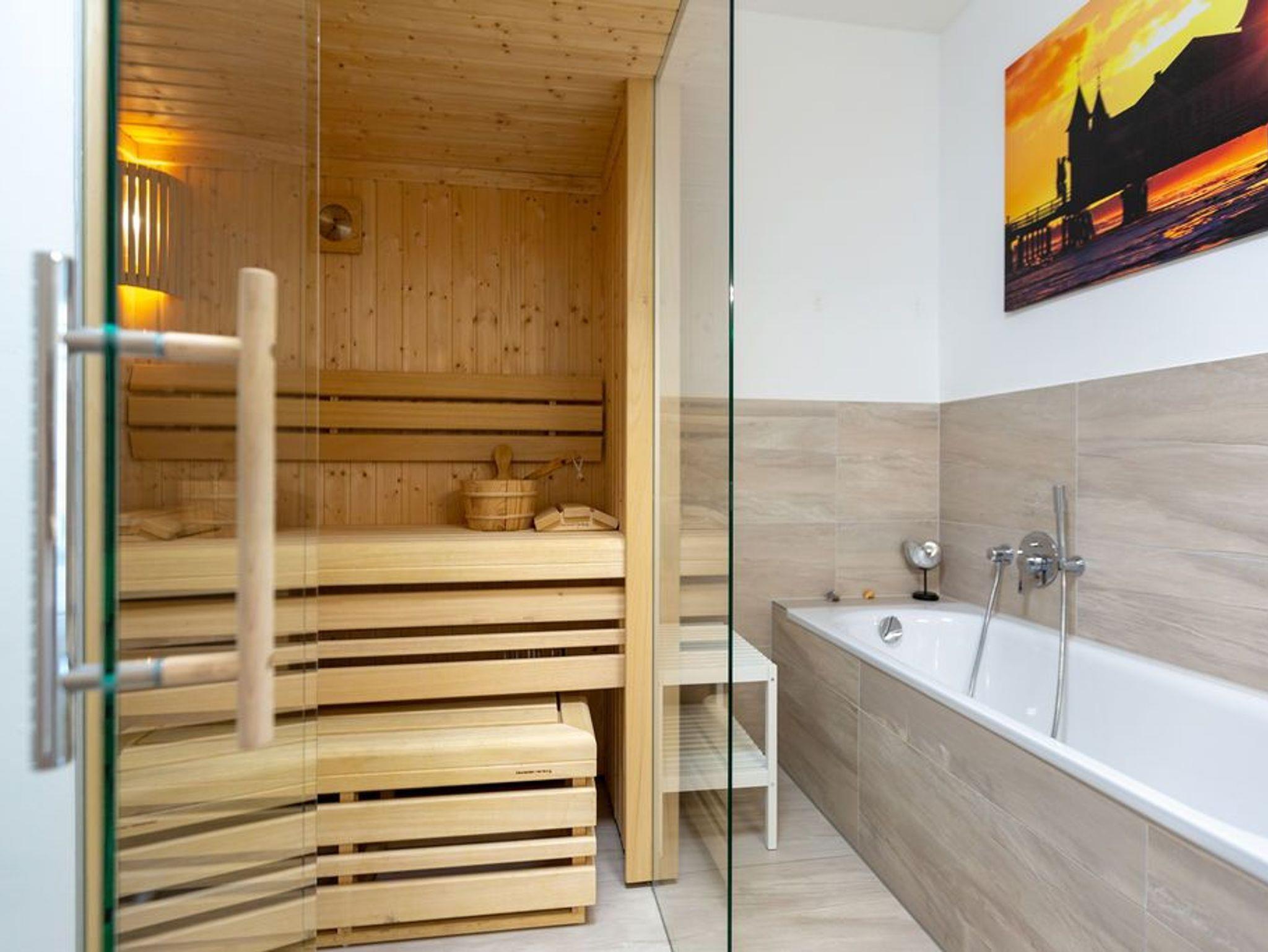 Nordisch nobel, mit einem Hauch von Industriechic präsentiert sich die 77 Quadratmeter große Ferienwohnung Nummer 5 im Erdgeschoss der Villa Westend. Sie empfängt ihre Besucher mit einem offenen und geschmackvoll eingerichteten Wohn- und Essbereich. Der hochwertige Esstisch mit großer Echtholzplatte und die skandinavischen Designstühle fallen dabei sofort ins Auge. Ebenso wie die gemütliche Sitzgruppe, die zum Relaxen vor dem Elektro-Kamin einlädt. Der zaubert ? egal ob nach einem winterfrischen Strandspaziergang oder einem sonnenreichen Sommerstrandtag ? mit seinen Flammen herrliches Wohlgefühl in Ihre Urlaubsabende. Per Knopfdruck mit oder ohne Wärme. Industrie-Designlampen setzen im Wohnraum stylische Akzente. Die offene Küche mit hochwertigen Elektrogeräten ist voll ausgestattet. Vom Wohnzimmer aus gelangen Sie auf die Terrasse, wo die Ostsee in nur 50 Metern Entfernung durch die Dünengräser glitzert. Zwei in harmonischen Farben gehaltene Schlafzimmer bieten in Boxspringdoppelbetten (1,80 m x 2,00 m) Platz für 4 Personen. In jedem Zimmer gibt es einen Flat-TV. Viel Platz für die Urlaubsgarderobe bietet je ein Kleiderschrank. In einem großen Wellnessbad, das von einem der beiden Schlafzimmer aus zugänglich ist, lässt es sich in der finnischen Sauna, der Badewanne oder unter der Regendusche wunderbar entspannen. Ein zweites Bad ist ebenfalls mit Dusche, WC und Waschtisch ausgestattet. Für den puren Urlaubsgenuss liegen Handtücher für Sie bereit und die Betten sind frisch bezogen. Es steht Ihnen ein Pkw-Stellplatz in der Tiefgarage zur Verfügung.
