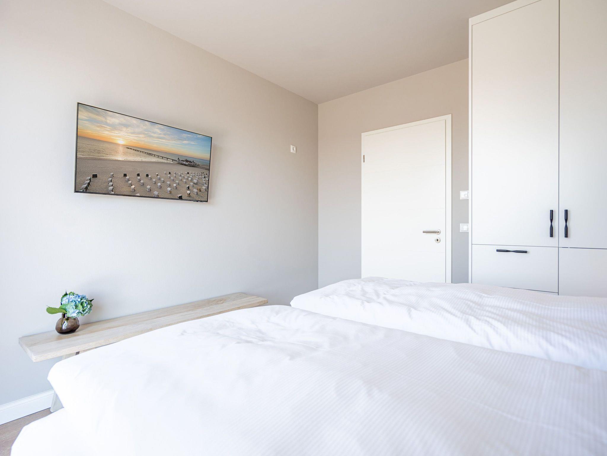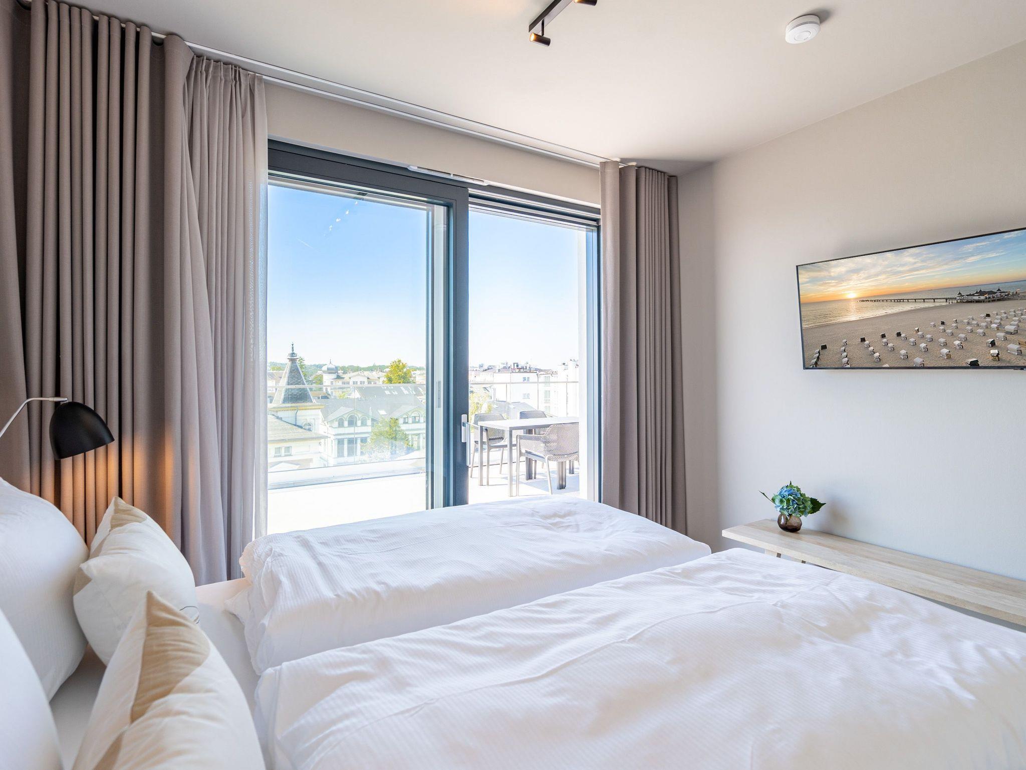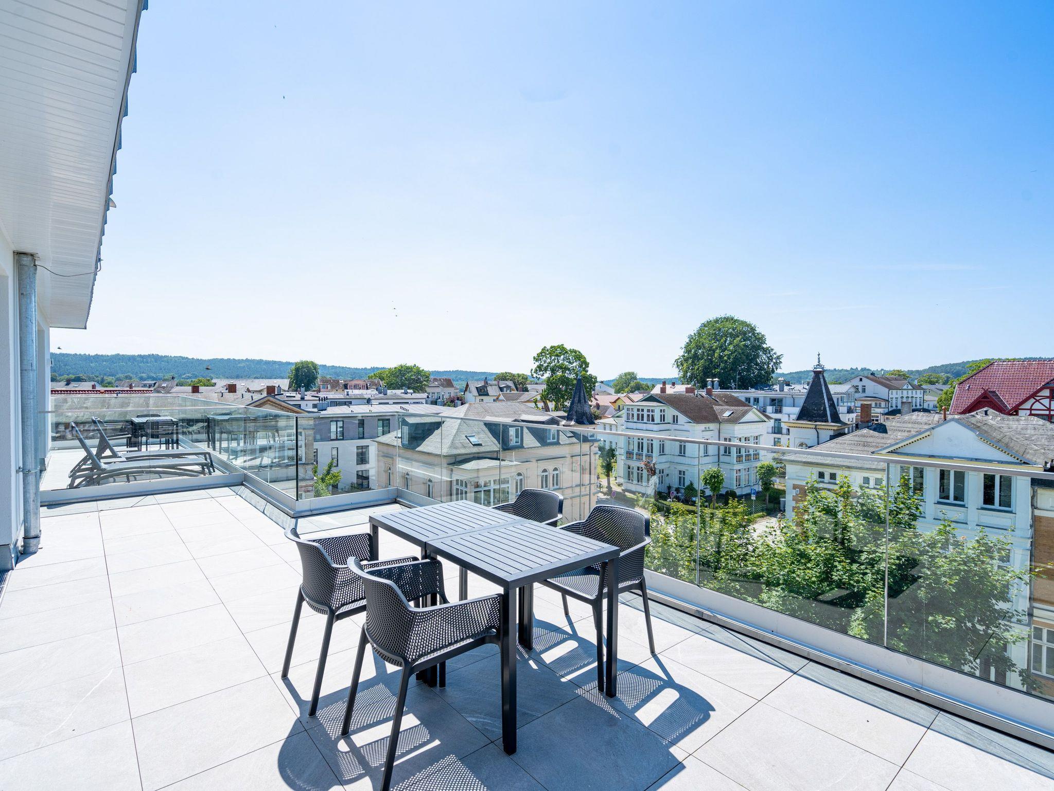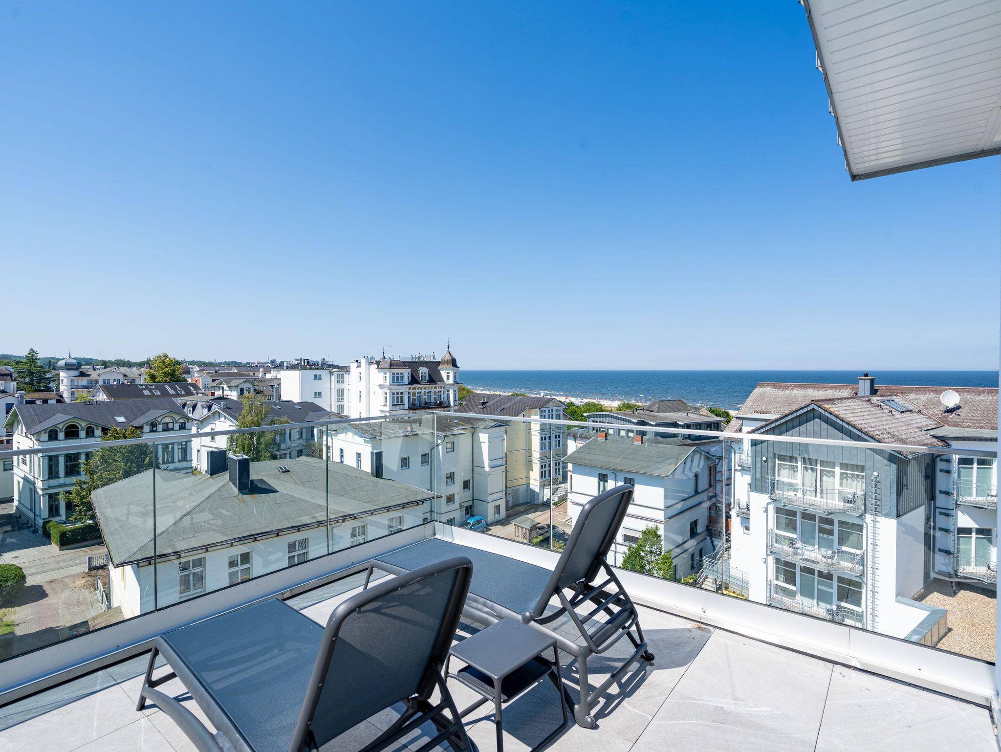Träume ich? Das werden Sie sich fragen, wenn Sie auf dem Nord-Westbalkon des 2-Raum-Appartements B 4.7 in der 4. Etage der Strandterrasse über die Ostsee bis zum Horizont schauen. Nein! Dieser Ausblick ist Realität. Blau macht glücklich. Dieser Anblick erst recht! Bis zu zwei Gäste werden sich in den großzügigen 62 Quadratmetern dieses Urlaubstraums so wohl fühlen, dass sie sich in die charmante Ferienwohnung glatt verlieben. Ein schönes Wohn-Esszimmer bietet allen Komfort, den man sich für eine entspannte Auszeit nur wünschen kann. Das Interieur wurde mit viel Liebe eingerichtet und sorgt für eine gemütliche Atmosphäre. Dazu ist die Wohnung mit allen modernen Annehmlichkeiten ausgestattet. So zum Beispiel einer hochwertigen Küche mit Siemens-Elektrogeräten. Dazu zählen ein Backofen, ein 3-Platten-Induktionsherd sowie eine Nespresso-Kapselmaschine. Ein kuscheliges Sofa ist eine bequeme Ruhezone. Ob beim Träumen vor dem Elektrokamin (ohne Wärmeabgabe) oder beim Streamen eines spannenden Films auf dem großen Flat-TV (50 Zoll) ? hier kommen Sie auf alle Fälle runter und können neue Energie tanken. Ein großer Balkon lädt zum ausgiebigen Sonnenbaden auf den Liegen oder zum Essen unter freiem Himmel ein. Hier lässt es sich an sonnigen Tagen ? und von denen hat Usedom sehr, sehr viele zu bieten ? bestens aushalten. Lassen Sie den Blick über die Ostsee und die Dächer des Seebades schweifen. Genauso harmonisch wie das Wohnzimmer ist auch das Schlafzimmer eingerichtet. Ein komfortables Boxspringdoppelbett (1,80m x 2,00m), ein geräumiger Kleiderschrank und ein weiterer Flat-TV (43 Zoll) gehören hier zur Ausstattung. Der Zugang zur Dachterrasse ermöglicht es Ihnen, morgens von der frischen Meeresluft geweckt zu werden und den Tag mit einem atemberaubenden Blick zu beginnen. Das moderne Tageslicht-Badezimmer verfügt über eine Dusche, einen Waschtisch und ein WC. Damit Sie schon entspannt im Urlaubsziel ankommen, steht Ihnen in der Tiefgarage ein PKW-Stellplatz zur Verfügung. Dann kann es also losgehen mit der Zeit, in der Sie Hektik und Stress gegen Entschleunigung und Entspannung eintauschen.