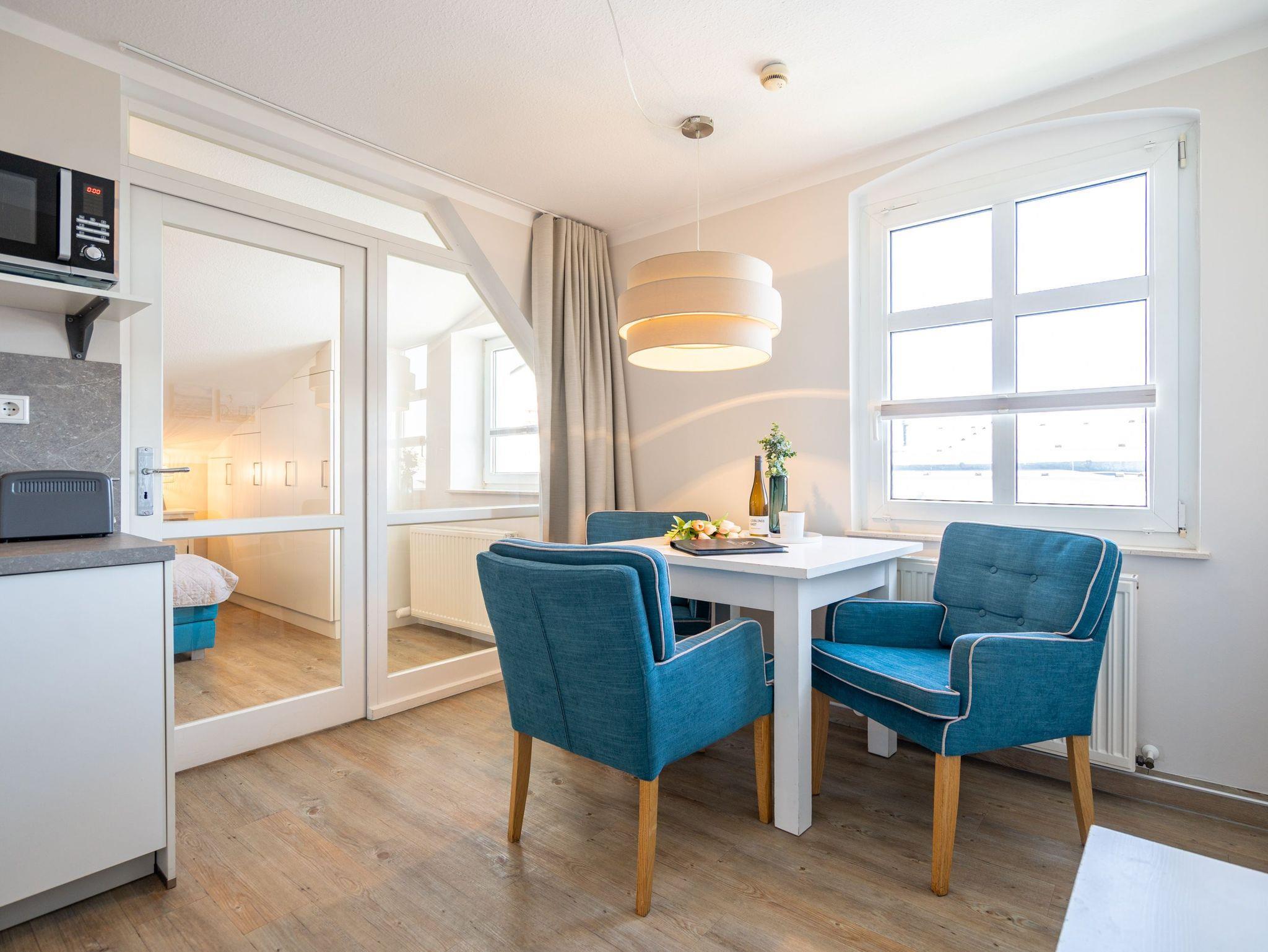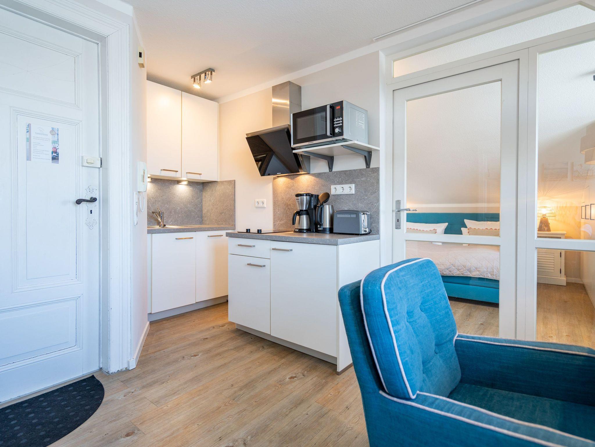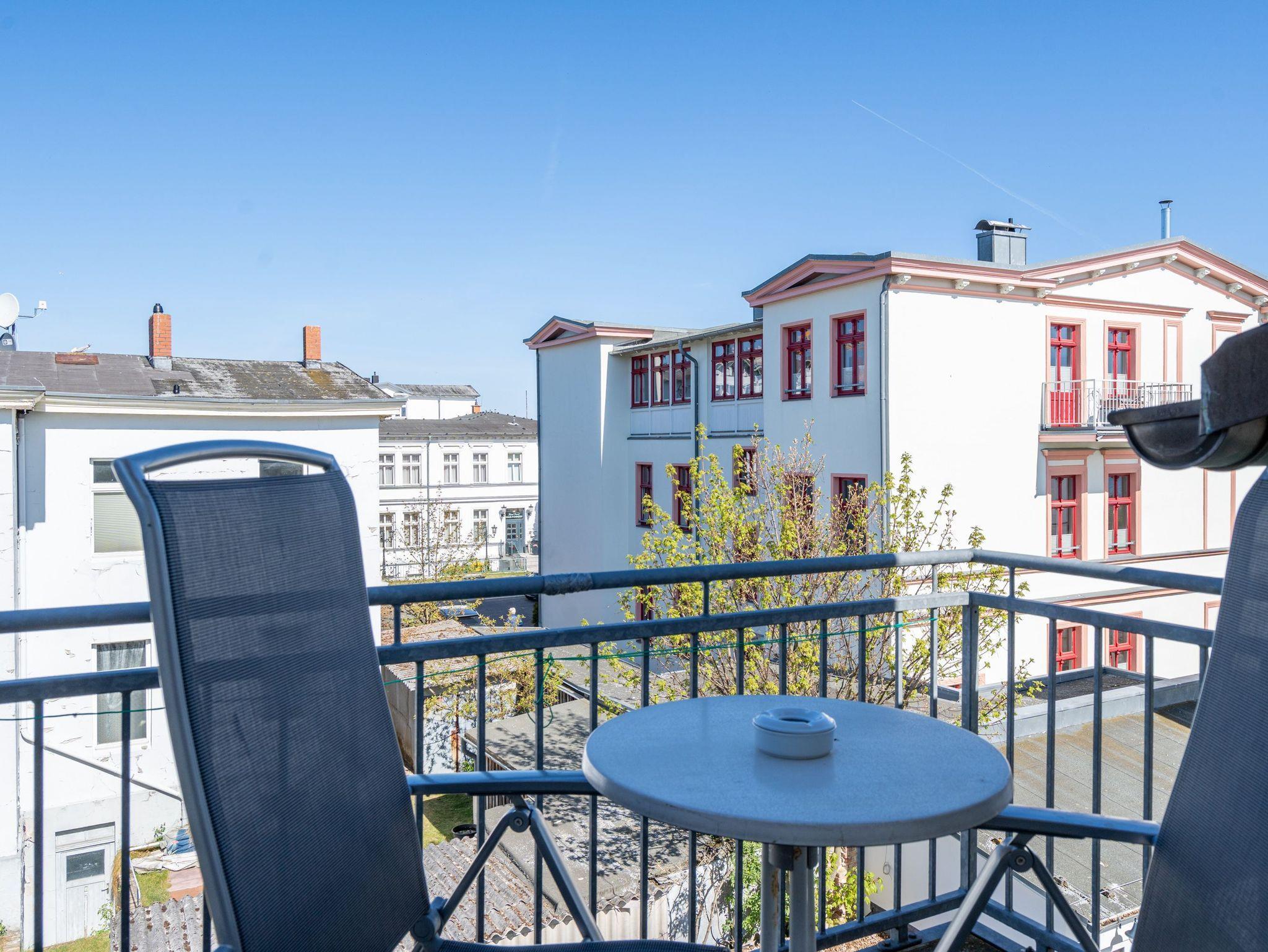 Heimelig wohnen unter dem Dach der Villa Albertine! Freuen Sie sich auf ein gemütliches 1,5-Raum-Appartement (36 qm) mit Suite Charakter. Neu gestaltet und mit modernen Möbeln ausgestattet ist es ein ideales Urlaubziel für 2 Personen. Der helle Wohn-/Schlafbereich ist mit einem komfortablen Boxspringdoppelbett (1,80m x 2,00m), Flat-TV und zwei bequemen Ohrensesseln ausgestattet. Von hier aus hat man Zugang zum Westbalkon mit kleiner Sitzgruppe. Die separate Küche (2-Platten-Cerankochfeld, Geschirrspüler und Mikrowelle) verfügt über einen schönen Essplatz. Von hier können Sie auf die Ostsee blicken. Ein Bad mit Dusche rundet dieses Appartement ab. Ein PKW-Stellplatz Nr. 10 befindet sich unter einem Carport direkt auf dem Grundstück.