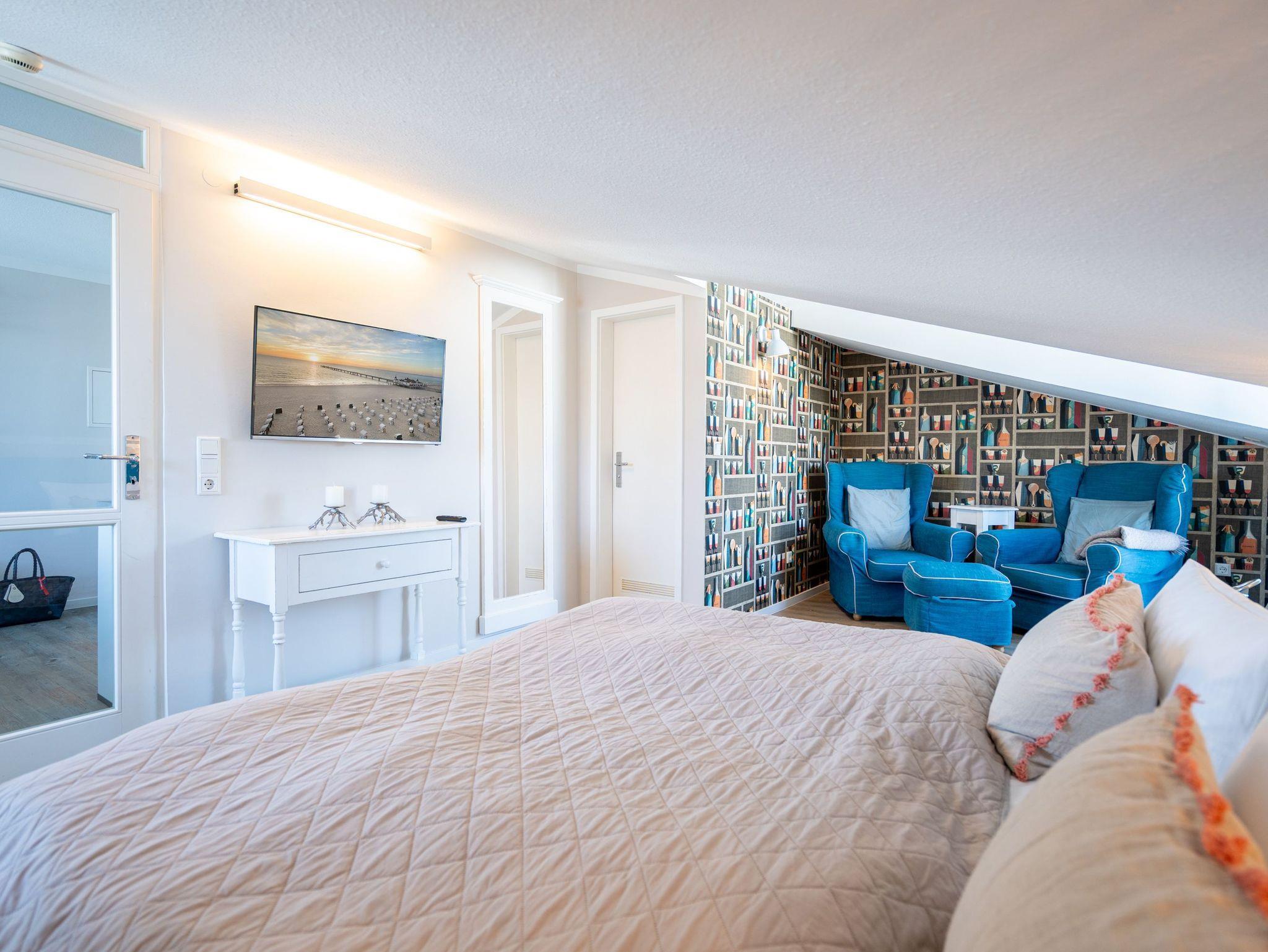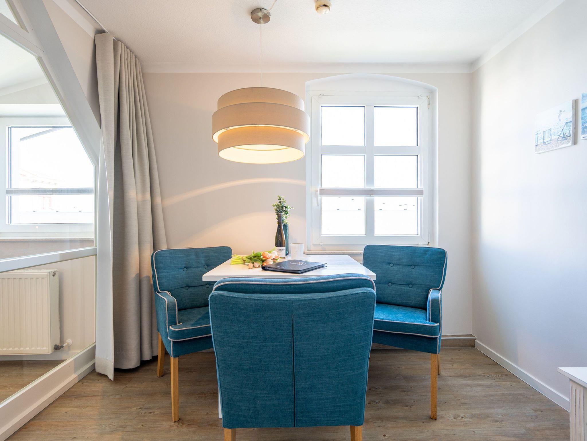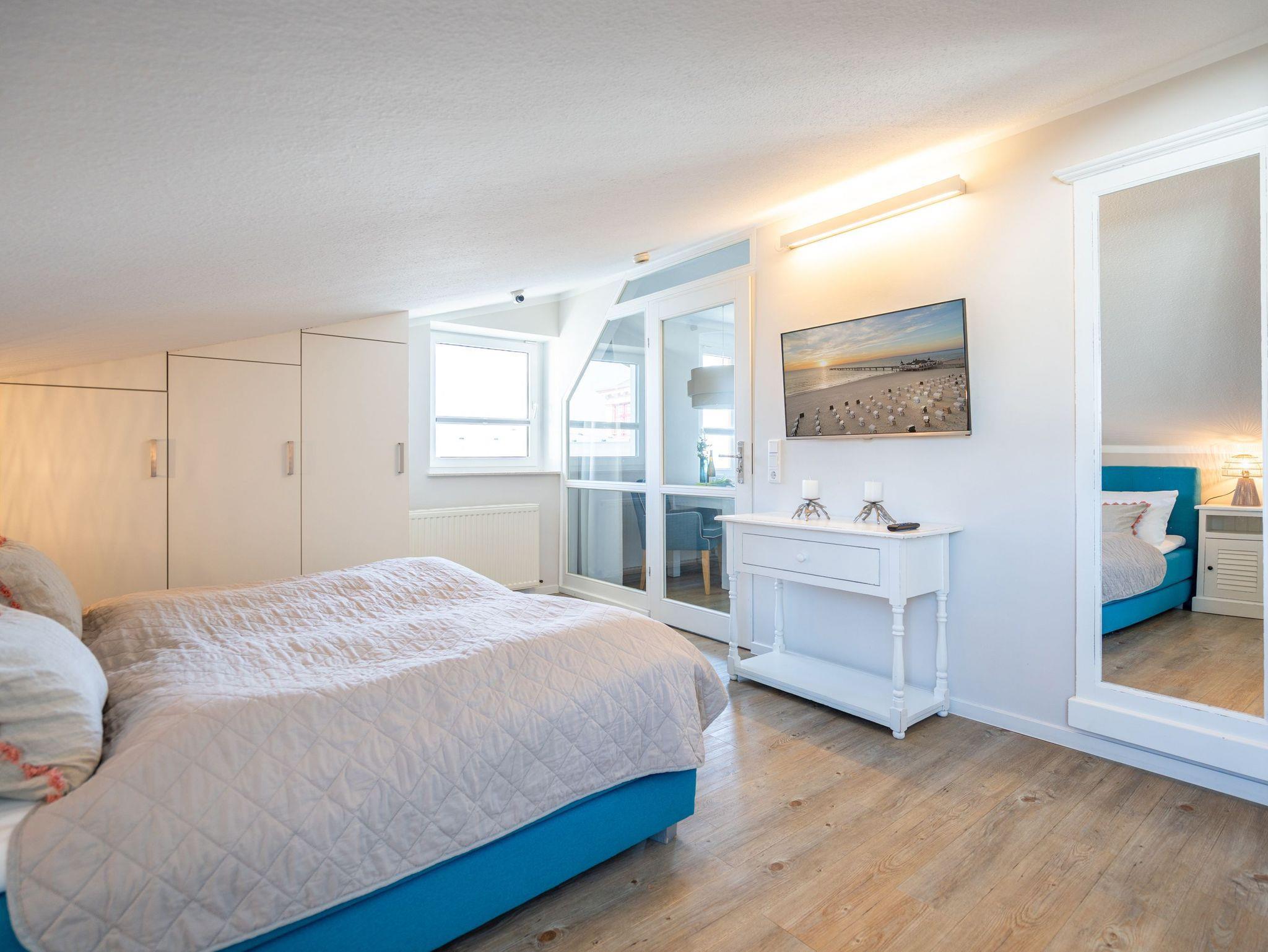 Heimelig wohnen unter dem Dach der Villa Albertine! Freuen Sie sich auf ein gemütliches 1,5-Raum-Appartement (36 qm) mit Suite Charakter. Neu gestaltet und mit modernen Möbeln ausgestattet ist es ein ideales Urlaubziel für 2 Personen. Der helle Wohn-/Schlafbereich ist mit einem komfortablen Boxspringdoppelbett (1,80m x 2,00m), Flat-TV und zwei bequemen Ohrensesseln ausgestattet. Von hier aus hat man Zugang zum Westbalkon mit kleiner Sitzgruppe. Die separate Küche (2-Platten-Cerankochfeld, Geschirrspüler und Mikrowelle) verfügt über einen schönen Essplatz. Von hier können Sie auf die Ostsee blicken. Ein Bad mit Dusche rundet dieses Appartement ab. Ein PKW-Stellplatz Nr. 10 befindet sich unter einem Carport direkt auf dem Grundstück.