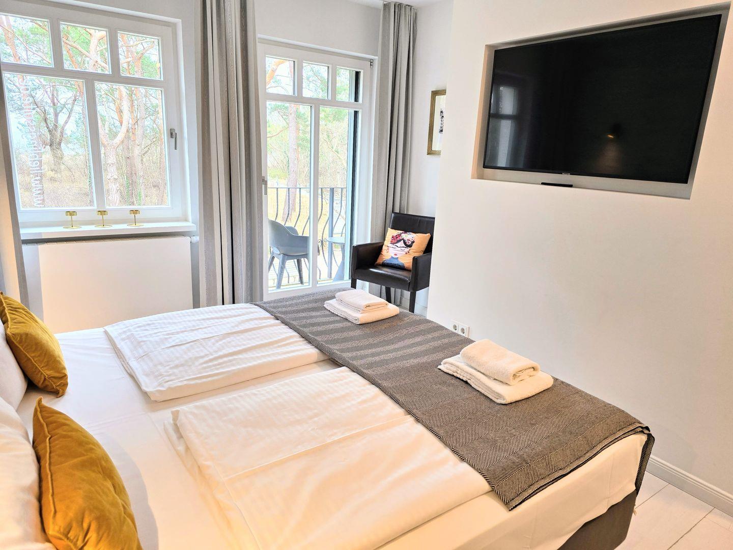 Die Lieblingssuite hat Meerblick. Dieser ist allerdings deutlich eingeschränkt durch die Bepflanzung zwischen Promenade und Strand. Je nach Jahreszeit und Stand des Rückschnitts durch die Gemeinde sieht man die Ostsee mal mehr und mal weniger durch die Bäume glitzern.