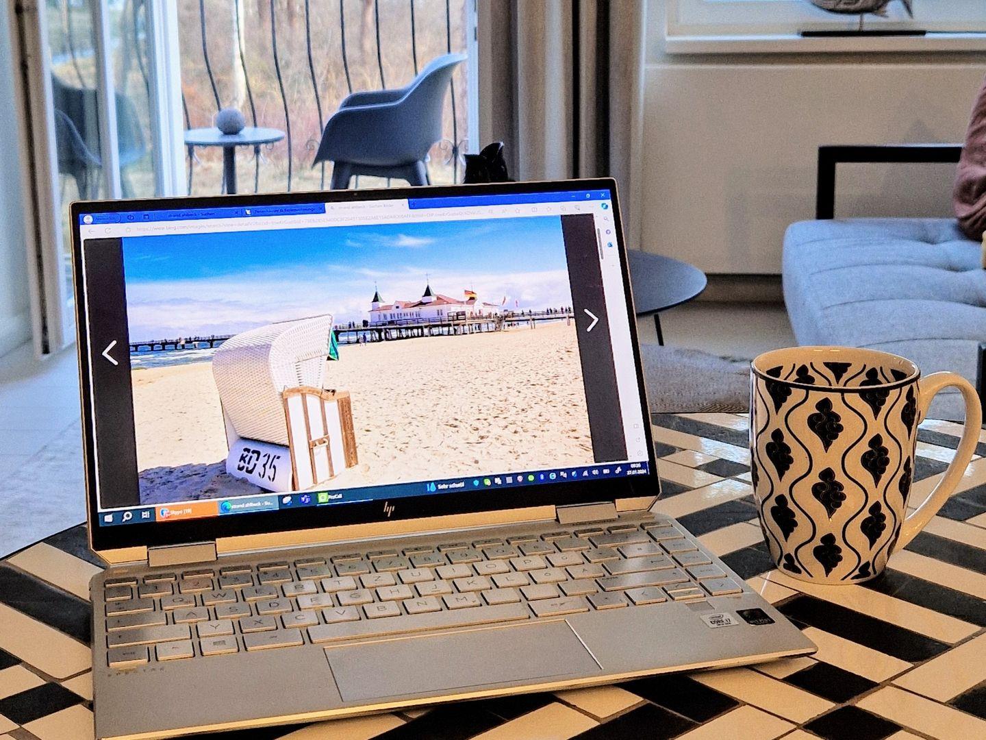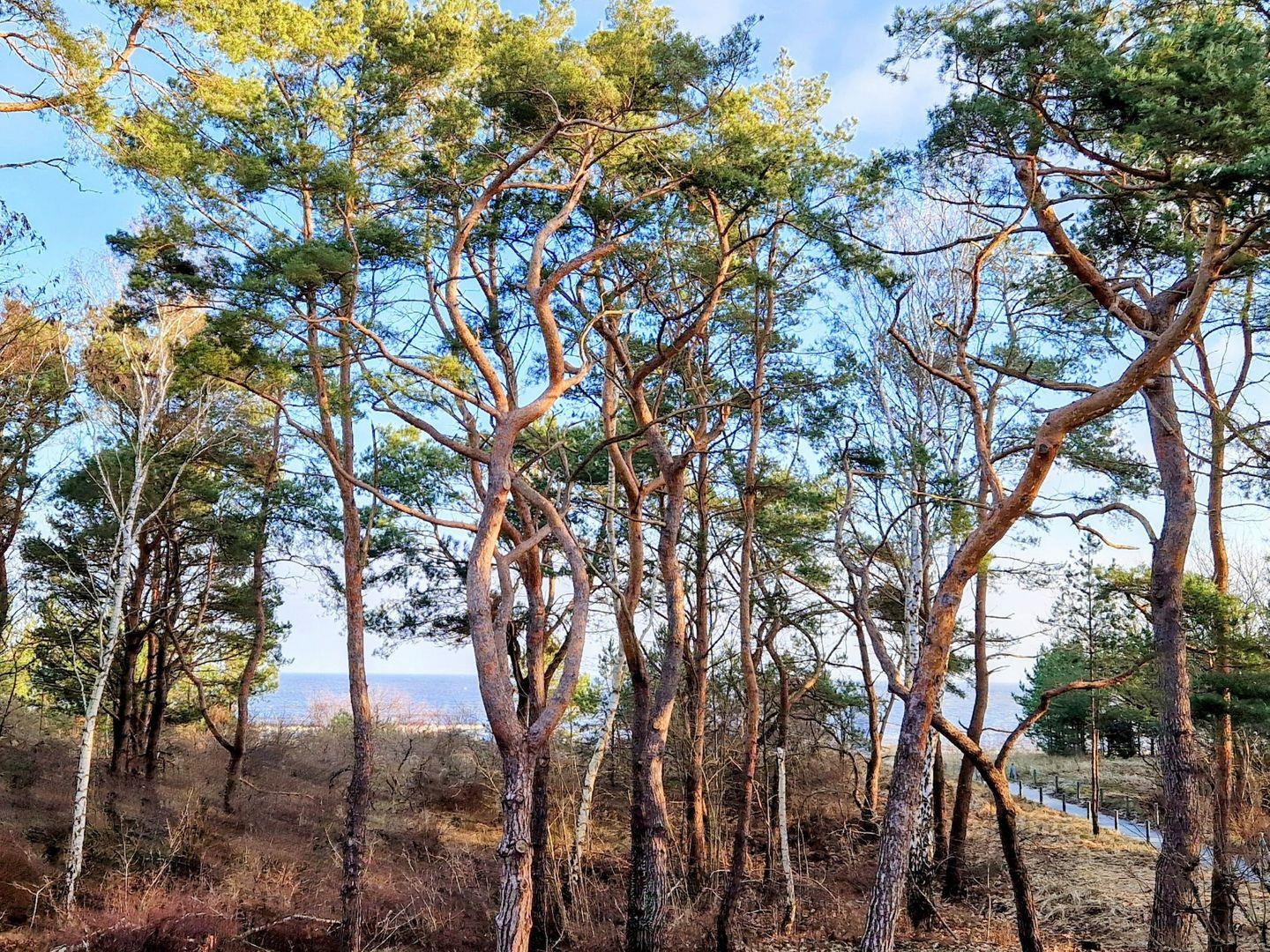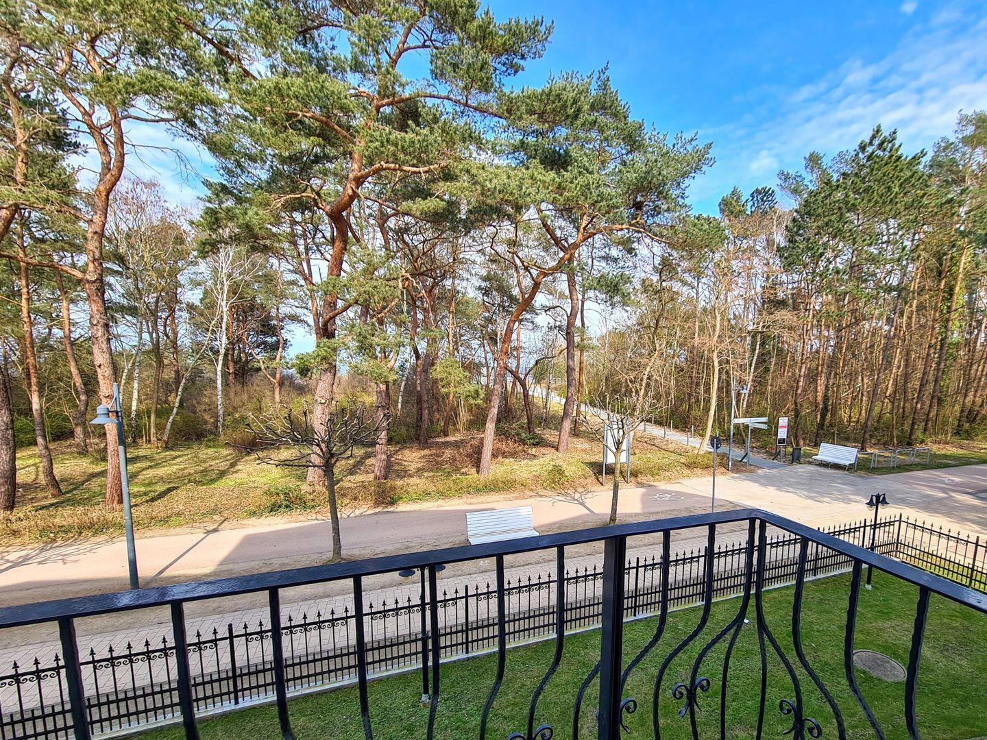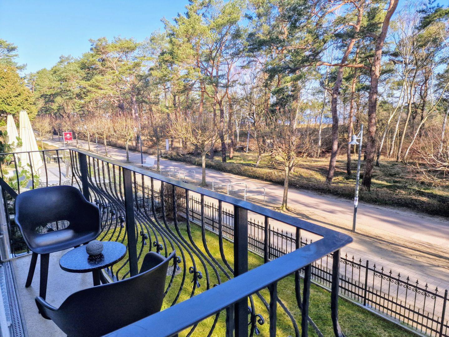 Die Ostsee kann man durch die wunderschönen, pinienartigen Strandkiefern hindurch glitzern sehen und der Blick vom Balkon auf die Promenade ist immer interessant.