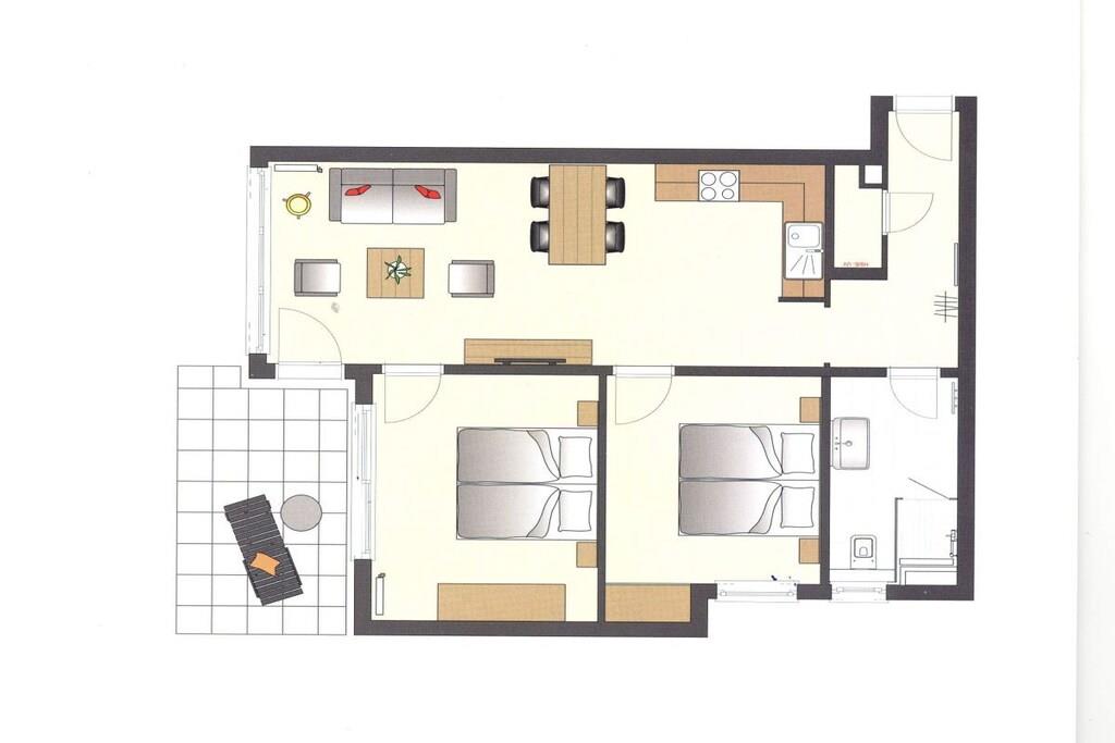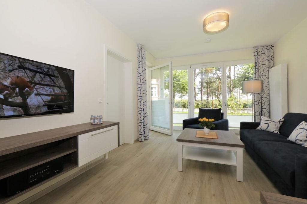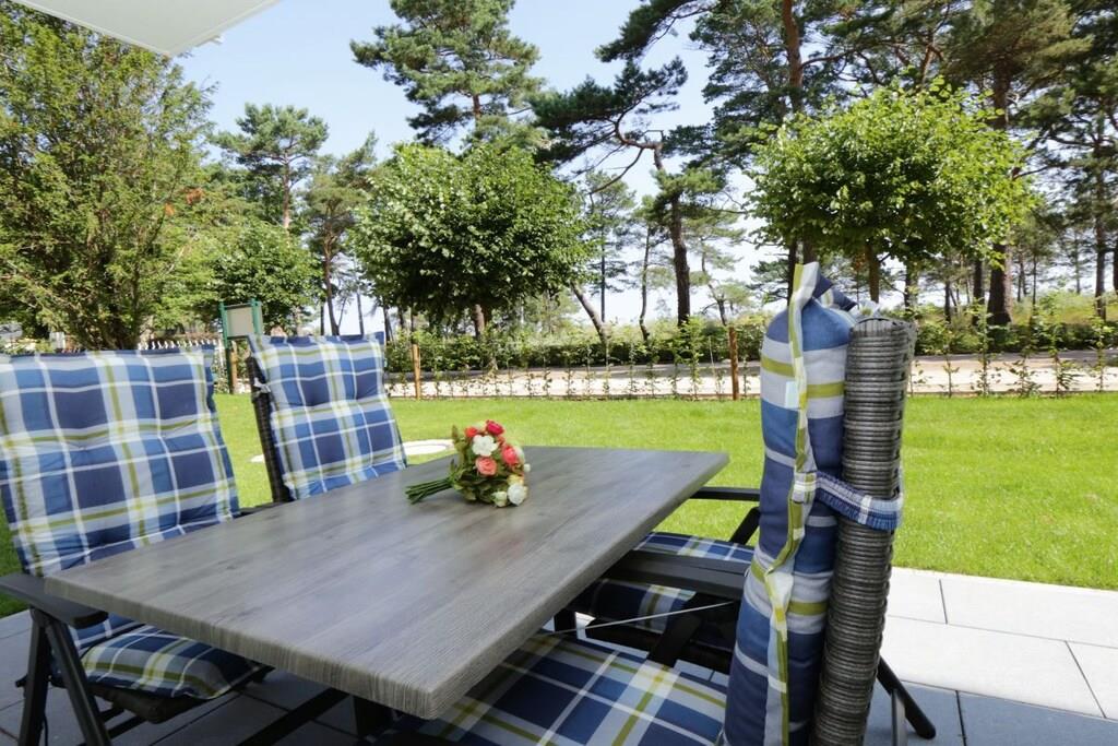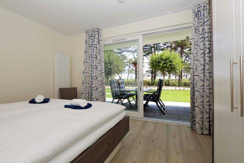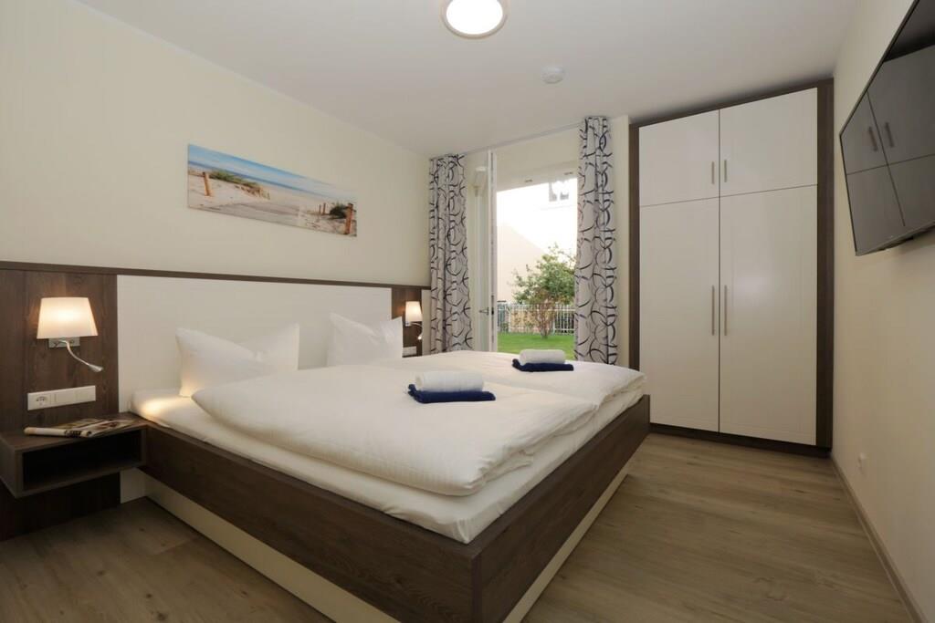 Der hell eingerichtete Wohnraum im Erdgeschoss verfügt über eine gemütliche Sitzecke (mit Schlaffunktion) und einen separaten Essplatz. Von der Terrasse haben Sie einen Blick auf die Dünen. Eine im Wohnbereich integrierte Küchenzeile mit Geschirrspüler, Backofen, Mikrowelle p.p lässt auch für den Hobbykoch keine Wünsche offen. Die zwei Schlafzimmer sind mit Doppelbett und genügend Schrankraum ausgestattet. Ein Duschbad sowie eine Terrasse runden diese Ferienwohnung ab. TV und Radio stehen zur Nutzung bereit. Der Pkw-Stellplatz befindet sich in der Tiefgarage und ist der Ferienwohnung zugeordnet. Fahrräder können im Keller untergestellt werden. Von Oktober bis März können Sie die Sauna zu bestimmten Zeiten nutzen.