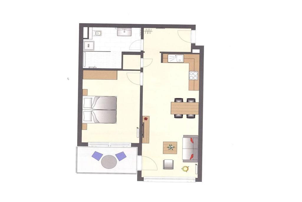 Der hell eingerichtete Wohnraum in der ersten Etage verfügt über eine gemütliche Sitzecke (mit Schlaffunktion) und einen separaten Essplatz. Von der Terrasse haben sie Meerblick. Eine im Wohnbereich integrierte Küchenzeile mit Geschirrspüler, Backofen, Mikrowelle p.p läßt auch für den Hobbykoch keine Wünsche offen. Das Schlafzimmer ist mit Doppelbett und genügend Schrankraum ausgestattet. Ein Duschbad sowie eine Terrasse runden diese Ferienwohnung ab. TV und Radio stehen zur Nutzung bereit. Der Pkw-Stellplatz befindet sich in der Tiefgarage und ist der Ferienwohnung zugeordnet. Fahrräder können im Keller untergestellt werden. Von Oktober bis März können Sie die Sauna zu bestimmten Zeiten nutzen.