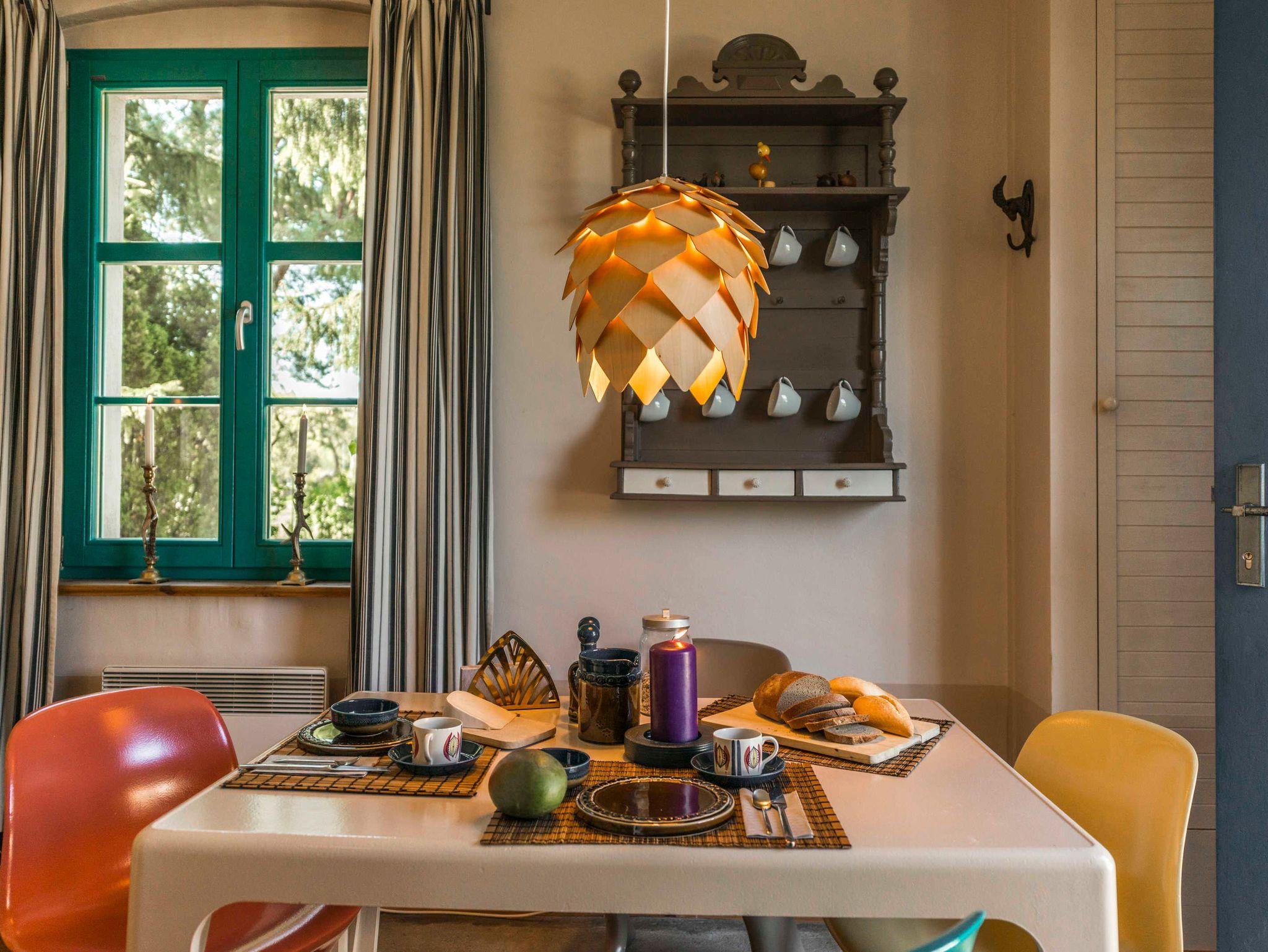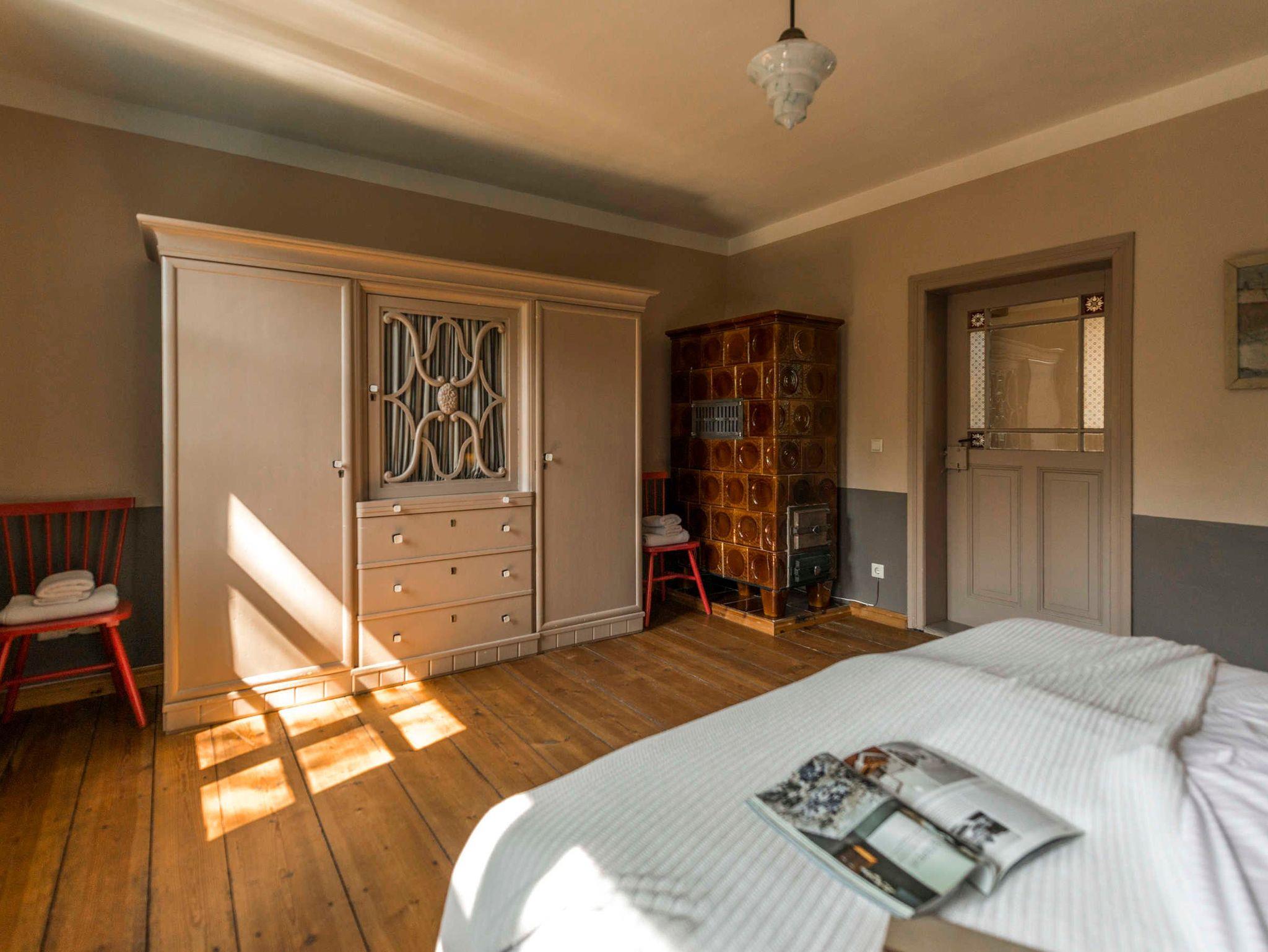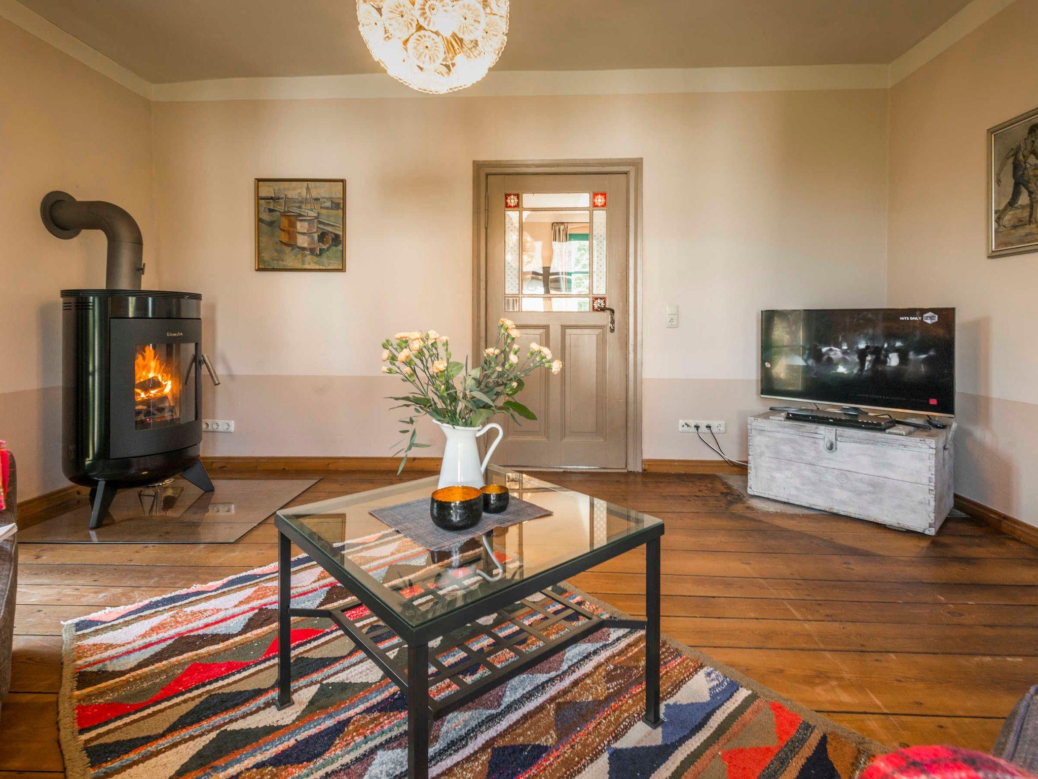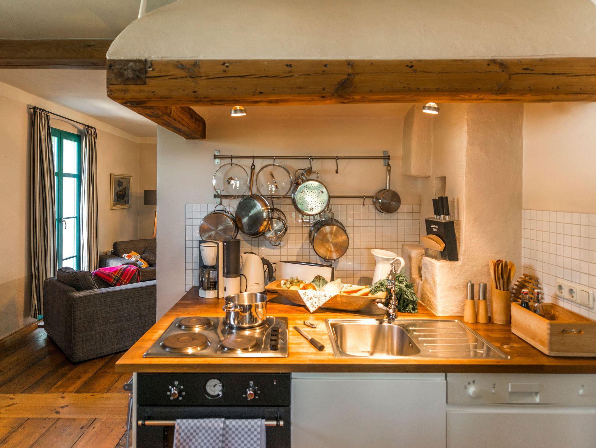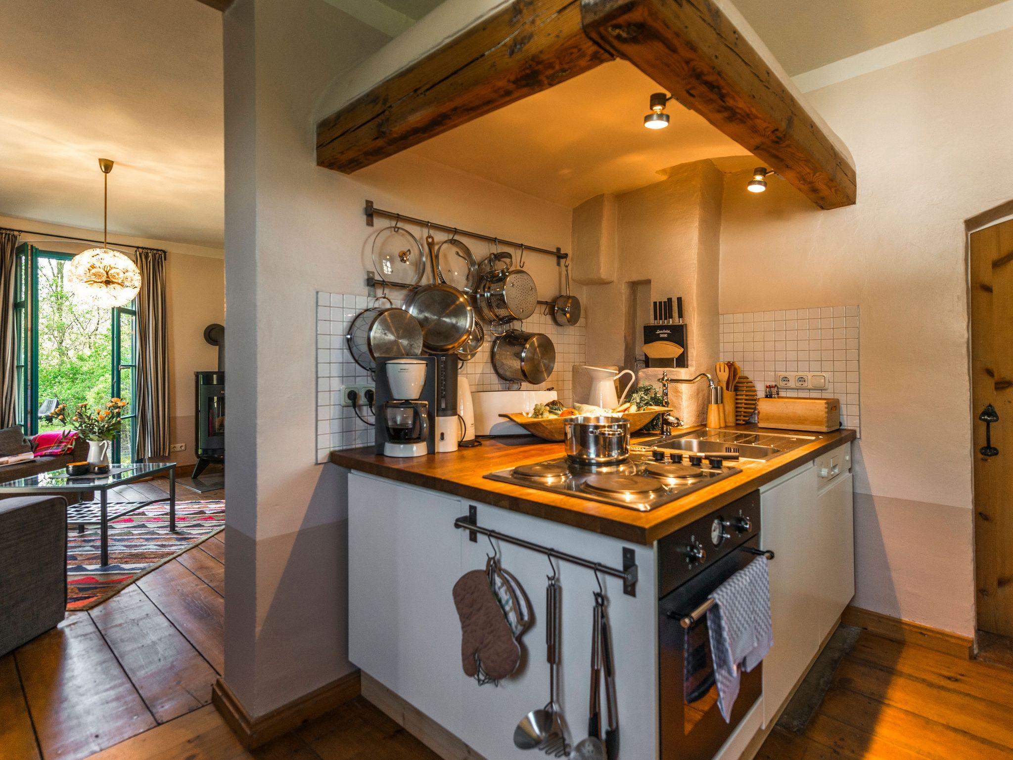 Im Haus erwartet Sie eine sehr individuelle Ausstattung mit sanften Farben, antikem und modernem Mobiliar und mit Kunst, welche auf den ländlichen Charakter des Hofs verweist. Zwei Schlafzimmer für zusammen 3 Personen stehen zur Verfügung. Der Wohnraum mit gemütlicher Wohnlandschaft, Kaminofen und TV geht nahtlos ins Esszimmer über, welches mit einer Besonderheit ausgestattet ist: eine seltene historische Esse, in die die komplett ausgestattete Küchenzeile integriert wurde. Das kleine, modern ausgestattete Duschbad rundet die Ausstattung des Hauses ab. Überall im Haus und auf der Terrasse steht Ihnen kostenfreies WLAN zur Verfügung. Einige Dinge des Originalinventars des Hauses wie z.B. eine hübsche Jugendstil-Kinderbank tauchten bei Aufräumarbeiten im Zuge der Renovierung wieder auf und konnten für die Neumöblierung verwendet werden.