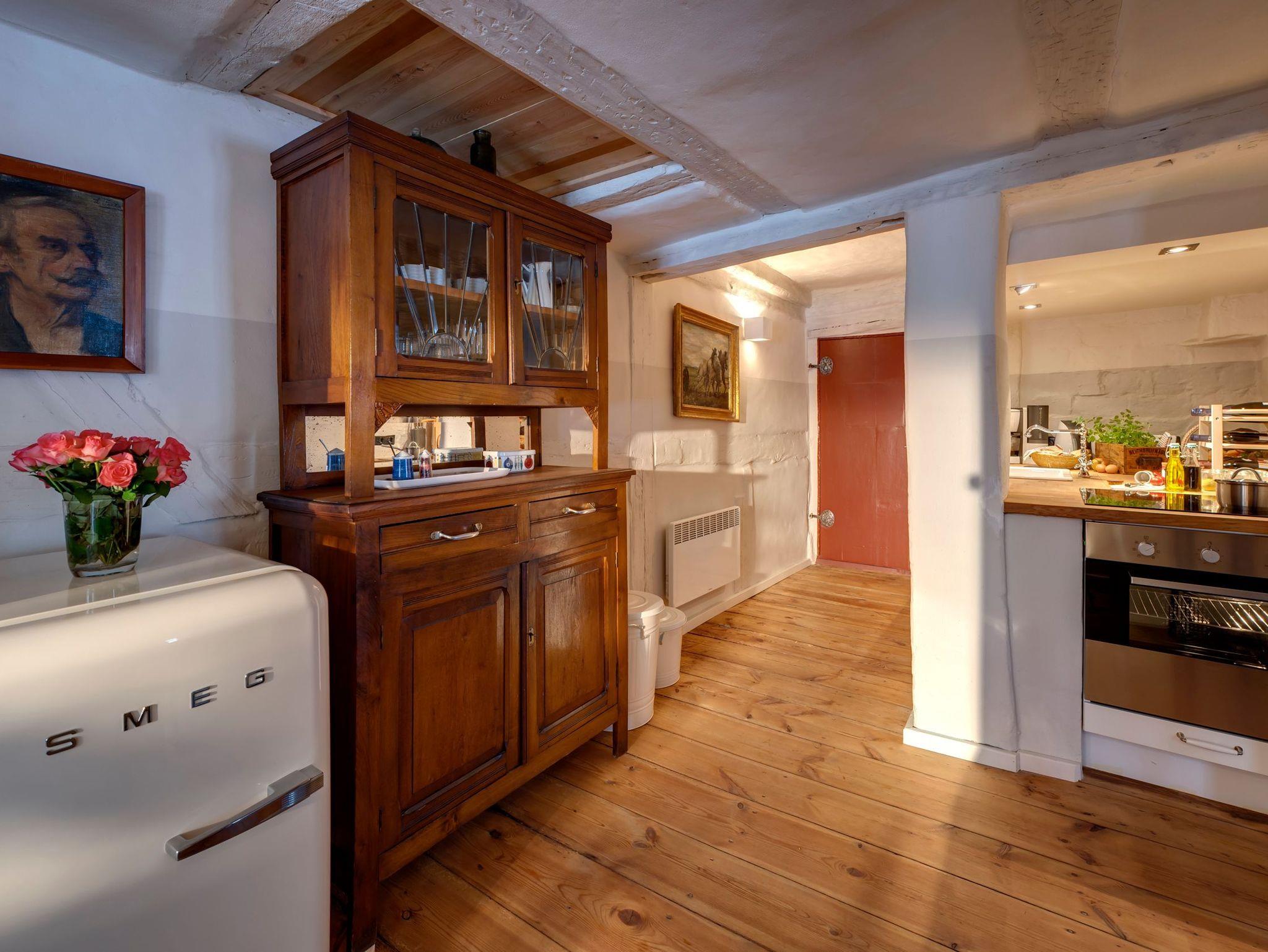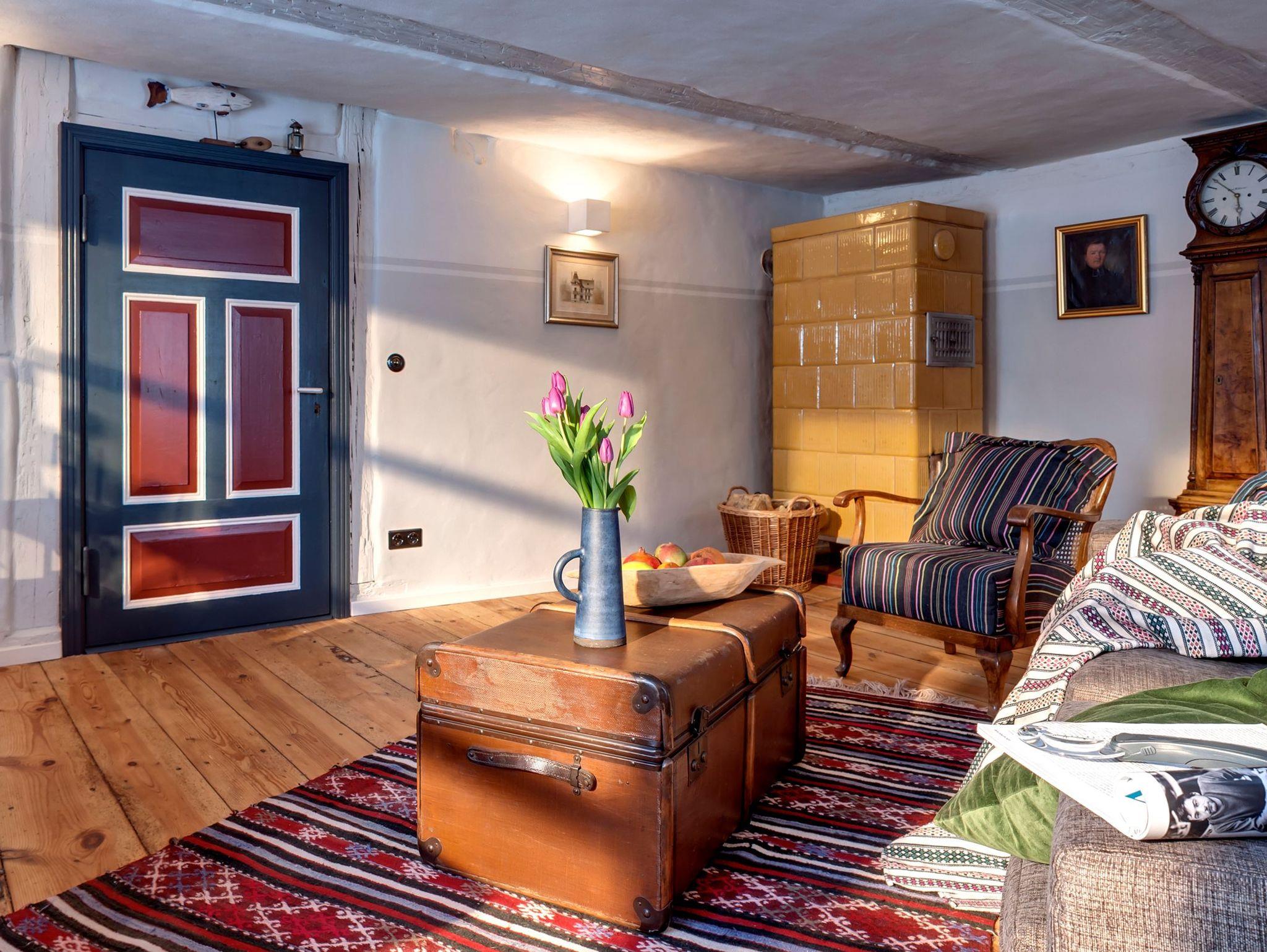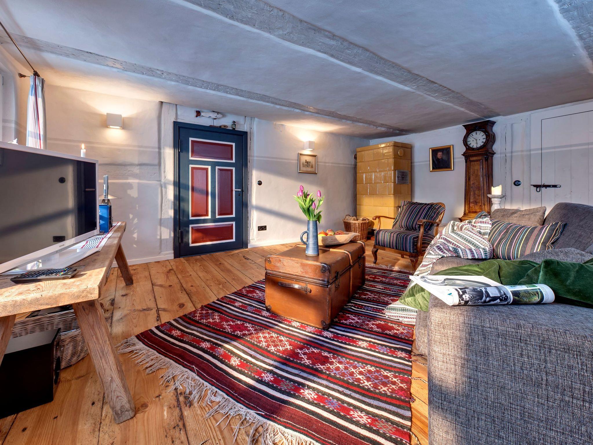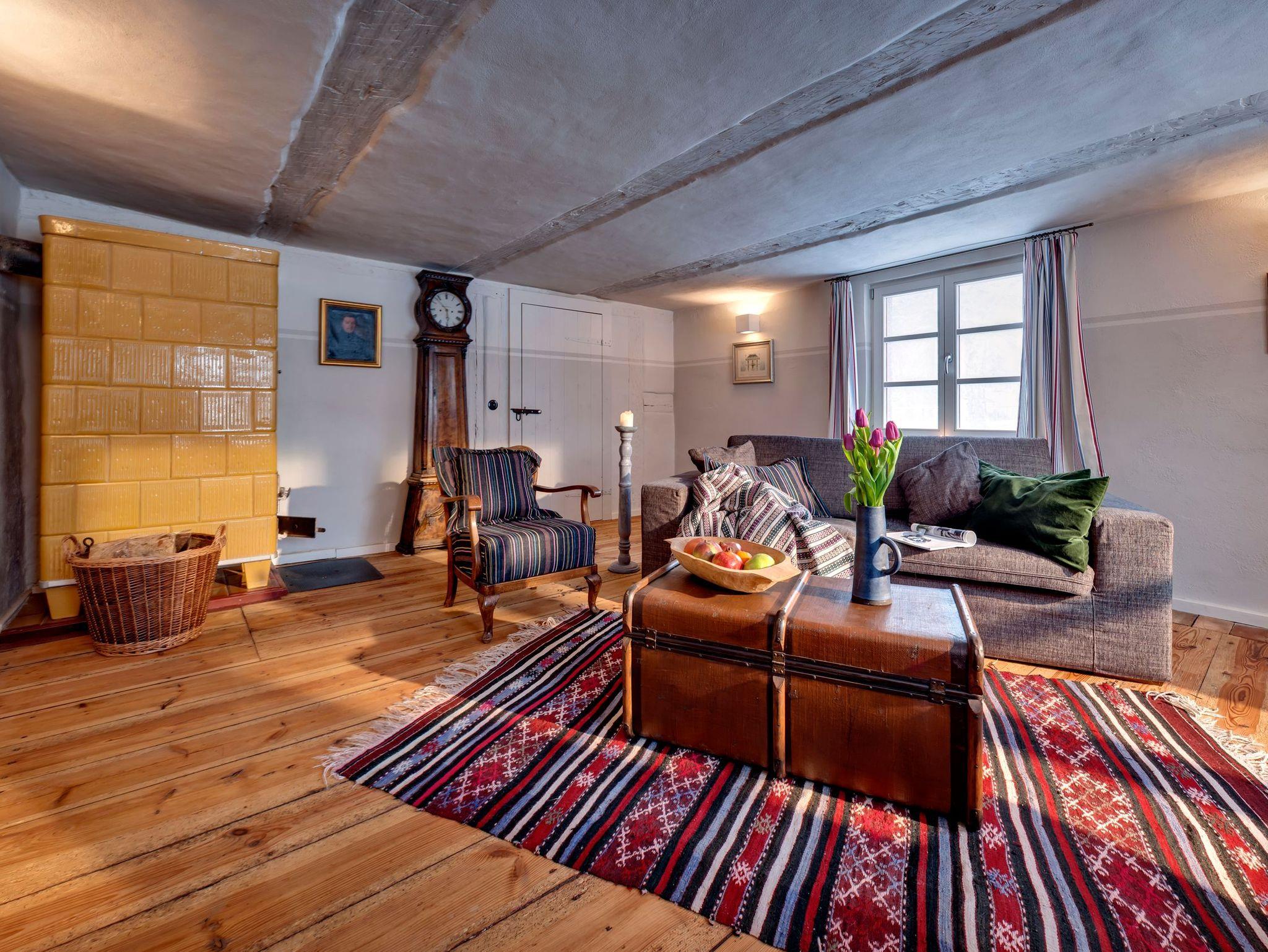 Auf 90 m² erwarten Sie heute ein Wohnraum mit Kachelofen, Flachbild-TV, DVD, Stereo-Anlage, ein Esszimmer mit Essplatz, eine vollausgestattete Küche mit Spülmaschine, Backofen, Keramikkochfeld und Kühlschrank, die Küche als architektonische Besonderheit integriert in der historischen Esse des Hauses. Weiterhin gibt es ein Schlafzimmer mit Doppelbett, ein Bad mit WC, Waschbecken, Dusche, Waschvollautomat. Entdecken Sie die für diesen Gebäudestil typischen Lehmwände, welche mit Lehmfarben veredelt wurden und eine besonders positive Wirkung auf das Raumklima entfalten. Zum Teil noch erhaltene Originalmöbel des Hauses wurden liebevoll restauriert und mit passenden antiken Möbeln ergänzt.