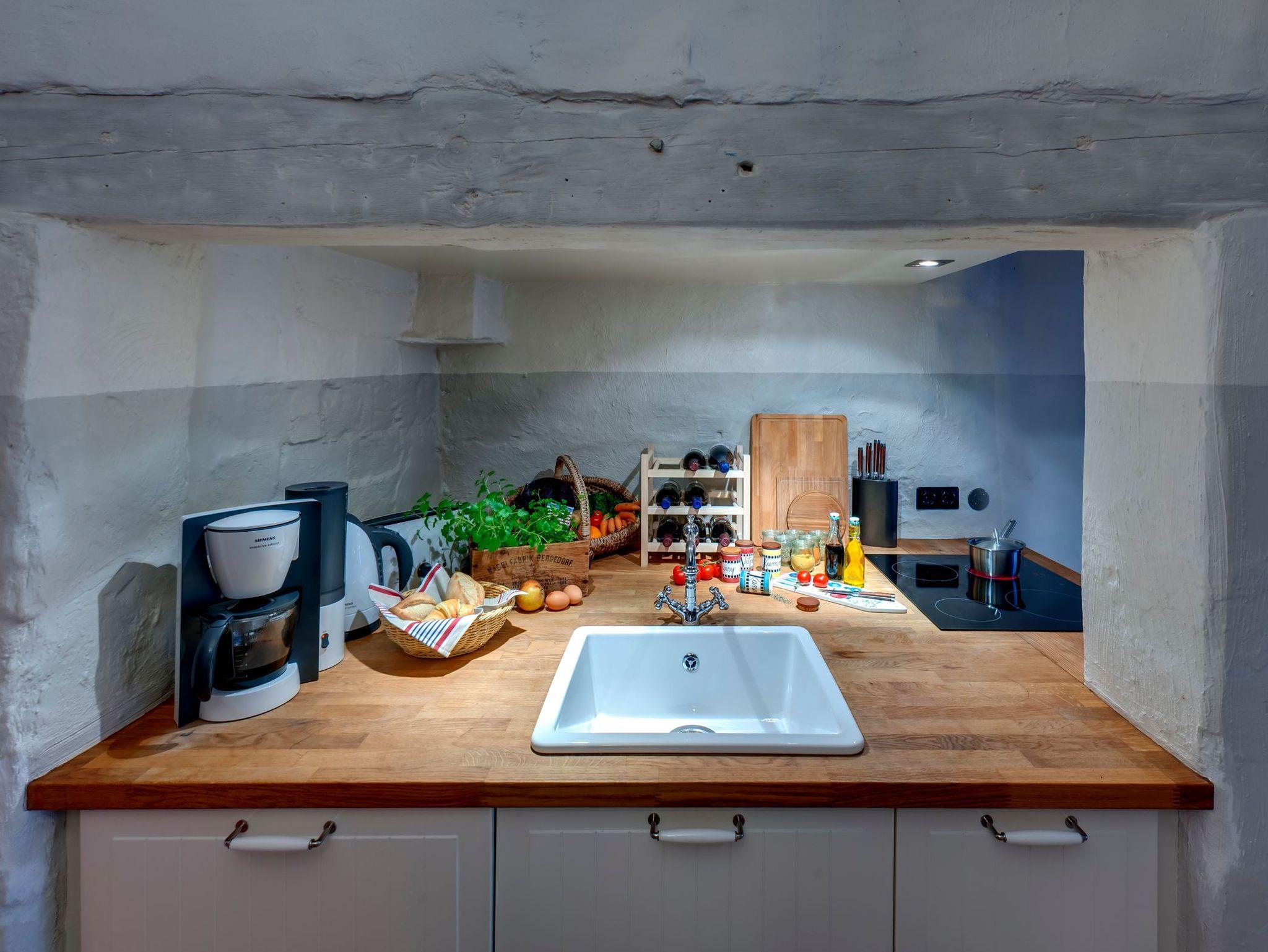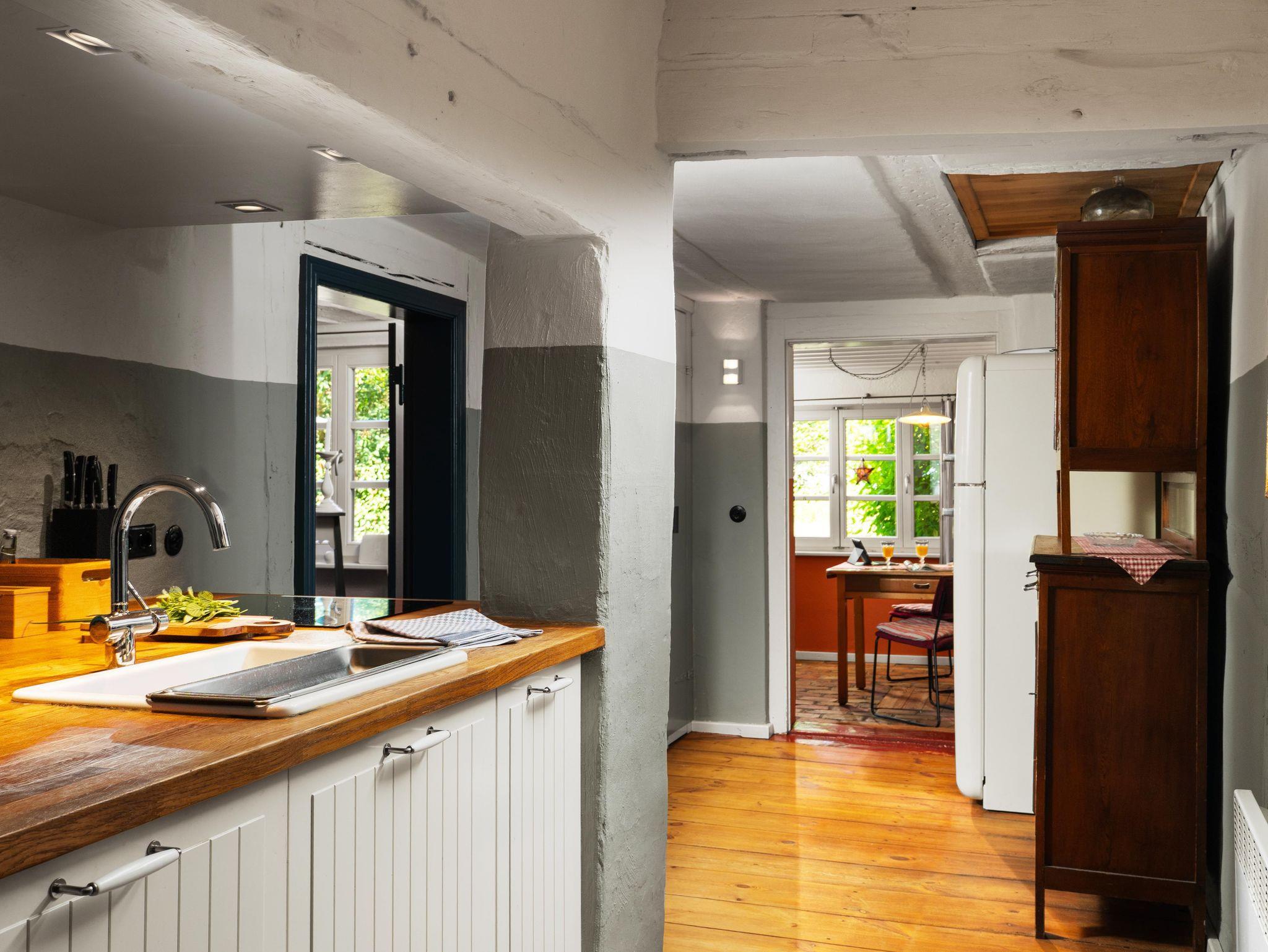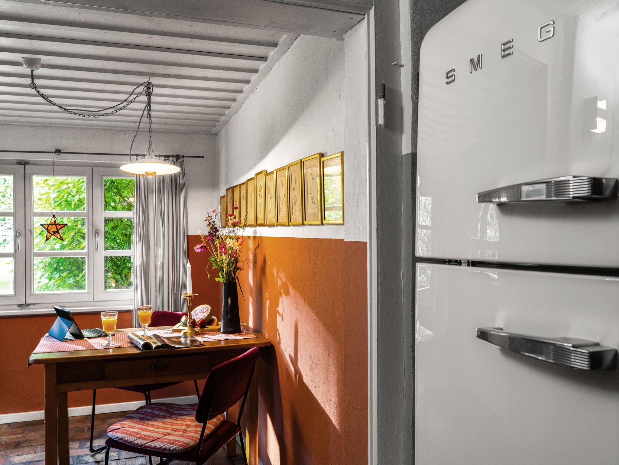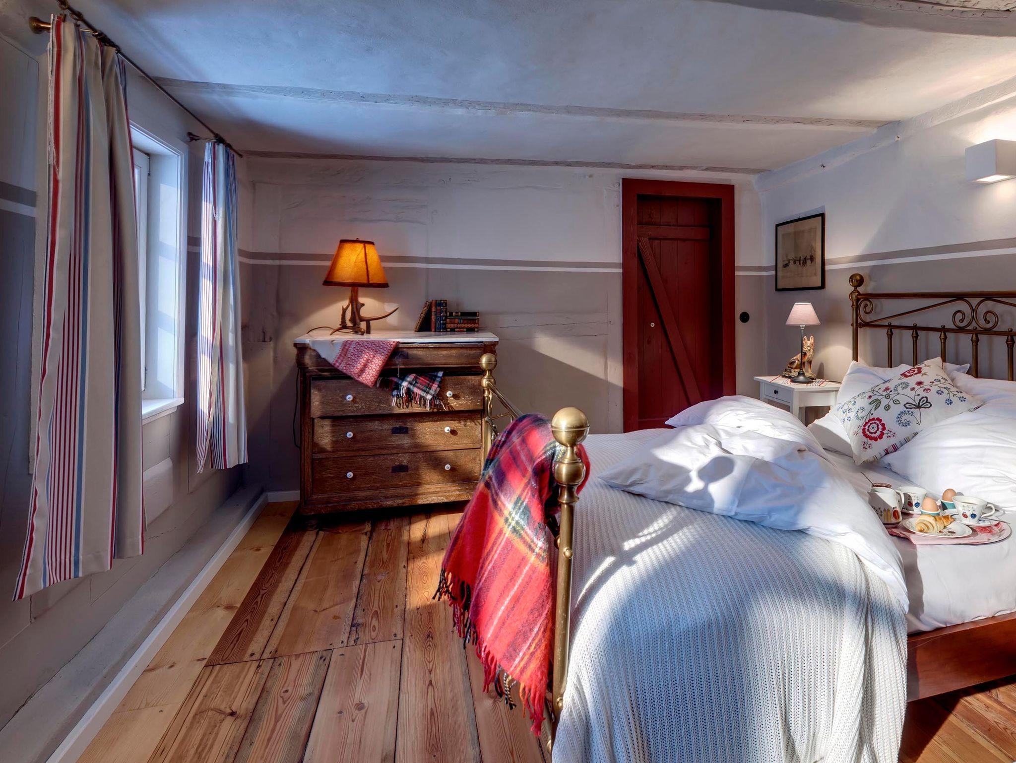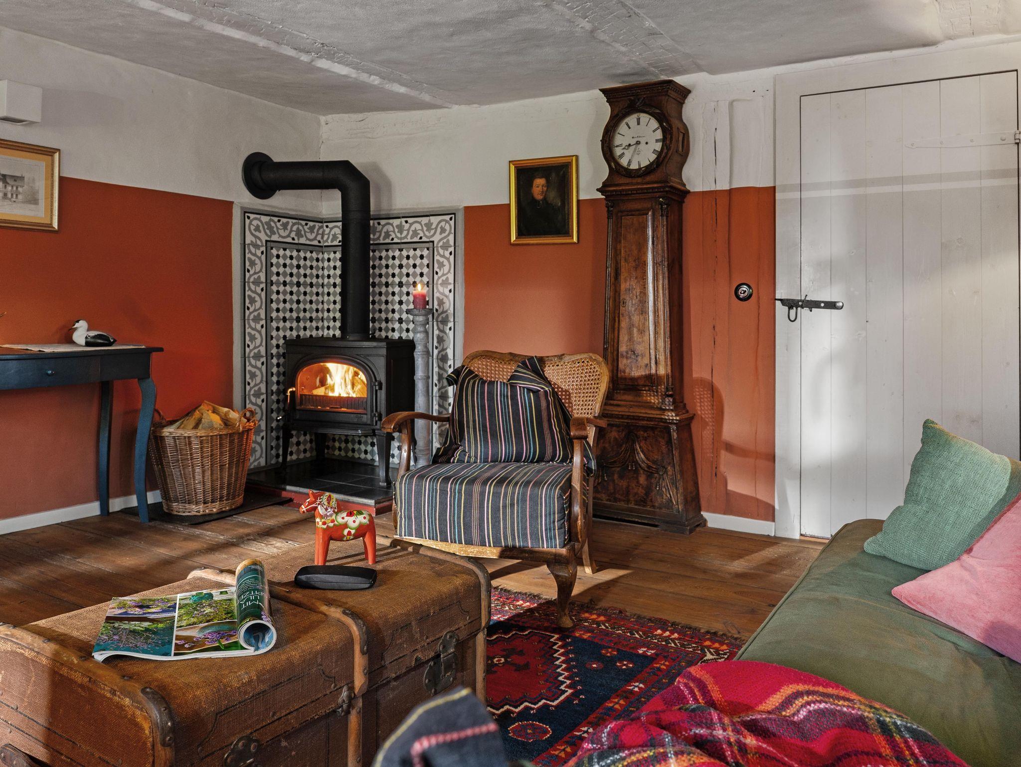 Auf 90 m² erwarten Sie heute ein Wohnraum mit Kachelofen, Flachbild-TV, DVD, Stereo-Anlage, ein Esszimmer mit Essplatz, eine vollausgestattete Küche mit Spülmaschine, Backofen, Keramikkochfeld und Kühlschrank, die Küche als architektonische Besonderheit integriert in der historischen Esse des Hauses. Weiterhin gibt es ein Schlafzimmer mit Doppelbett, ein Bad mit WC, Waschbecken, Dusche, Waschvollautomat. Entdecken Sie die für diesen Gebäudestil typischen Lehmwände, welche mit Lehmfarben veredelt wurden und eine besonders positive Wirkung auf das Raumklima entfalten. Zum Teil noch erhaltene Originalmöbel des Hauses wurden liebevoll restauriert und mit passenden antiken Möbeln ergänzt.