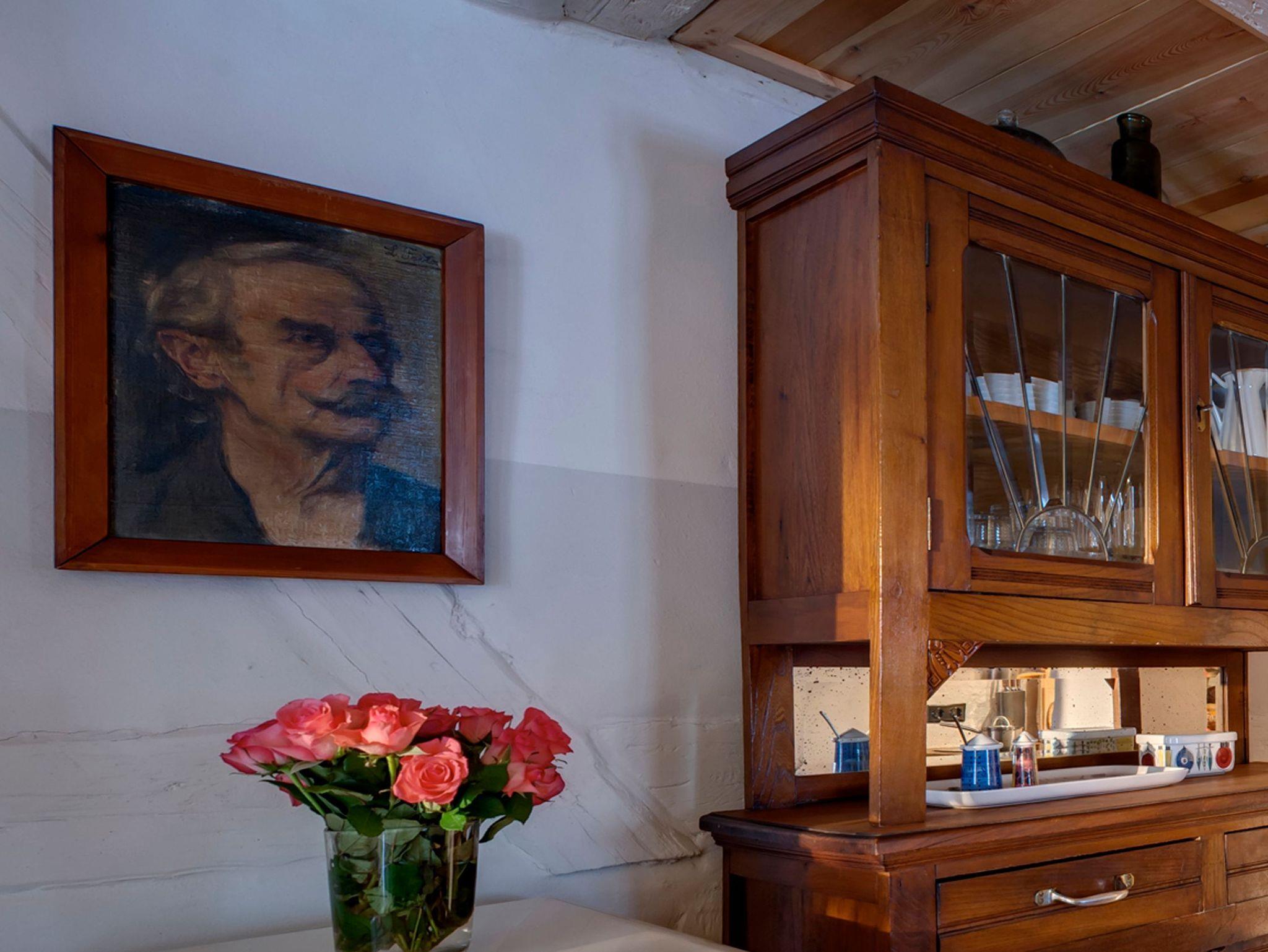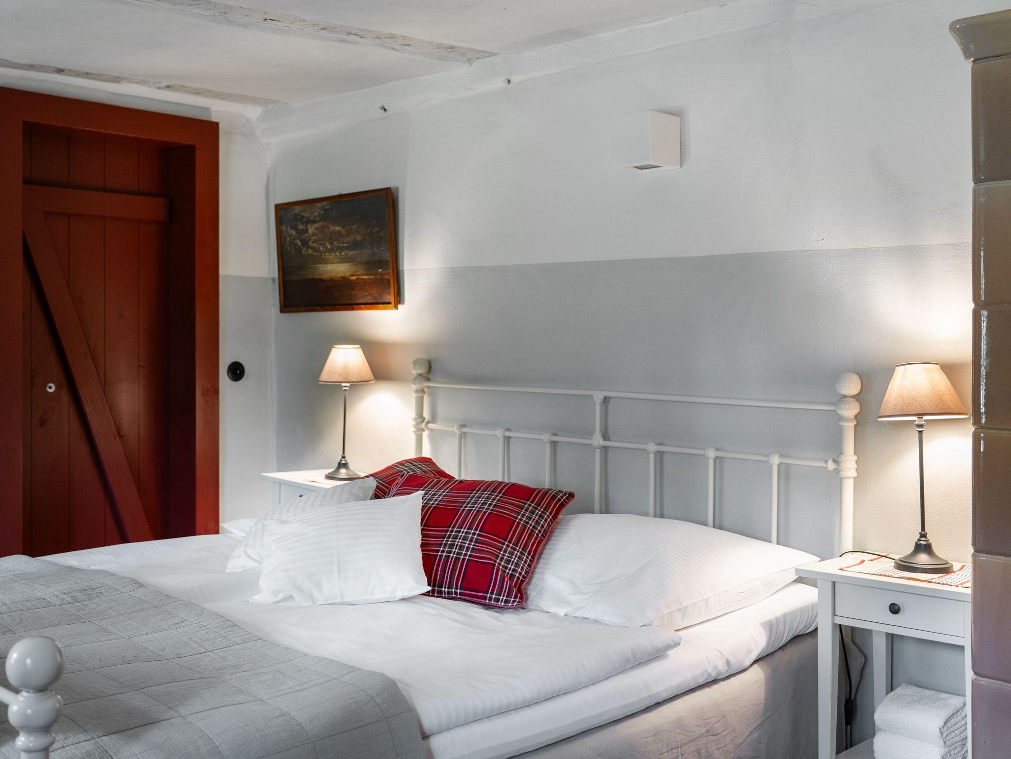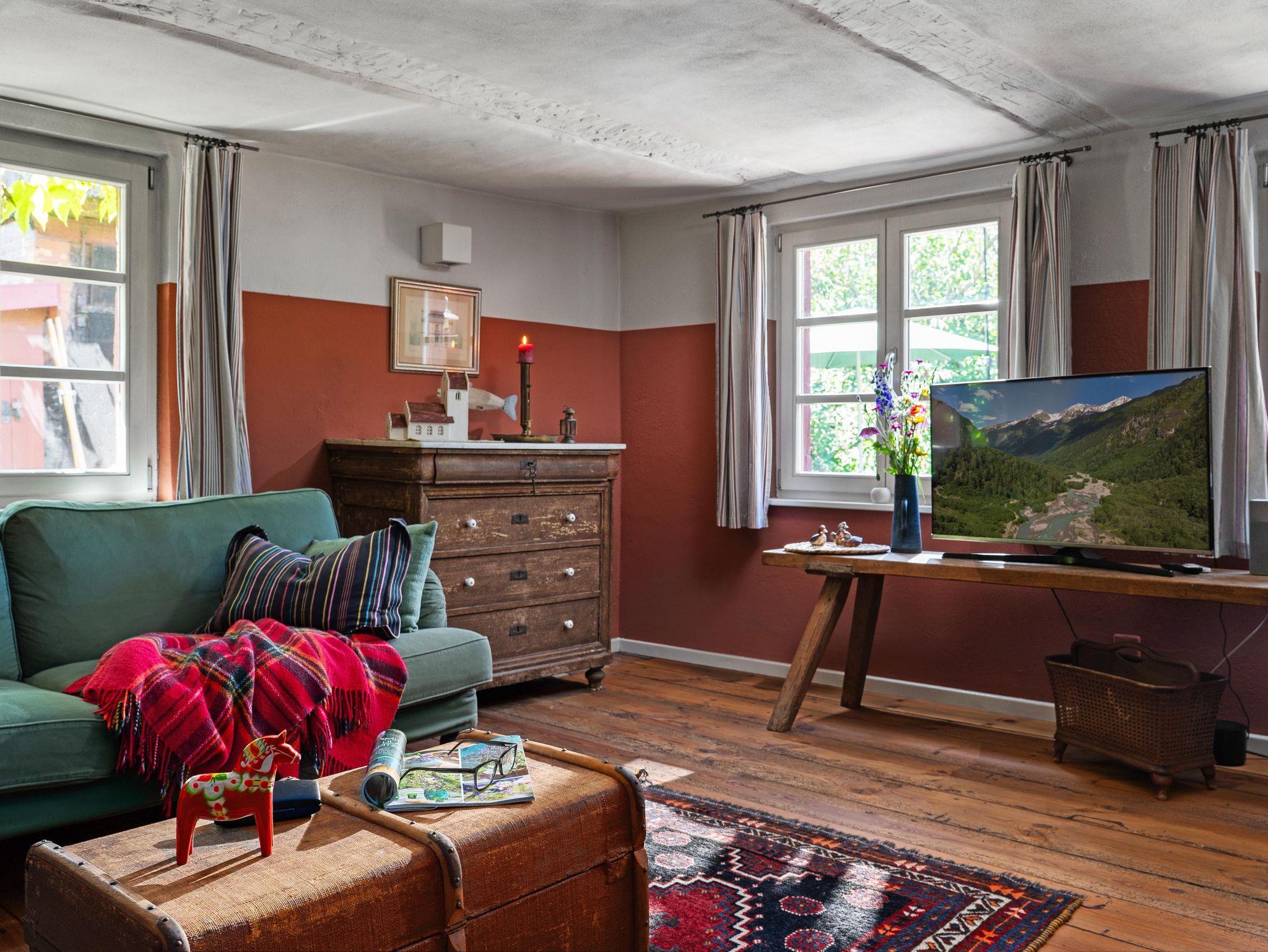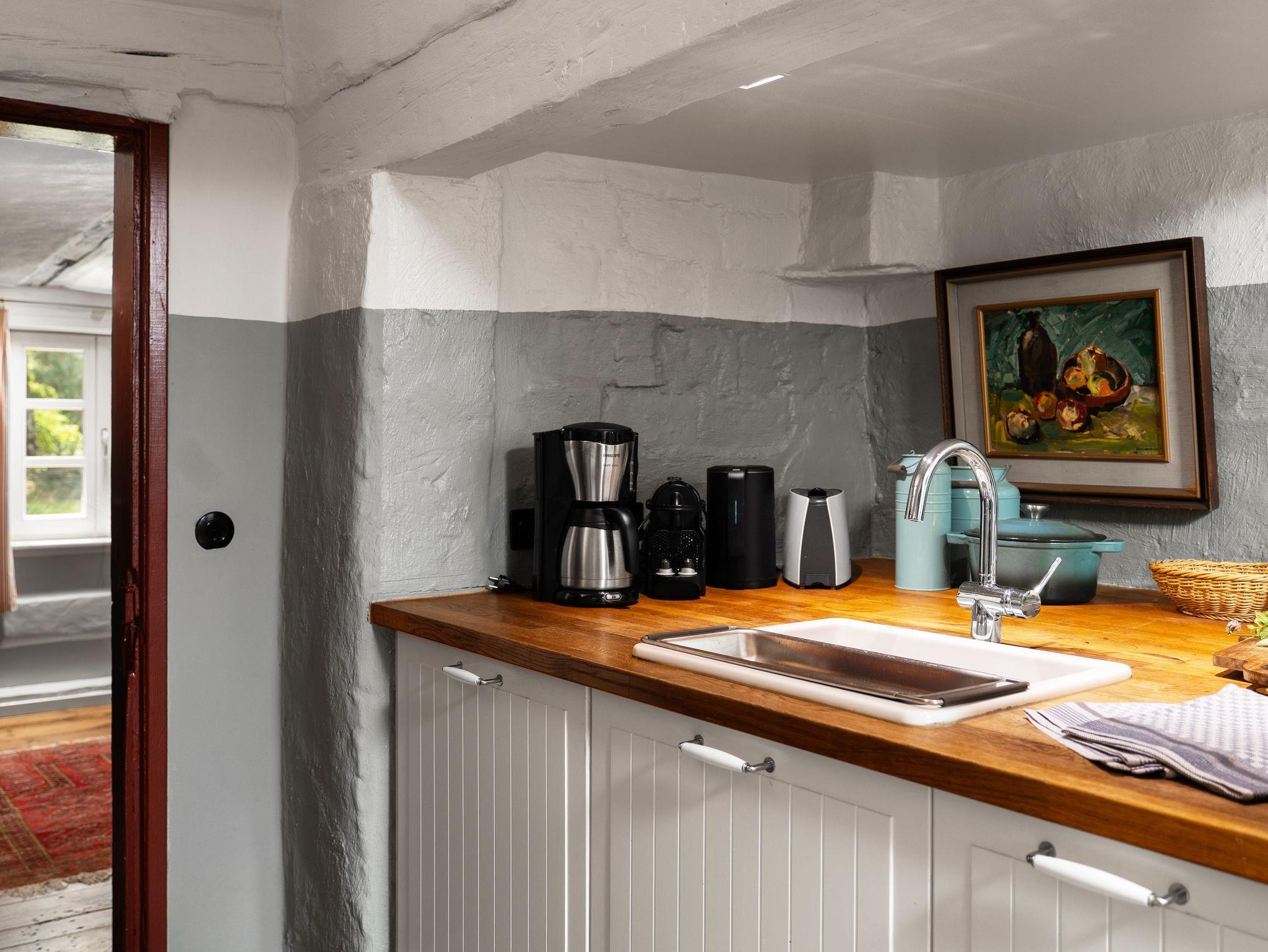 Auf 90 m² erwarten Sie heute ein Wohnraum mit Kachelofen, Flachbild-TV, DVD, Stereo-Anlage, ein Esszimmer mit Essplatz, eine vollausgestattete Küche mit Spülmaschine, Backofen, Keramikkochfeld und Kühlschrank, die Küche als architektonische Besonderheit integriert in der historischen Esse des Hauses. Weiterhin gibt es ein Schlafzimmer mit Doppelbett, ein Bad mit WC, Waschbecken, Dusche, Waschvollautomat. Entdecken Sie die für diesen Gebäudestil typischen Lehmwände, welche mit Lehmfarben veredelt wurden und eine besonders positive Wirkung auf das Raumklima entfalten. Zum Teil noch erhaltene Originalmöbel des Hauses wurden liebevoll restauriert und mit passenden antiken Möbeln ergänzt.