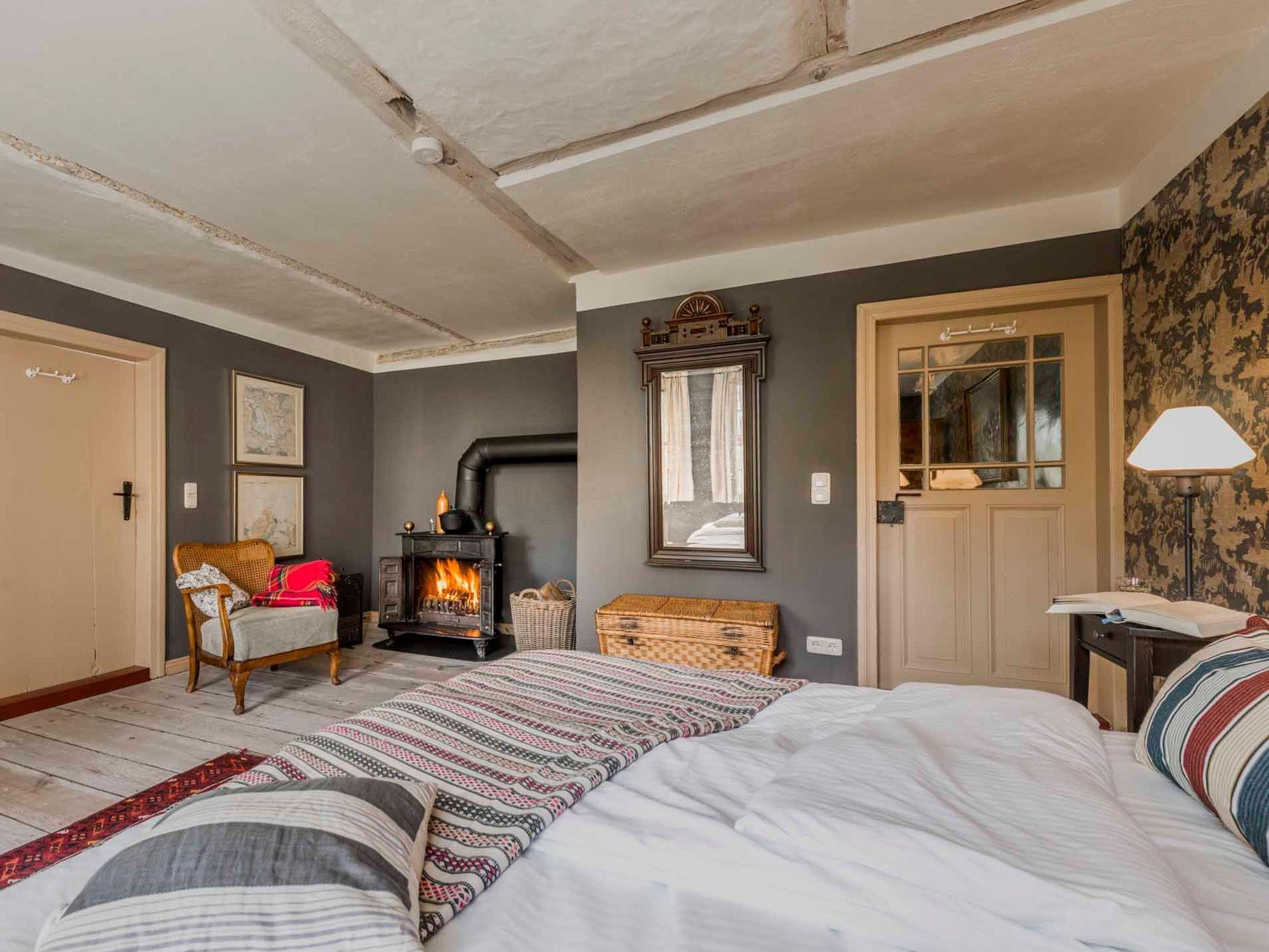Unser Colonistenhaus ist ein liebevoll saniertes Fachwerkhaus aus dem Jahr 1757. Haben Sie schon einmal Ihren Urlaub in einem 250 Jahre alten Haus verbracht? Lieben Sie blankgegriffene Türklinken, tiefe Balkendecken, die Struktur handgeformter Lehmwände, das Spiel von Licht und Schatten auf gelaugten Dielen und antiken Möbeln? Dann lassen Sie sich von fast 100m² Geschichte im Colonistenhaus verzaubern. Bei unserem mit viel Liebe sanierten Fachwerkhaus aus dem Jahr 1757 wurde ganz besonders darauf geachtet, den ursprünglichen Charme eines historischen pommerschen Gebäudes zu bewahren und dabei viel Wert auf ökologische Materialien wie Lehm, Holz und Naturfarben gelegt. So haben wir das Haus mit der für diese Häuser typischen Holzfassade aus heimischer Fichte versehen. Das Dach wurde 2016 mit wunderbaren, historischen Tonziegeln eines Abbruchgebäudes im Nachbardorf neu gedeckt. Die zum Teil noch barocken Kastenfenster wurden aufwendig restauriert oder da wo möglich durch helle, bodentiefe Fenstertüren komplettiert, sodass direkte Zugänge zur umlaufenden großen Holzterrasse geschaffen wurden. Die urgemütliche Atmosphäre der Räume, mit niedrigen Balkendecken, edlen Tapeten und Zementfliesen, Fachwerkwänden, den antiken Schränken und Kommoden wird Sie verzaubern. Hier sorgt ein antiker Lübecker Kachelofen im Winter für wohlige Wärme. Außerdem wurde eines der beiden Schlafzimmer mit einem gusseisernen Franklin Ofen ausgestattet, der hier nun auf Wunsch für ausgesprochen romantische Abende sorgt.