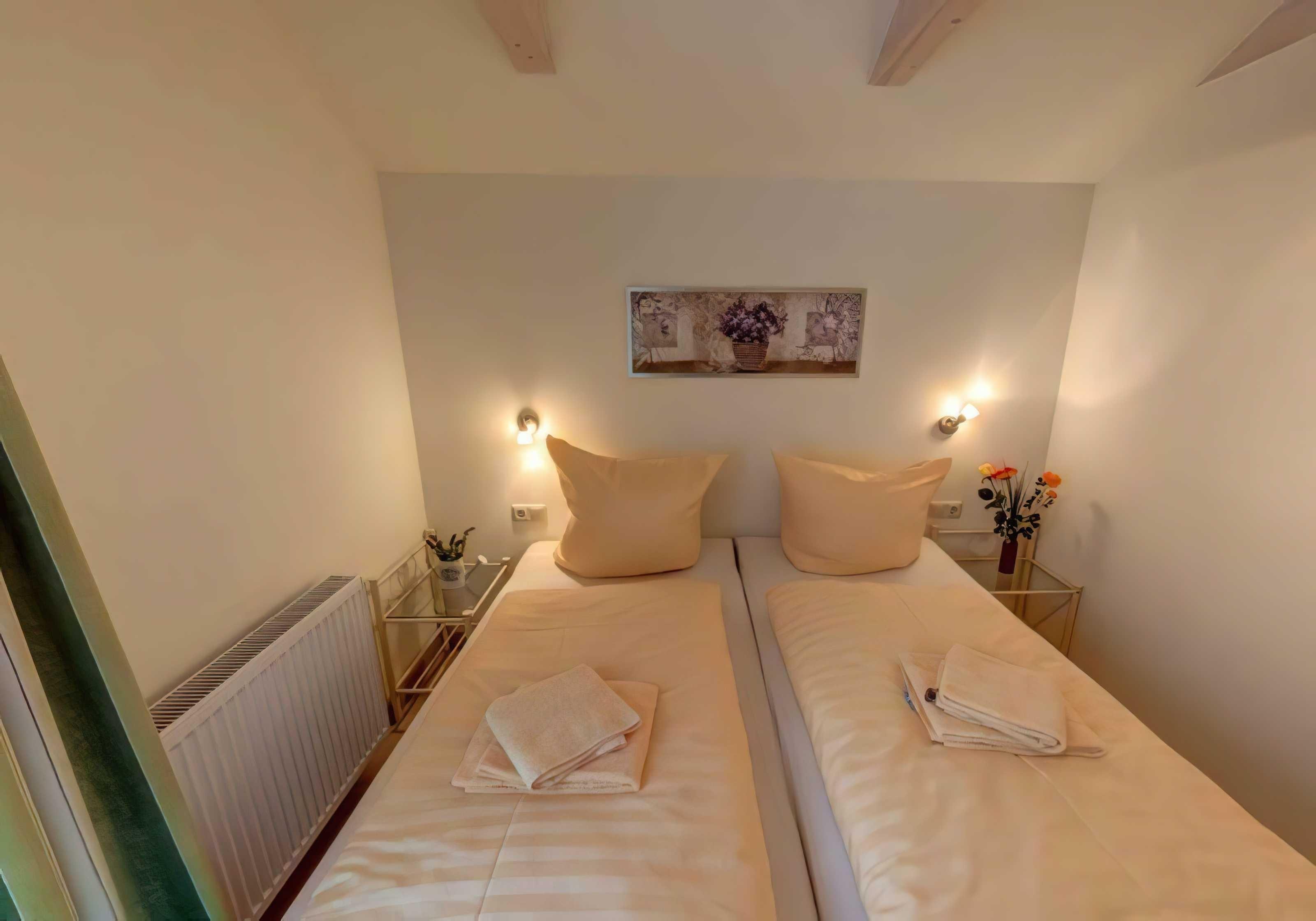 Obergeschoss 54 m² (4 Personen) Zur Ausstattung im Obergeschoss gehören 1 Schlafzimmer mit Doppeltbetten und ein Schlafzimmer mit 2 Einzelbetten. Das Schlafzimmer mit den beiden Einzelbetten befindet sich im Dachboden der Ferienwohnung und ist über eine Holztreppe erreichbar. Zur weiteren Ausstattung gehören ein Wohnzimmer mit integrierter vollausgestatteter Küche (Geschirrspüler, Ceranherd mit Backofen, Mikrowelle, Kaffeemaschine) einem Bad mit Dusche/WC und einen Balkon.