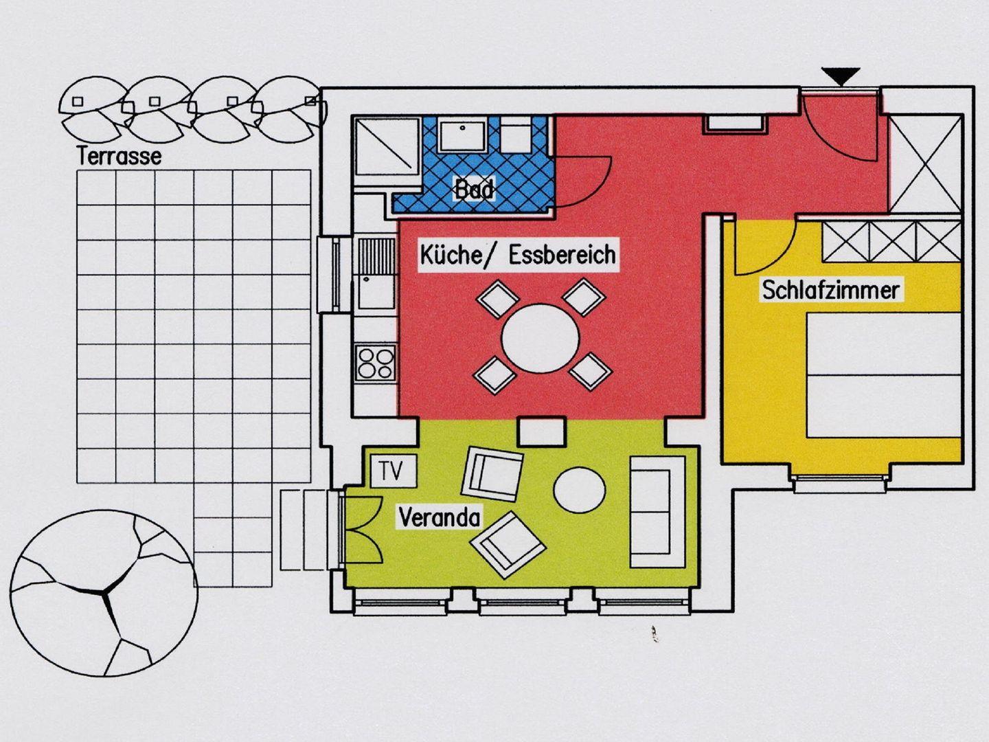 In der voll ausgestatteten offenen Küche können Sie gut gemeinsam kochen und essen. Das separate Schlafzimmer daneben bietet ein gemütliches Doppelbett ( 160 x 200 cm ). Den Komfort rundet ein modernes Duschbad mit seiner superflachen Dusche ab und ermöglicht Ihnen einen angenehmen Start in den Tag.