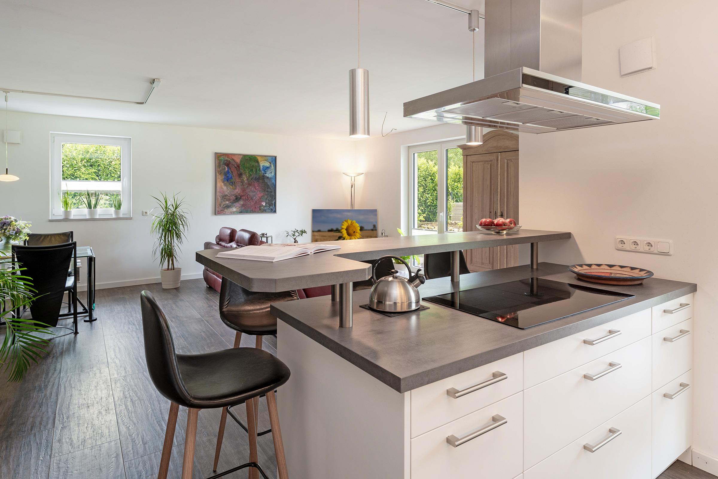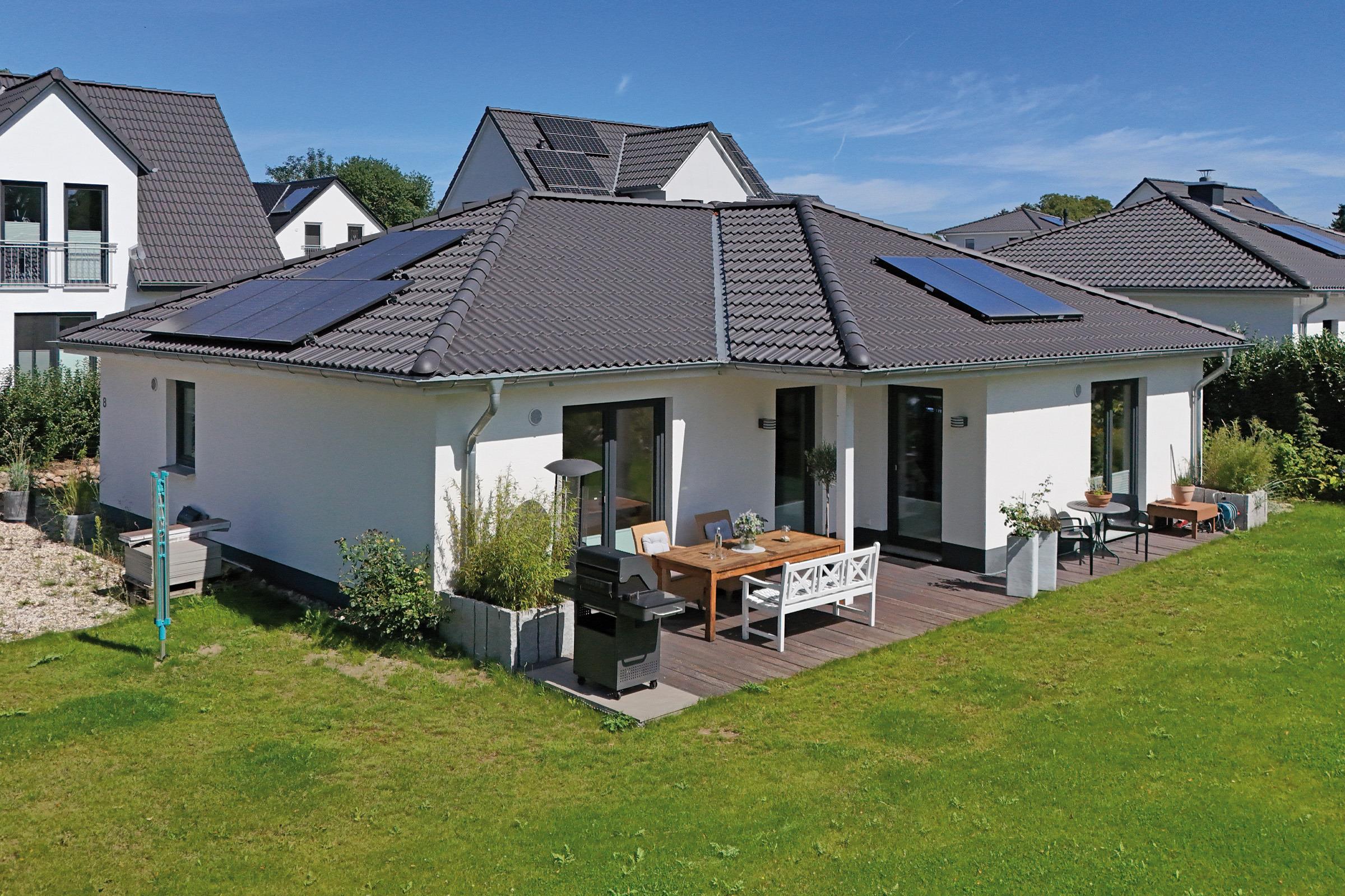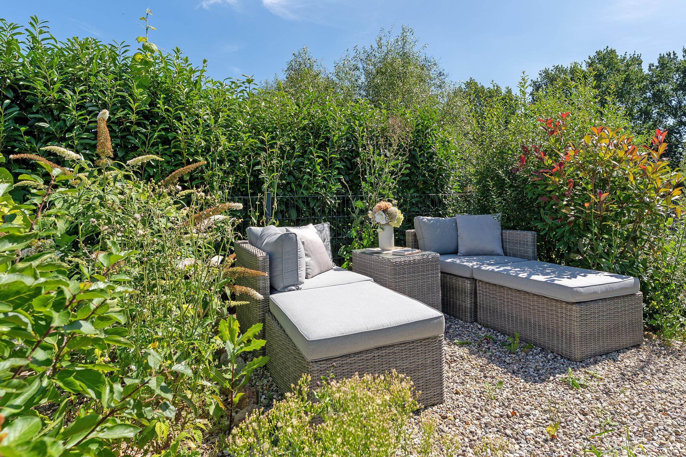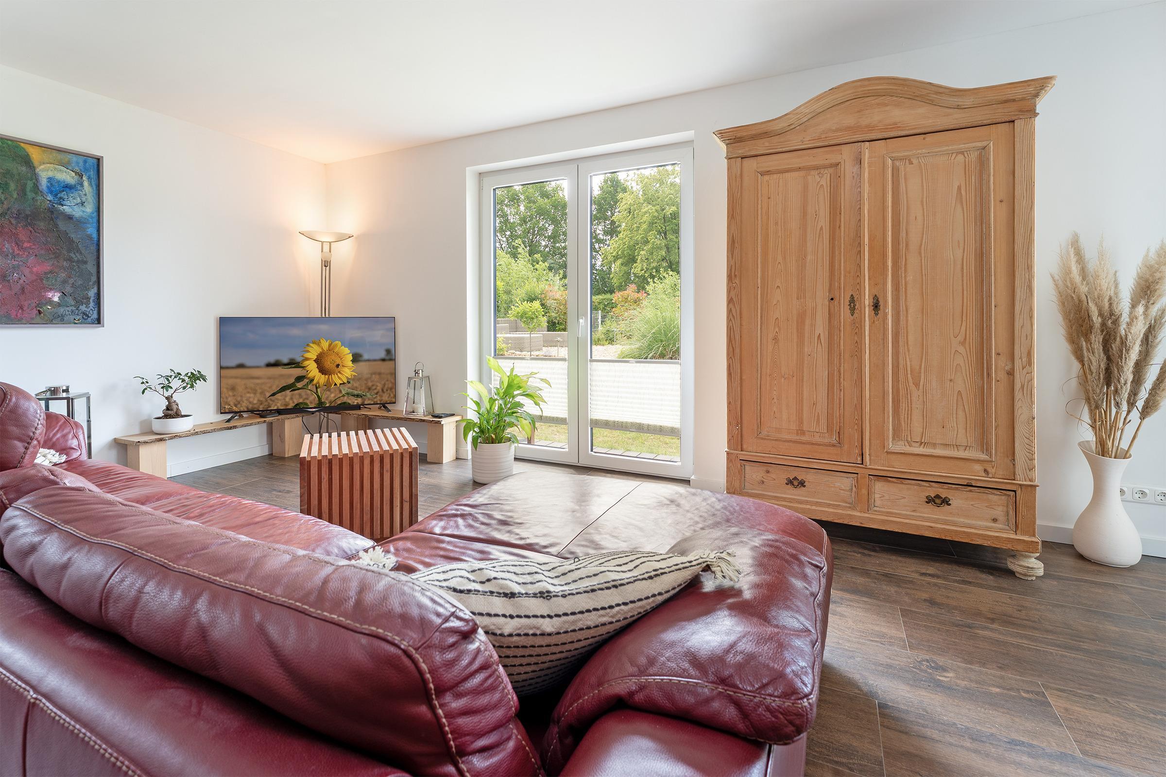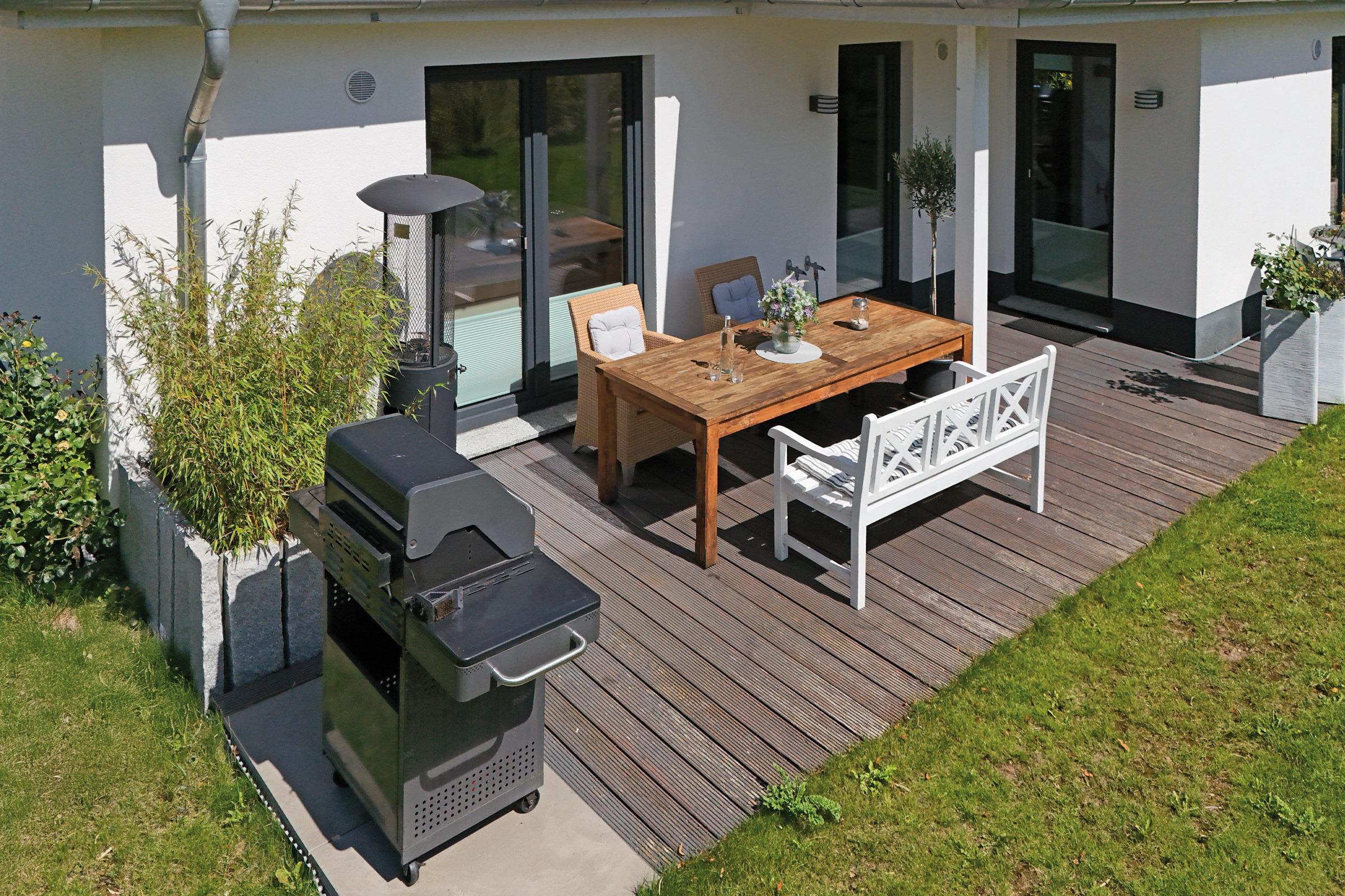 Dieses moderne Ferienhaus im Grünen bietet Ihnen einen lichtdurchfluteten Wohnbereich mit komfortabler Couch, Flachbild-TV und WLAN – ideal für entspannte Abende. Vom Wohnbereich aus gelangen Sie direkt auf die sonnige südlich ausgerichtete Terrasse, auf der Gartenmöbel und ein moderner Gasgrill für genussvolle Stunden im Freien bereitstehen.
