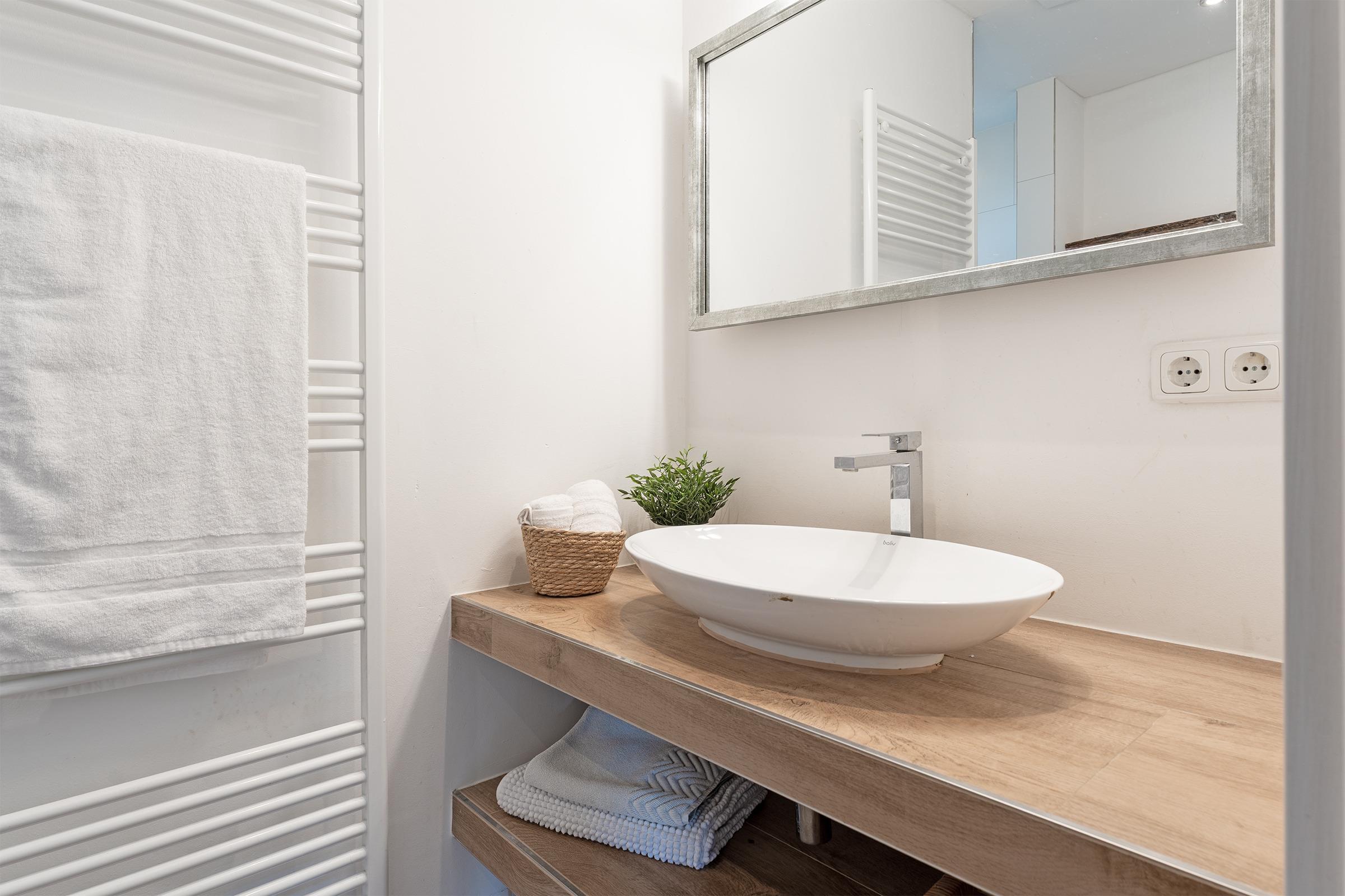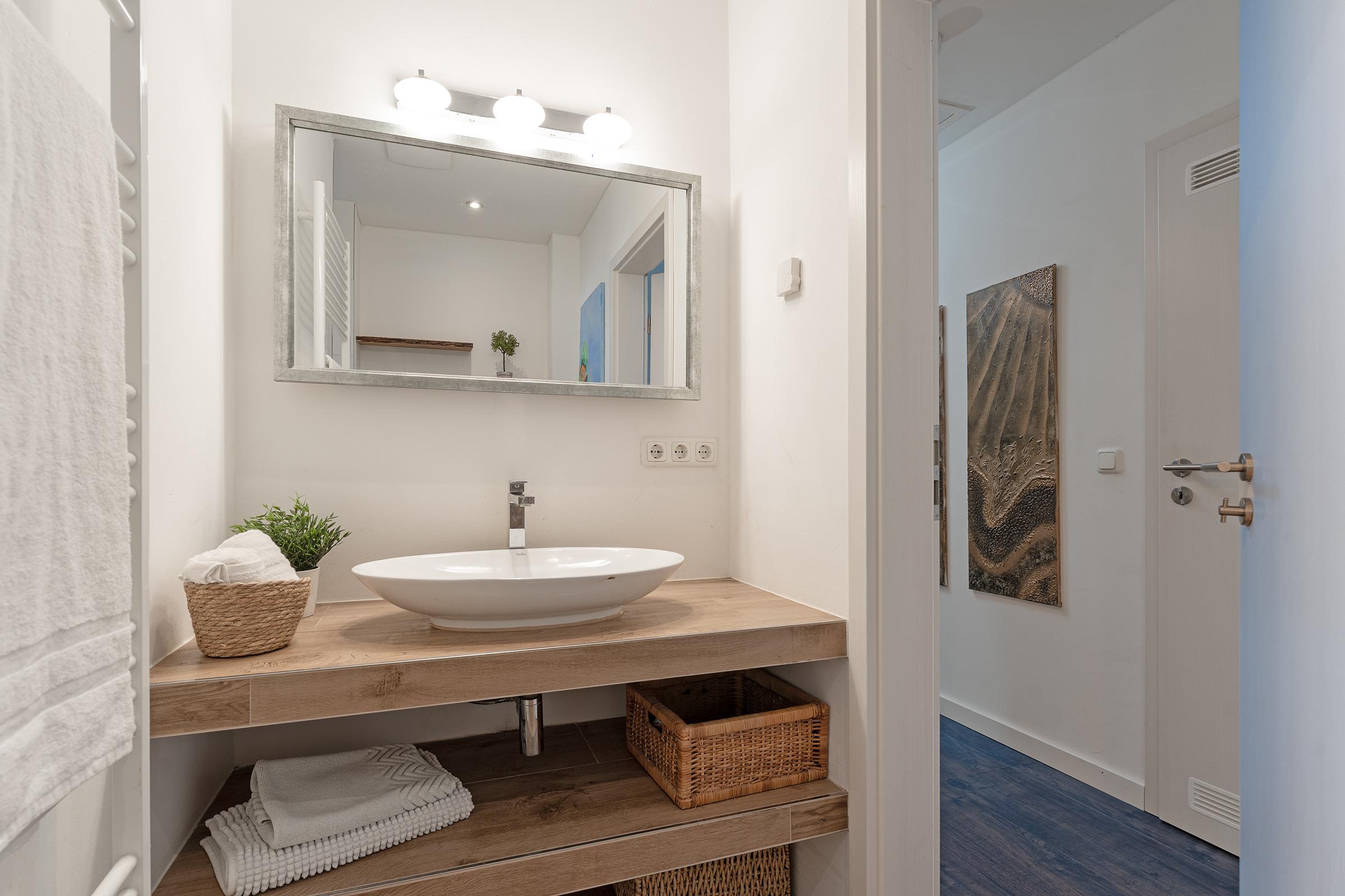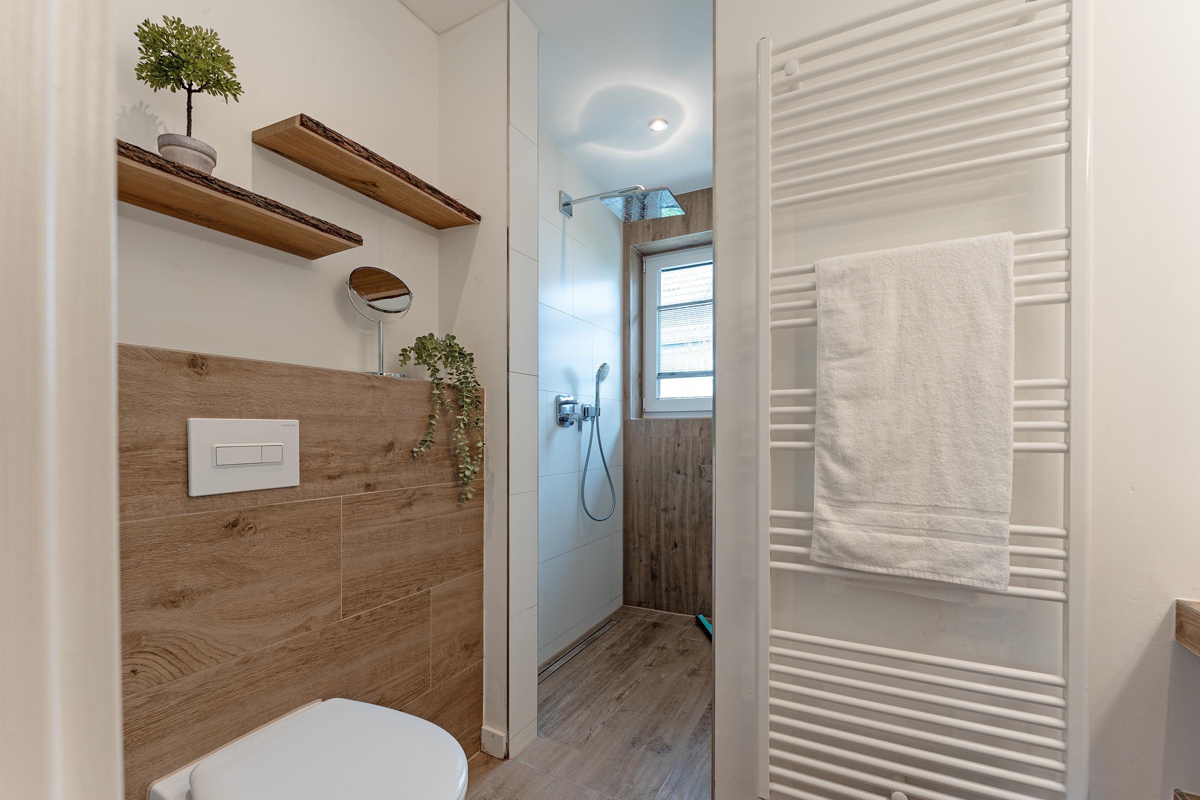 Das moderne Badezimmer verfügt über eine bodengleiche Dusche, Waschbecken, WC sowie Kosmetikspiegel. Ein separates Gäste-WC ist ebenfalls vorhanden.