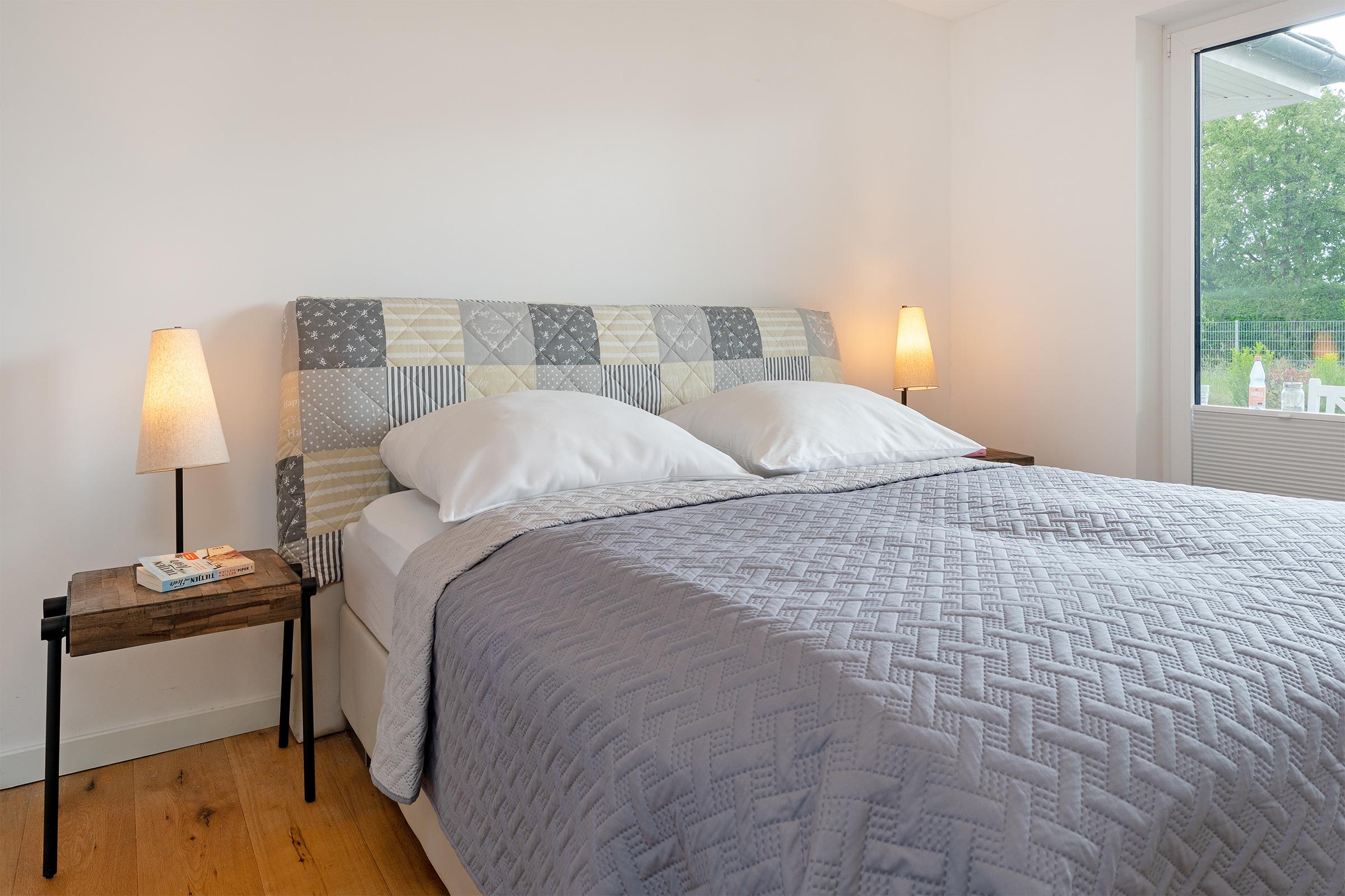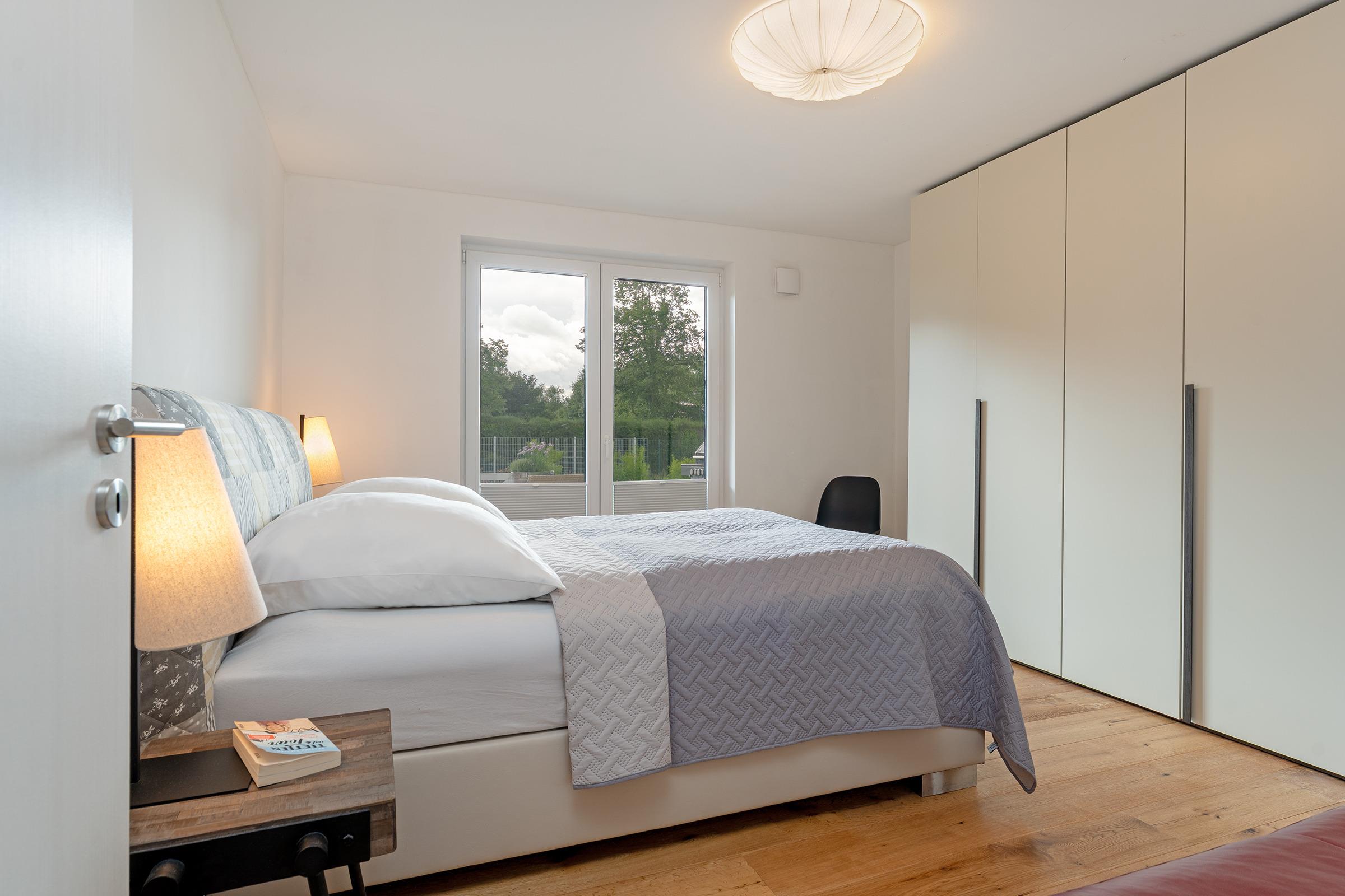 Schlafzimmer 1: 1 Doppelboxspringbett (2x 80x200 cm, durchgehender Topper), Kleiderschrank, Verdunkelung: Plissee, Platz für ein Babybett vorhanden