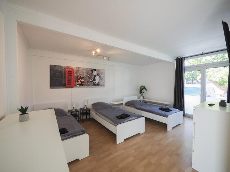 Komplett möblierte Monteurwohnung mit Terrasse in Ahrensburg, Nähe Hamburg. 7 Schlafplätze, Smart-TV, WLAN, voll ausgestattete Küche, Waschmaschine, Duschwanne, ruhige Lage mit guter Anbindung. Ideal für Kolonnen & Langzeitaufenthalte.