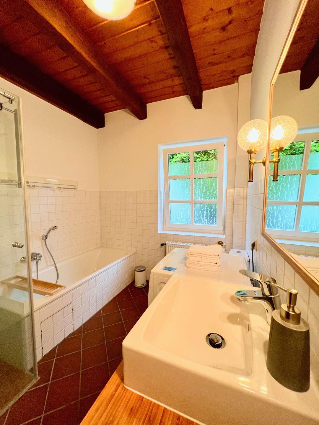 Das moderne Bad ist mit Badewanne und ebenerdiger Dusche sowie Waschbecken und WC ausgestattet.