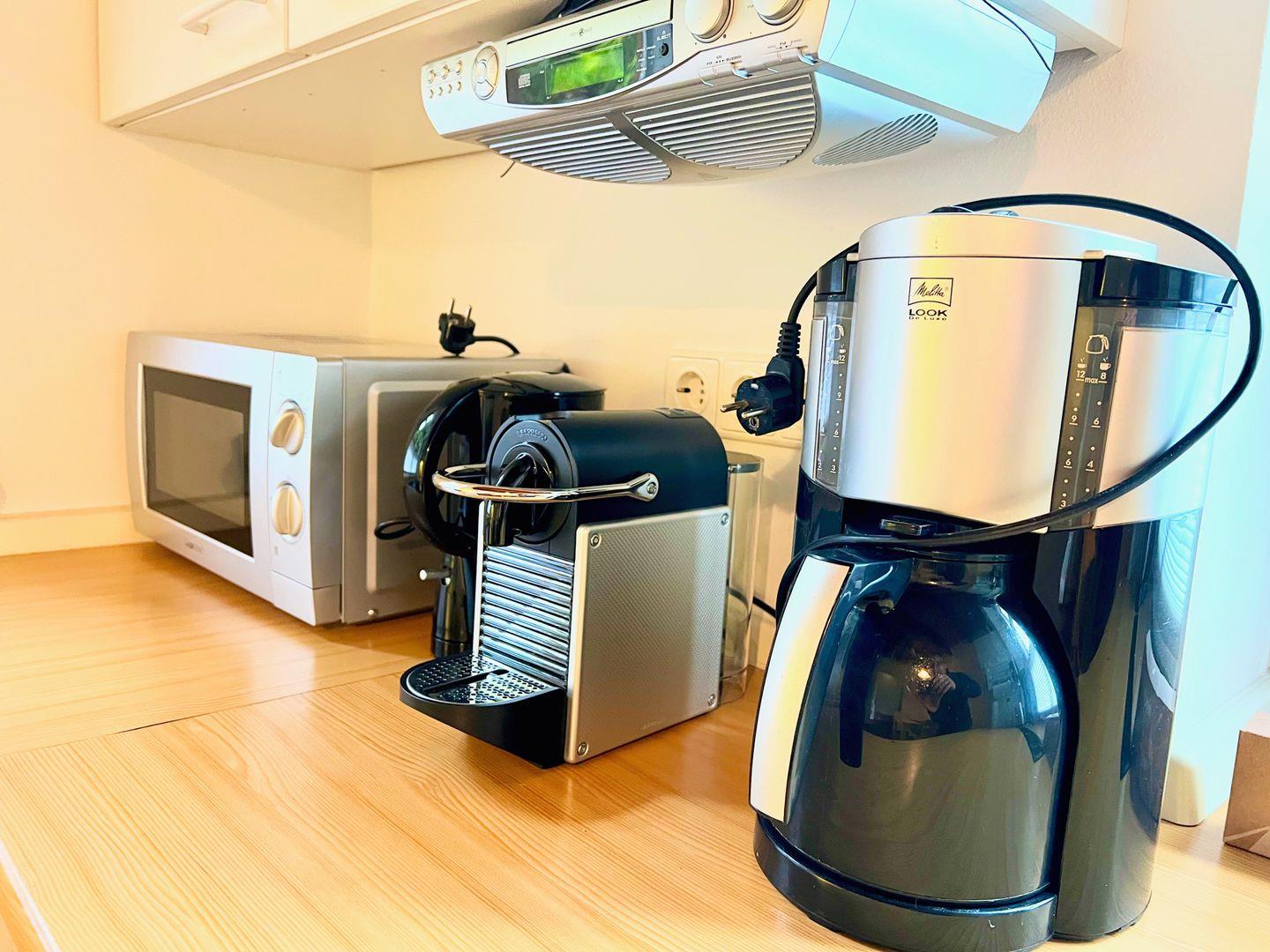 Eine Filterkaffeemaschine und zusätzlich eine Nespresso Maschine inkl. Erstausstattung an Kapseln, Milch und Zucker sorgen für den ersten Kaffee am Morgen.