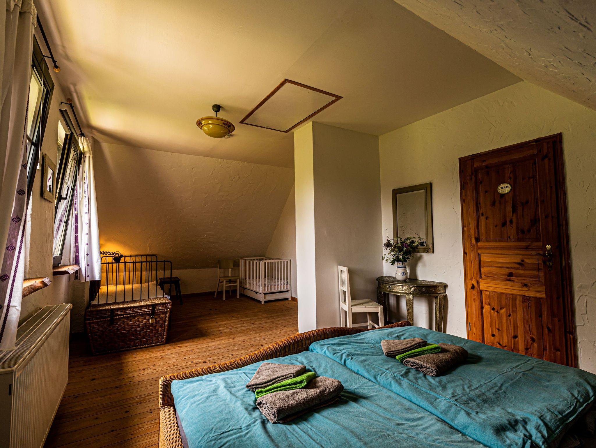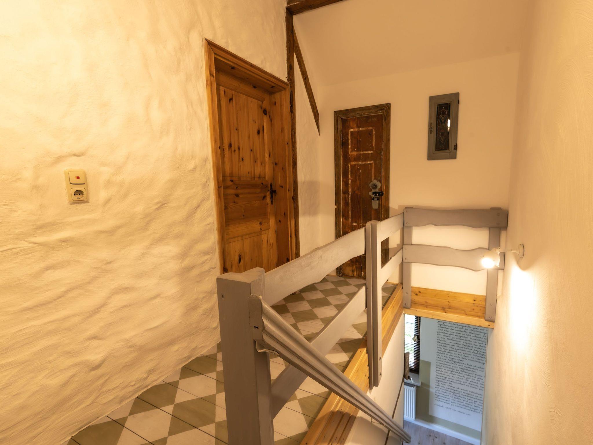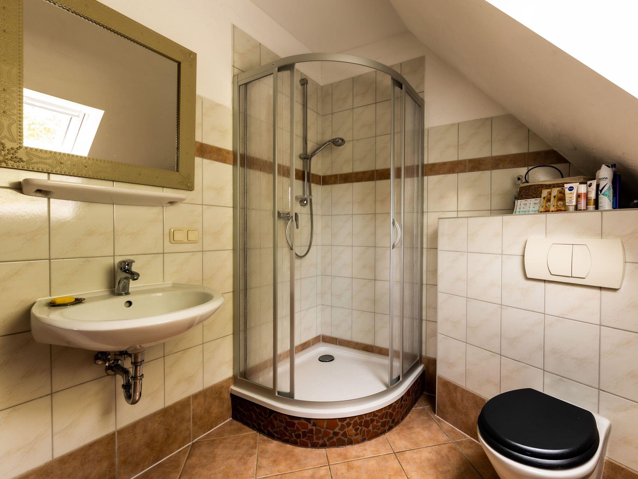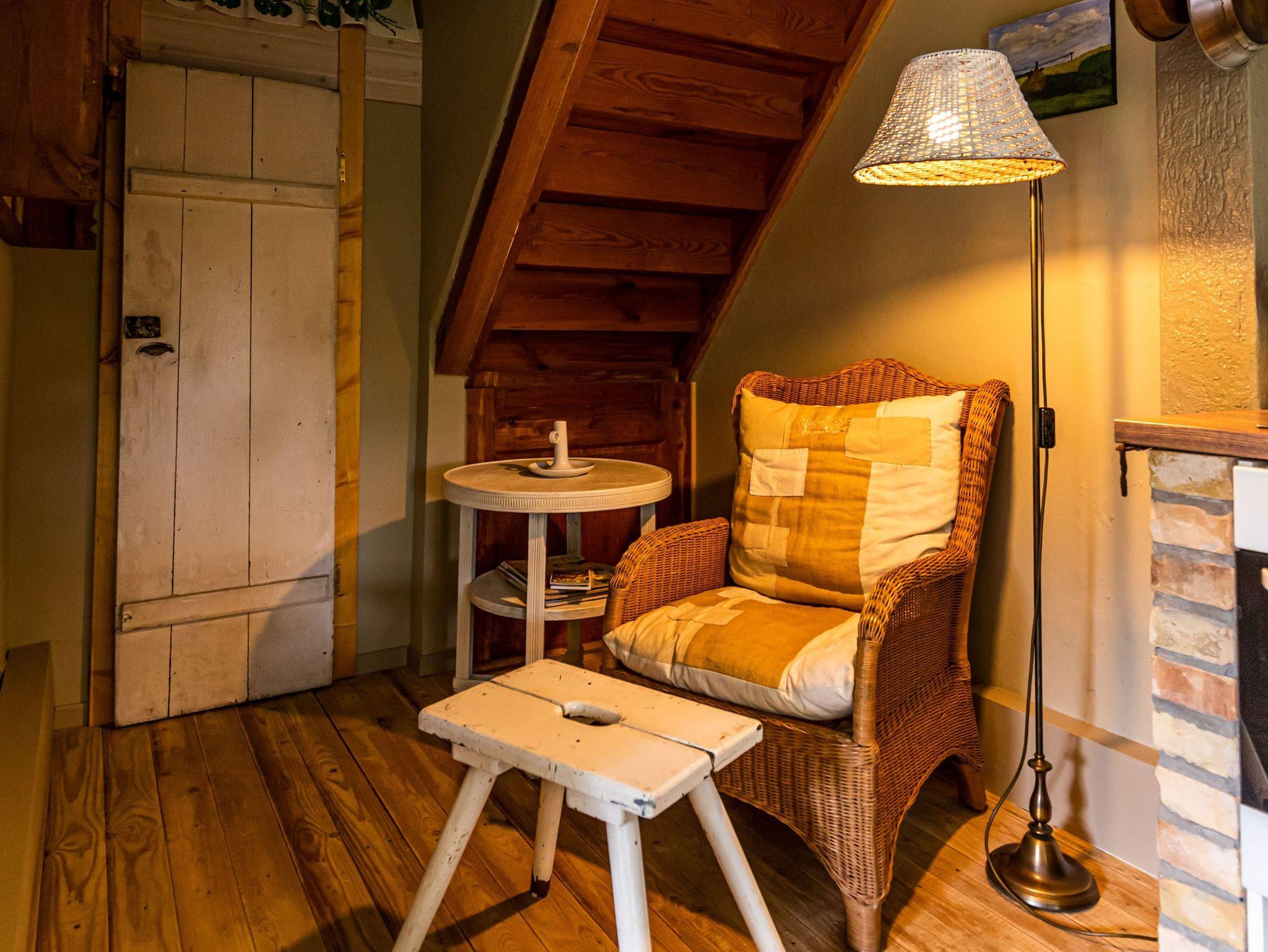 Die Ferienwohnung im Spöckerhus ist eine gemütliche Maisonettewohnung für bis zu 4 Personen, die im Landhausstil eingerichtet ist und in einer ruhigen Umgebung mit viel Grün und Natur liegt. Die Wohnung bietet auf zwei Etagen eine behagliche Atmosphäre und viel Platz für einen entspannten Aufenthalt. Im Erdgeschoss findest du das Wohnzimmer mit einem Schlafsofa (75x200) und einem Kamin, der an kühleren Tagen für wohlige Wärme sorgt. Die angrenzende Wohnküche ist großzügig geschnitten und bietet einen separaten Essbereich sowie einen Kinderhochstuhl. Die Küche ist gut ausgestattet mit einem Backofen, Herd, Kühlschrank, Geschirrspüler, Wasserkocher, Filter-Kaffeemaschine und Toaster, sodass du hier alles findest, um deine Mahlzeiten zuzubereiten. Eine kleine Leseecke lädt zum Verweilen ein. Von der Küche aus führt eine Terrassentür direkt nach draußen, wo du die frische Luft und das weitläufige Grundstück genießen kannst. Für die Sicherheit der Kleinen kannst du das vorhanden Kinderschutzgitter an der steilen Treppe anbringen, die ins Obergeschoss führt. Ein Flur mit Garderobe rundet das Erdgeschoss ab. Im Obergeschoss erwartet dich das Schlafzimmer, das mit einem Doppelbett (180x200), einem Einzelbett (90x200) und einem Babybett ausgestattet ist. Ein Fenster mit Insektenschutz sorgt für angenehme Nächte. Das Badezimmer im Obergeschoss ist mit einer Dusche und WC ausgestattet.