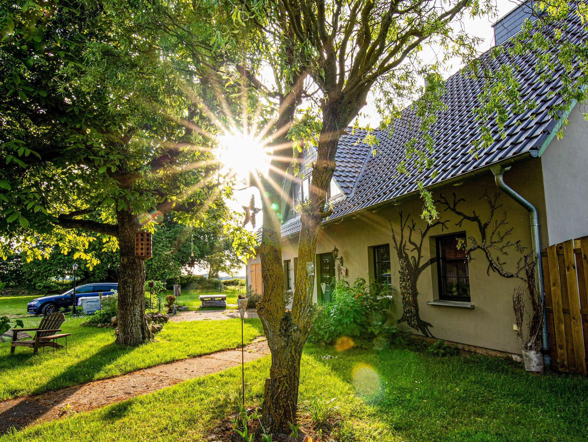 Die Ferienwohnung liegt auf einem großen, weitläufigen Grundstück, wo du den vorderen Teil mitnutzen kannst. Es gibt eine Terrasse, auf der du entspannte Stunden im Freien verbringen kannst, sowie einen Grill für gemütliche Grillabende. Für deine Strandtücher kannst du den Wäscheständer nutzen, damit sie für ihren nächsten Einsatz schnell wieder bereit sind.