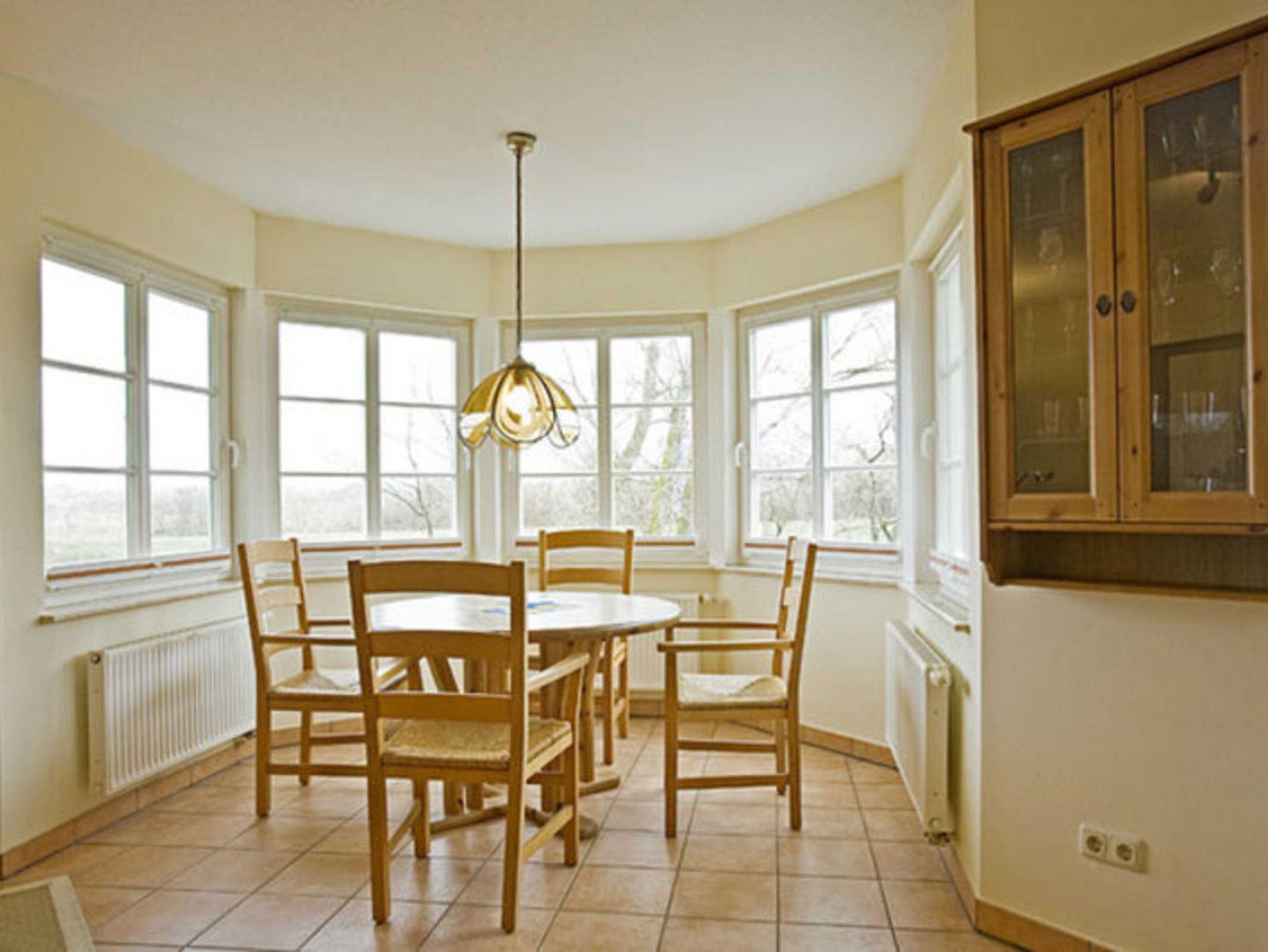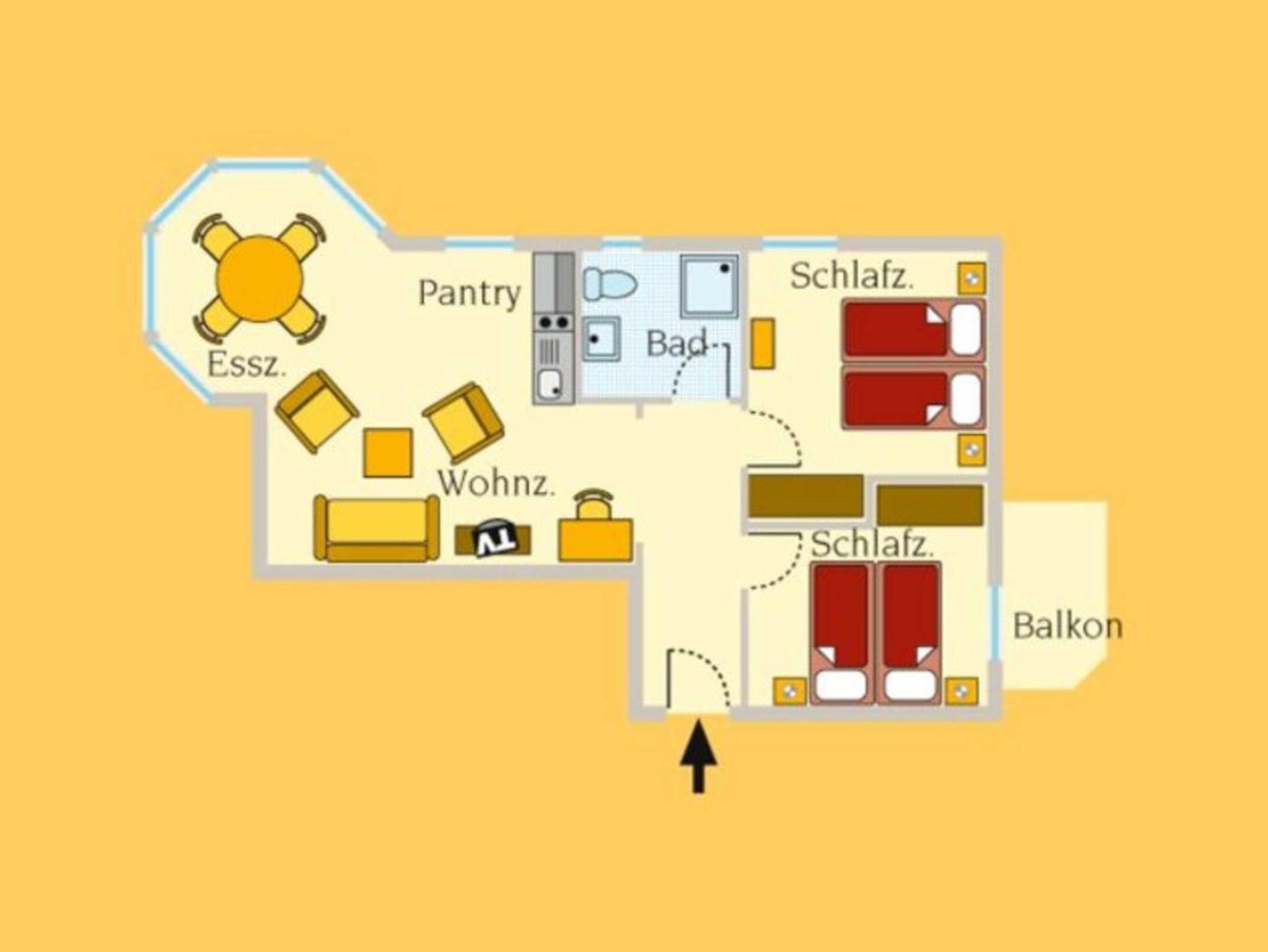 Die Wohnung Max für 4 Personen im Erdgeschoss ist geprägt von dem runden Esstisch im Erkerturm. Die Morgen- und Abendsonne geben diesem Wohnzimmer mit TV und Radio/CD-Spieler und der Küchenzeile den besonderen Reiz. Eines der zwei Schlafzimmer (je 2 Betten) hat einen kleinen Südbalkon mit Tisch und Stühlen auf der Seite des Hauseinganges. Das Bad hat ein kleines Fenster und ist mit einer Dusche ausgestattet.