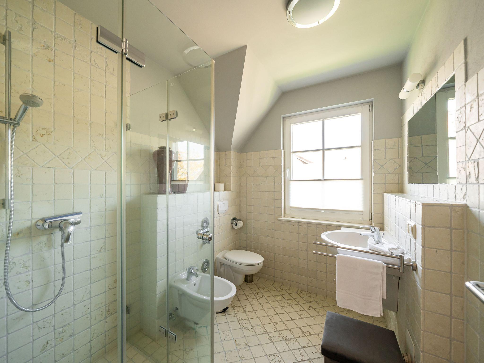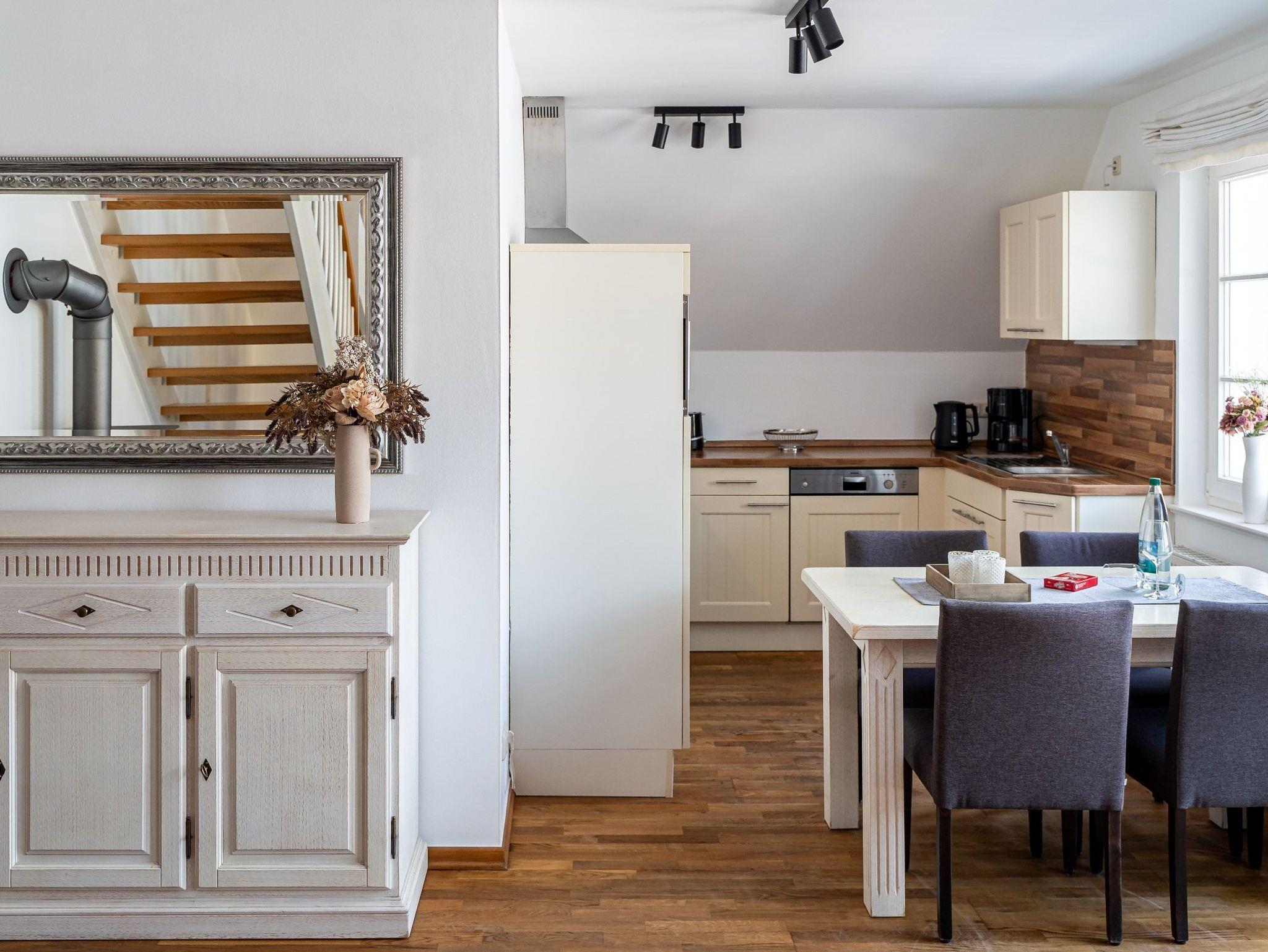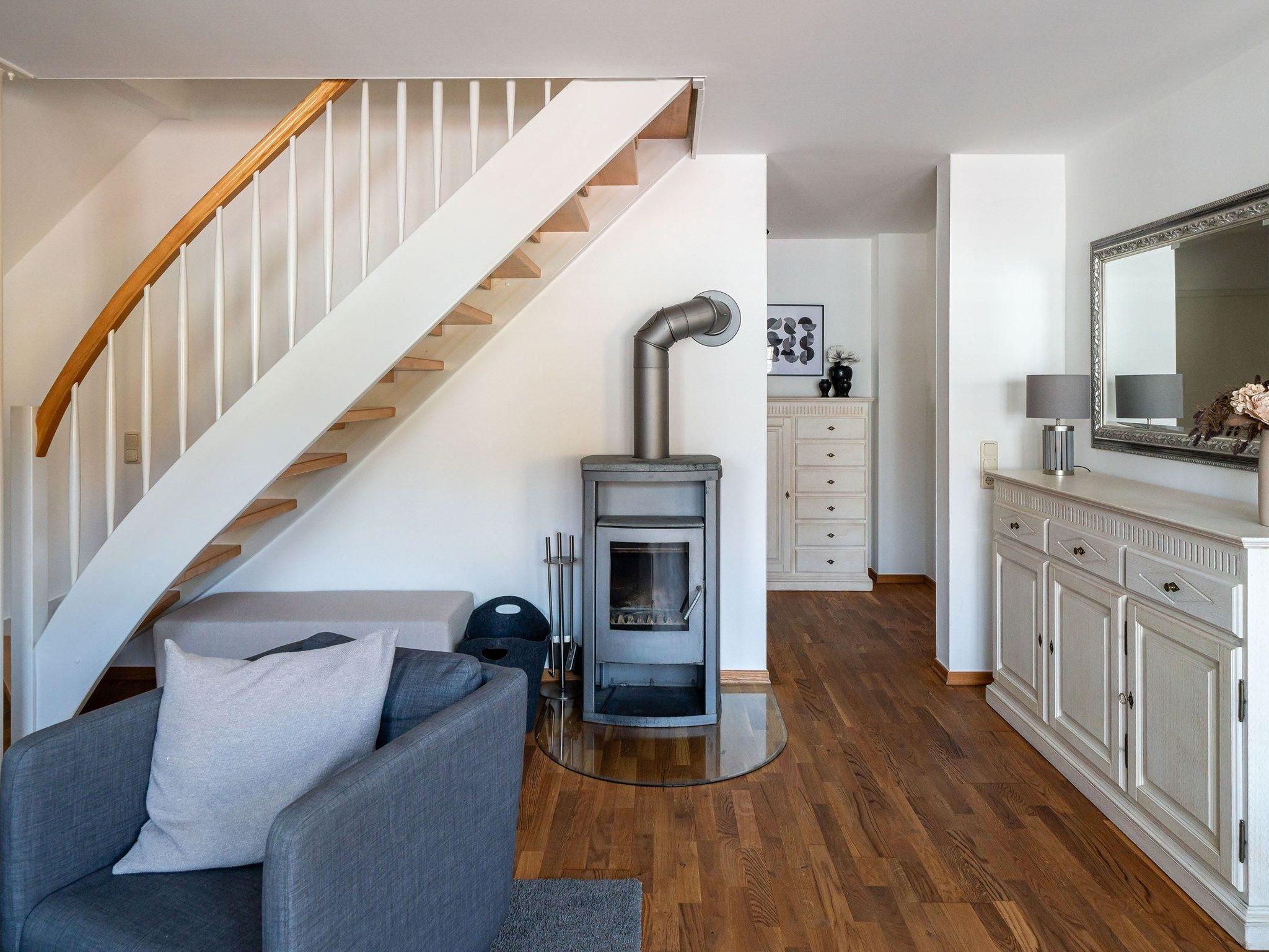 Einen Katzensprung entfernt zur Ostsee können Sie den Abend bei schönem Sonnenuntergang und einem Glas Wein auf dem Balkon (zur Straßenseite) ausklingen lassen. Das gesamte Ambiente der Wohnung ist hell und freundlich und wurde hochwertig und geschmackvoll eingerichtet. Die Küchenzeile ist mit einem Geschirrspüler, Mikrowelle sowie einem Herd mit Backofen ausgestattet. Die Wohnung verfügt eine TV-Sat-Anlage. Außerdem können Sie wohlige Gemütlichkeit am Kaminofen im Wohnbereich genießen. 2 - 4 Personen finden in dieser Wohnung statt. Es gibt zwei Schlafzimmer mit Doppelbett und zwei Bäder. Im Obergeschoss befindet sich ein Schlafzimmer mit Doppelbett sowie einem Badezimmer mit Dusche / WC. Im Dachgeschoss befindet sich das zweite Schlafzimmer mit Doppelbett sowie einem Badezimmer mit Badewanne / WC.
