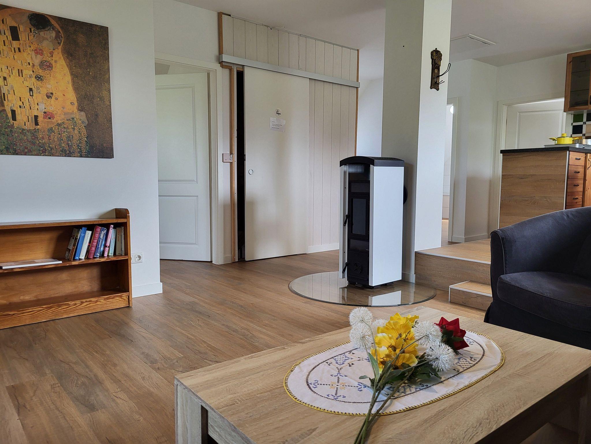 Die Terrasse am Haus lädt zum gemeinsamen Frühstück oder am Abend zu einem gemütlichen Glas Wein ein.Die Ferienwohnung liegt im Obergeschoss mit 90 m² und ist perfekt für Familien geeignet. Das offene Wohnzimmer mit dem Kaminofen und der offenen Küchenzeile lädt zum gemeinsamen kochen ein. Das Schlafzimmer verfügt über 1 Doppelbett 1,80 x 2,00 m. Im Kinderzimmer befindet sich ein Doppelbett 1,80 x 2,00 m (getrennte Matratzen) Das großzügige Bad ist mit einer Badewanne und Dusche/WC ausgestattet.Fliegengaze befinden sich in den Schlafräumen. Die Ferienwohnung ist eine Nichtraucherwohnung. Die Wohnung wird inclusive Bettwäsche übergeben, Handtücher können in der Zimmervermittlung für 7,00 € pro Person (1 Badetuch, 1 Handtuch) dazugebucht werden. Zur Wohnung gehört ein Parkplatz auf dem Grundstück. Den Kaminofen bitte nur mit Kaminholz beheizen, Kaminholz nicht vorhanden. Für ihre Fahrräder steht eine Unterstellmöglichkeit bereit. Die Vermieterin bietet im Sommer auch Keramikkurse an. Für unsere Gäste steht ein kostenloses WLAN zur Verfügung.