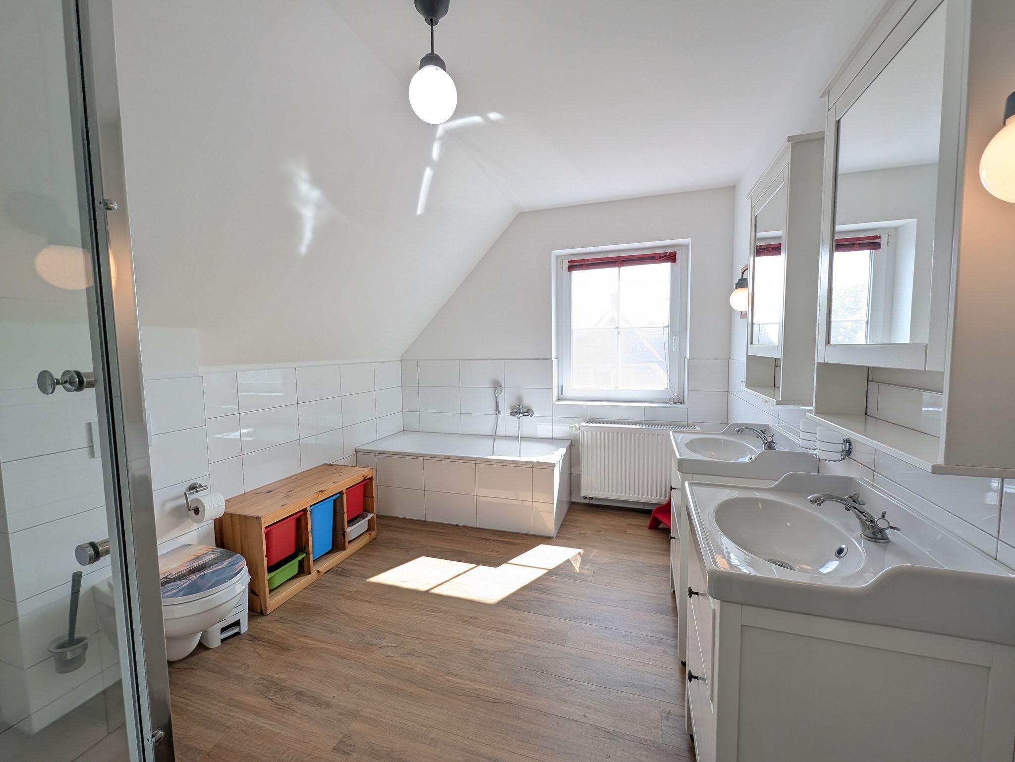 Der Sitzbereich am Haus lädt zum gemeinsamen Frühstück oder am Abend zu einem gemütlichen Glas Wein ein.Die Ferienwohnung liegt im Obergeschoss mit 90 m² und ist perfekt für Familien geeignet. Das offene Wohnzimmer mit dem Kaminofen und der offenen Küchenzeile lädt zum gemeinsamen kochen ein. Das Schlafzimmer verfügt über 1 Doppelbett 1,80 x 2,00 m. Im Kinderzimmer befindet sich ein Doppelbett 1,80 x 2,00 m (getrennte Matratzen) Das großzügige Bad ist mit einer Badewanne und Dusche/WC ausgestattet.Fliegengaze befinden sich in den Schlafräumen. Die Ferienwohnung ist eine Nichtraucherwohnung. Die Wohnung wird inclusive Bettwäsche übergeben, Handtücher können in der Zimmervermittlung für 7,00 € pro Person (1 Badetuch, 1 Handtuch) dazugebucht werden. Zur Wohnung gehört ein Parkplatz auf dem Grundstück. Den Kaminofen bitte nur mit Kaminholz beheizen, Kaminholz nicht vorhanden. Für ihre Fahrräder steht eine Unterstellmöglichkeit bereit. Für unsere Gäste steht ein kostenloses WLAN zur Verfügung.