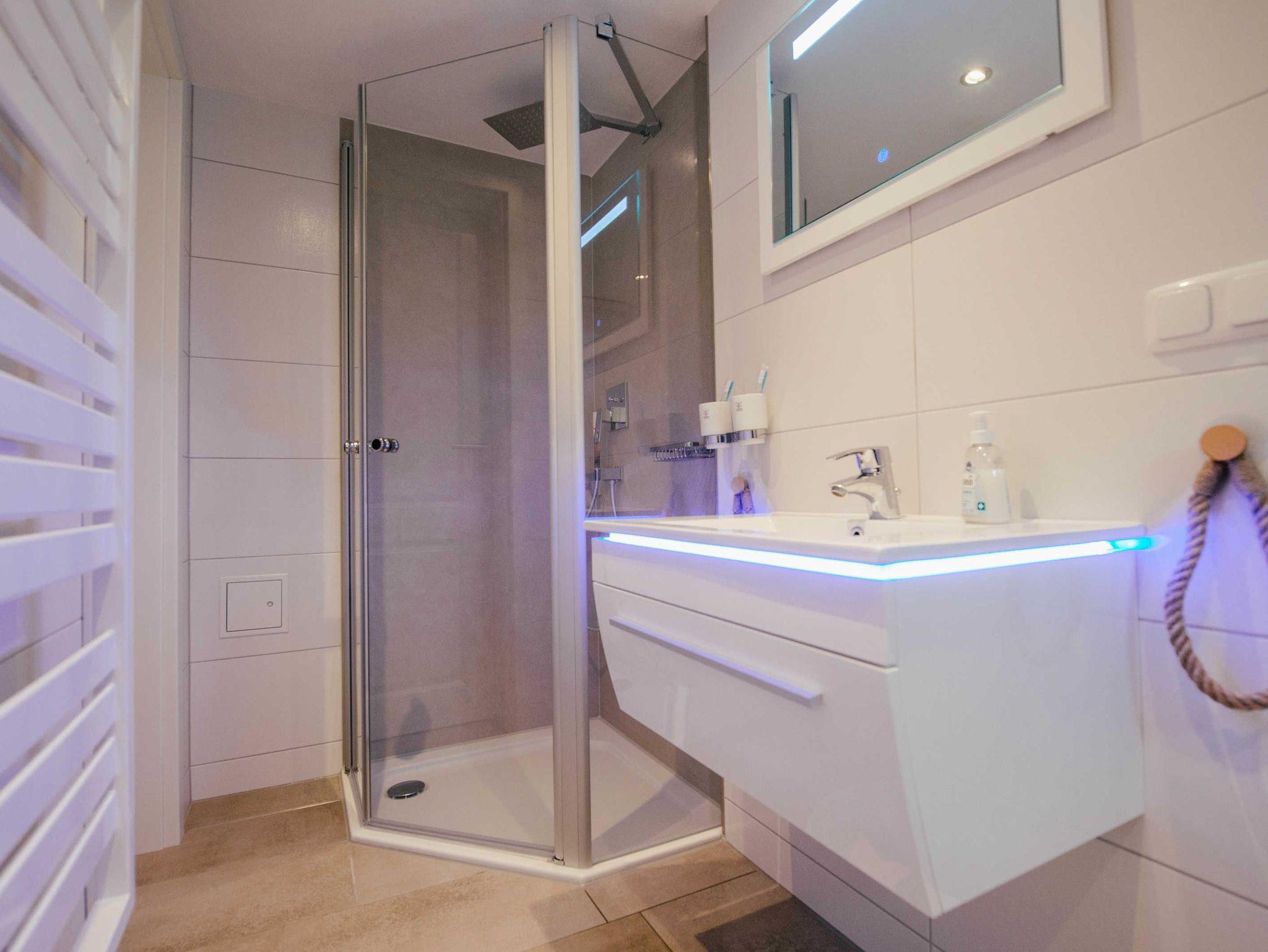 Das Badezimmer mit Dusche und WC ausgestattet.