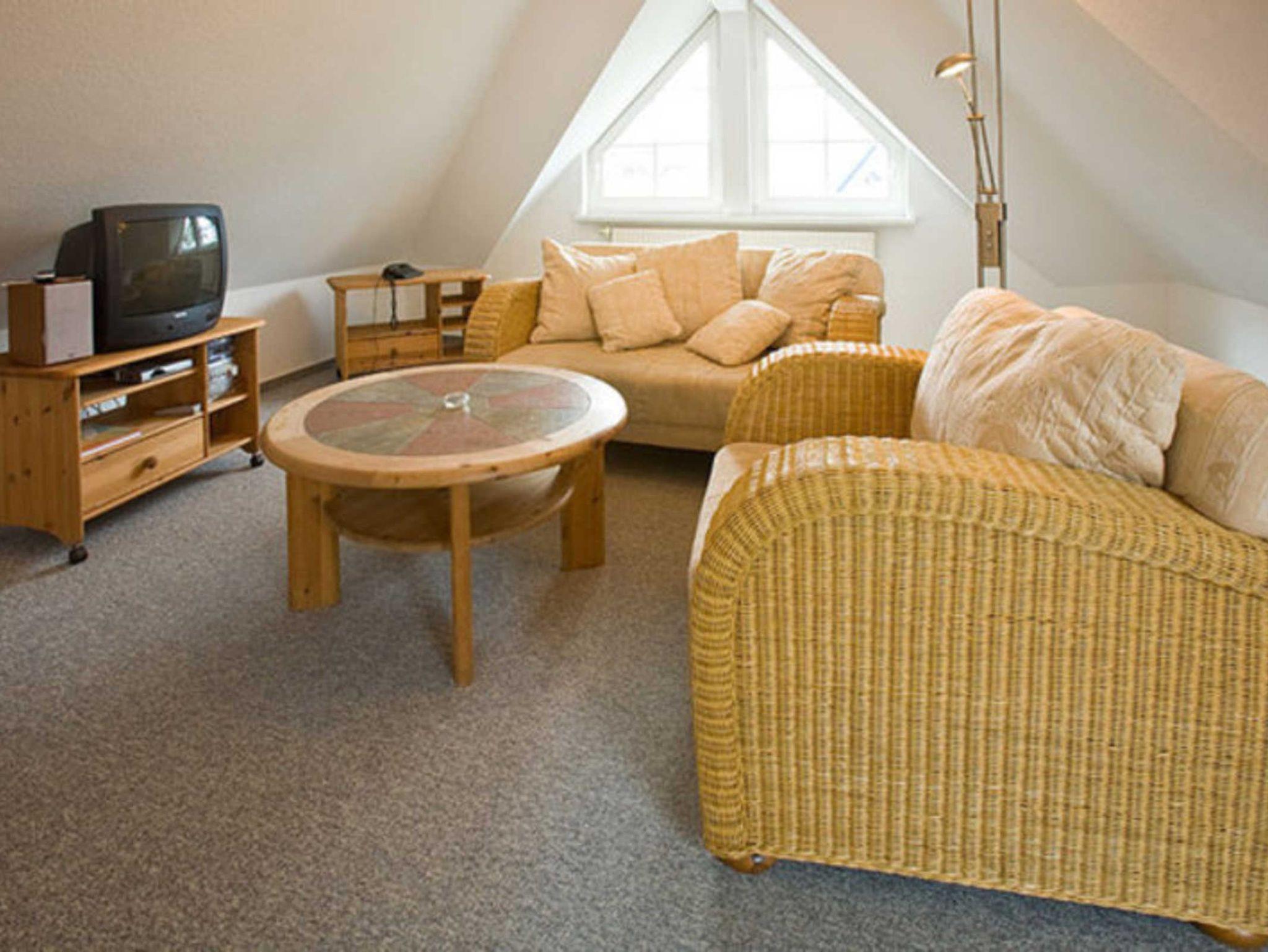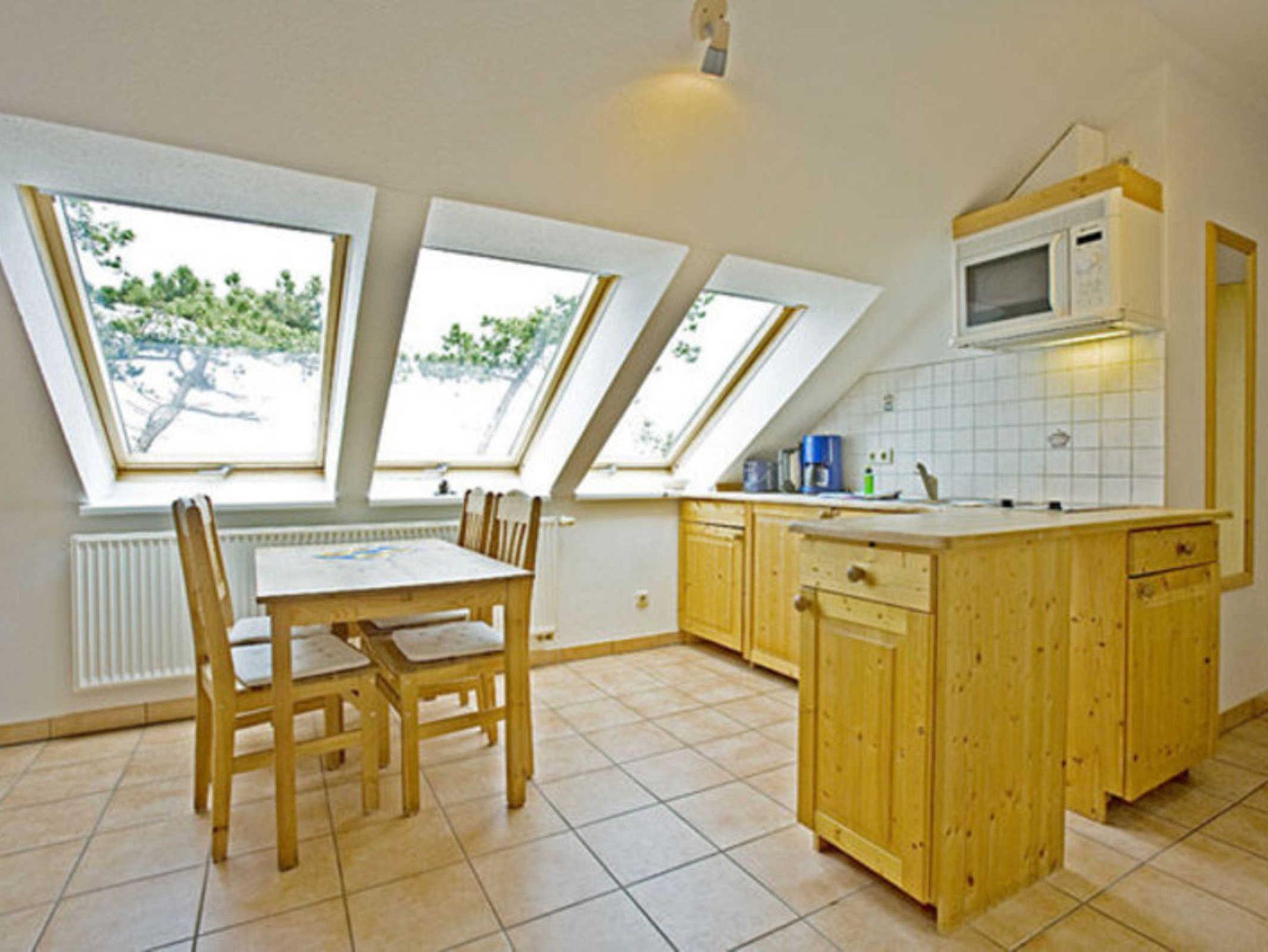 Die Wohnung Anna für 2 Personen befindet sich im langen Spitzboden des Hauses. Die Dachschrägen geben der Wohnung ein besonderes Flair. Wohnzimmer und Küche gehen ineinander über. Durch die drei großen Dachfenster über dem Essplatz können sie den weiten Blick auf die Ostsee genießen und eindrucksvolle Sonnenuntergänge erleben. Das Bad hat ein Dachfenster und eine Badewanne.